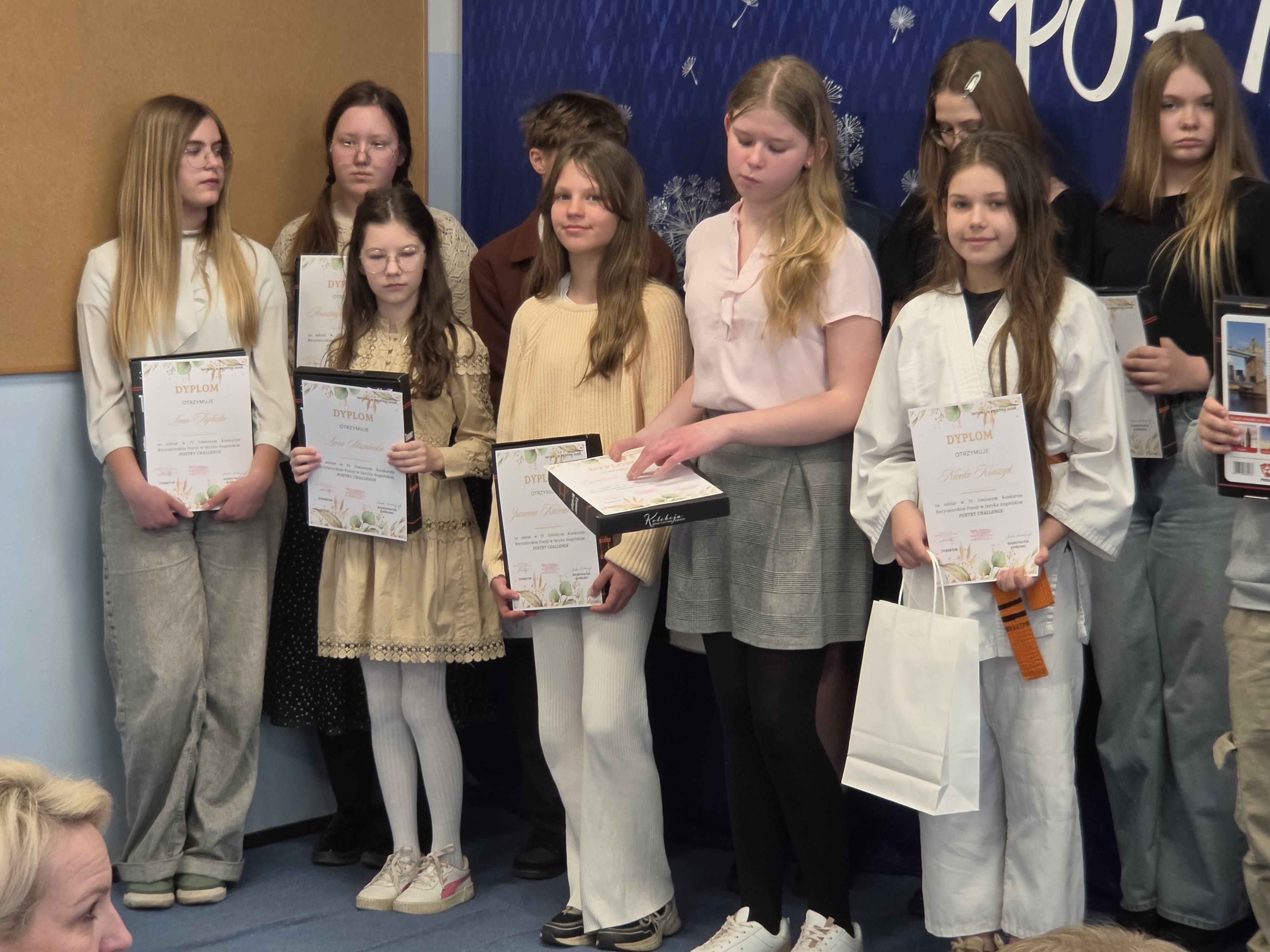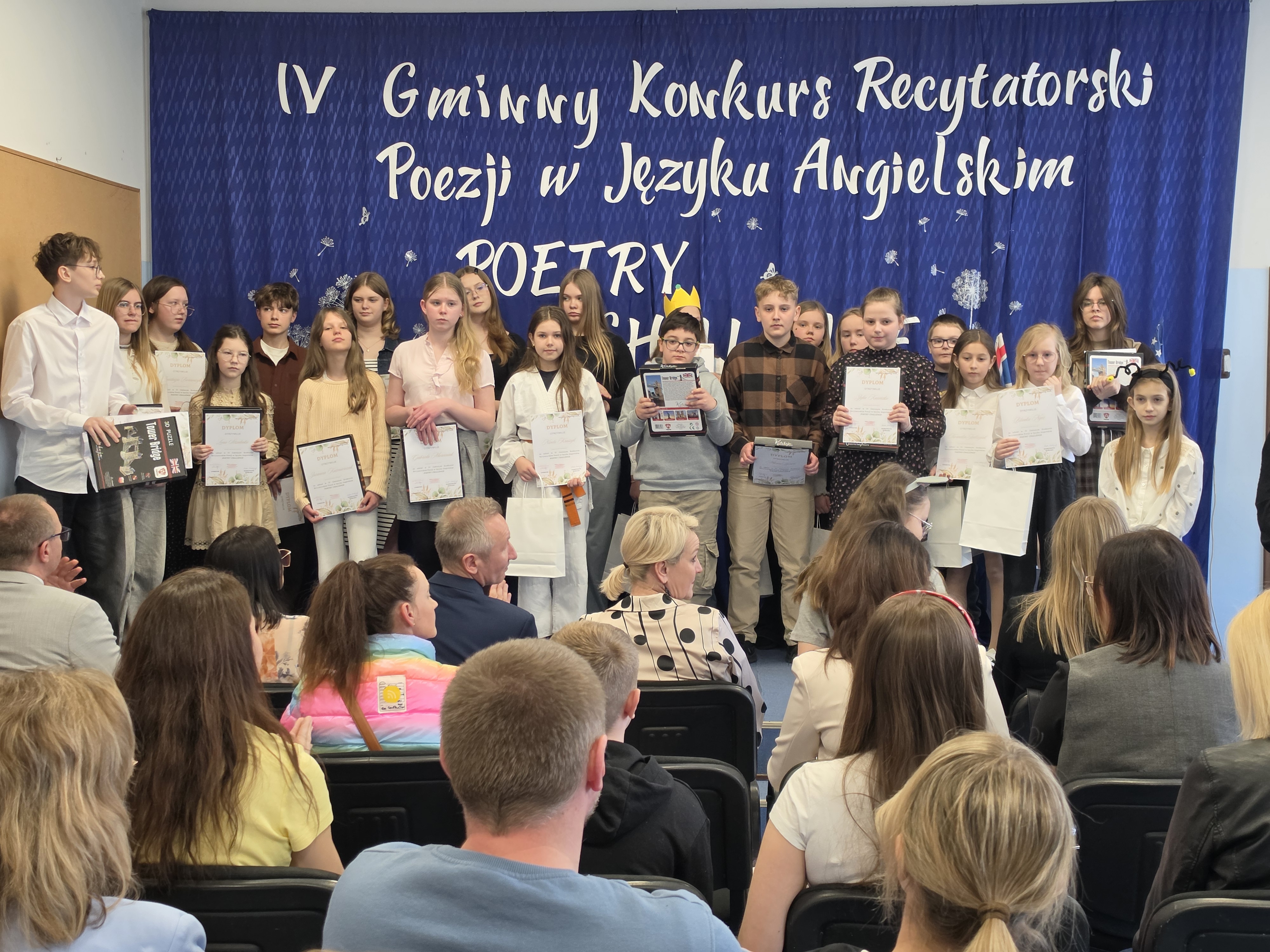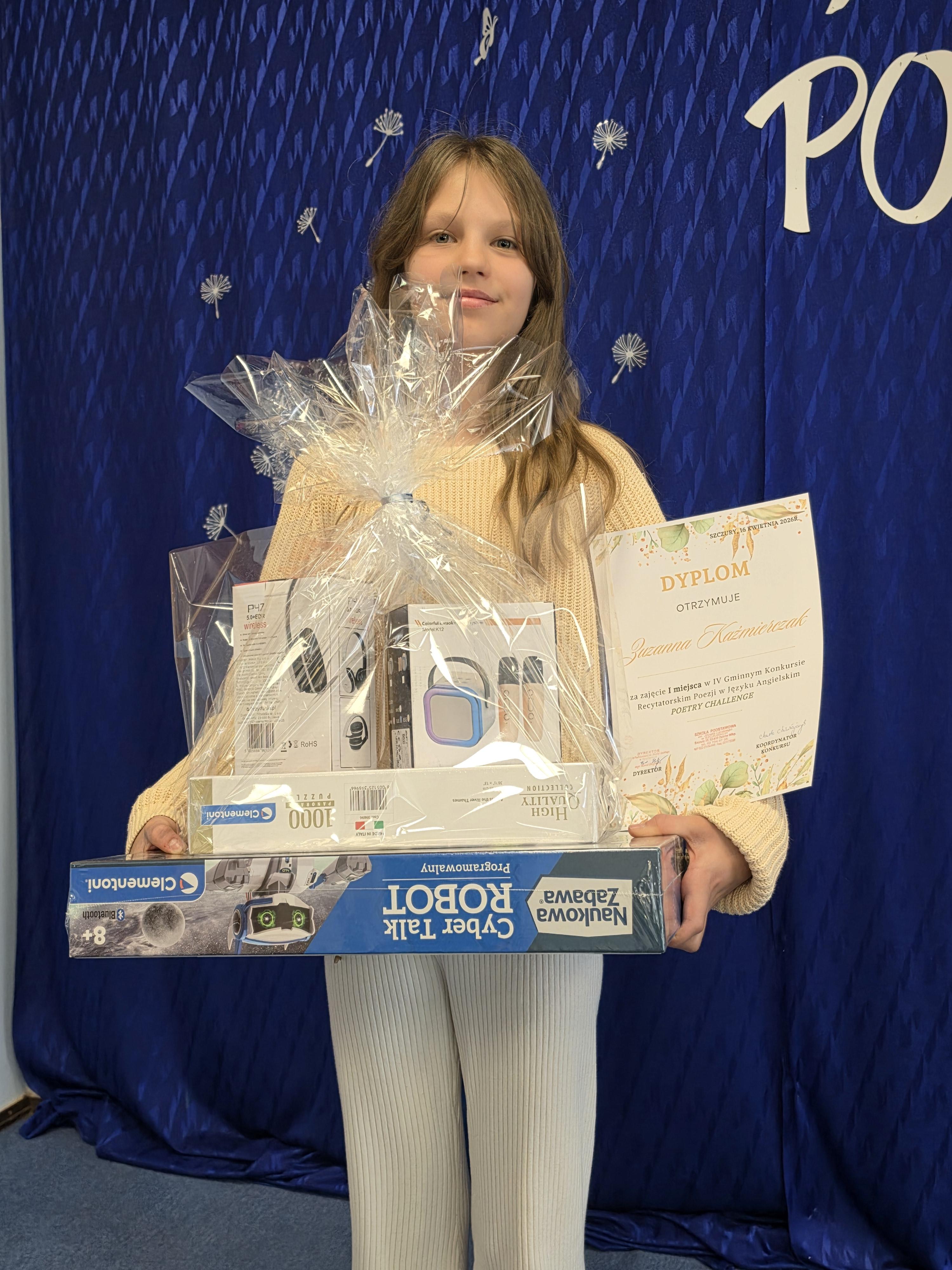 IV GMINNY KONKURS RECYTATORSKI POEZJI W JĘZYKU ANGIELSKIM "POETRY CHALLENGE" odbył się dziś  w Szkole Podstawowej im. J. Lipskiego w Szczurach. Uczniowie reprezentujący szkoły z całej gminy, recytowali wiersze w języku angielskim. Oceniany był stopień opanowania oraz trudności tekstu, wymowę oraz intonację, a także interpretację oraz wrażenia artystyczne. Naszą szkołę reprezentowały: Zuzanna Kaźmierczak, Lena Trybuła, Lena Strzelecka, Gabriela Marciniak, Nicola Kruszyk oraz Anastazja Borowczyk. Cała szóstka otrzymała dyplomy uznania. I MIEJSCE W KATEGORII KLAS 5-8 ZDOBYŁA NASZA ZUZIA KAŹMIERCZAK. Otrzymała wspaniale i zaskakujące nagrody. Jesteśmy bardzo dumni. Gratulacje dla Zuzi i pozostałych uczestniczek, które wspaniale reprezentowały dziś Naszą szkołę.