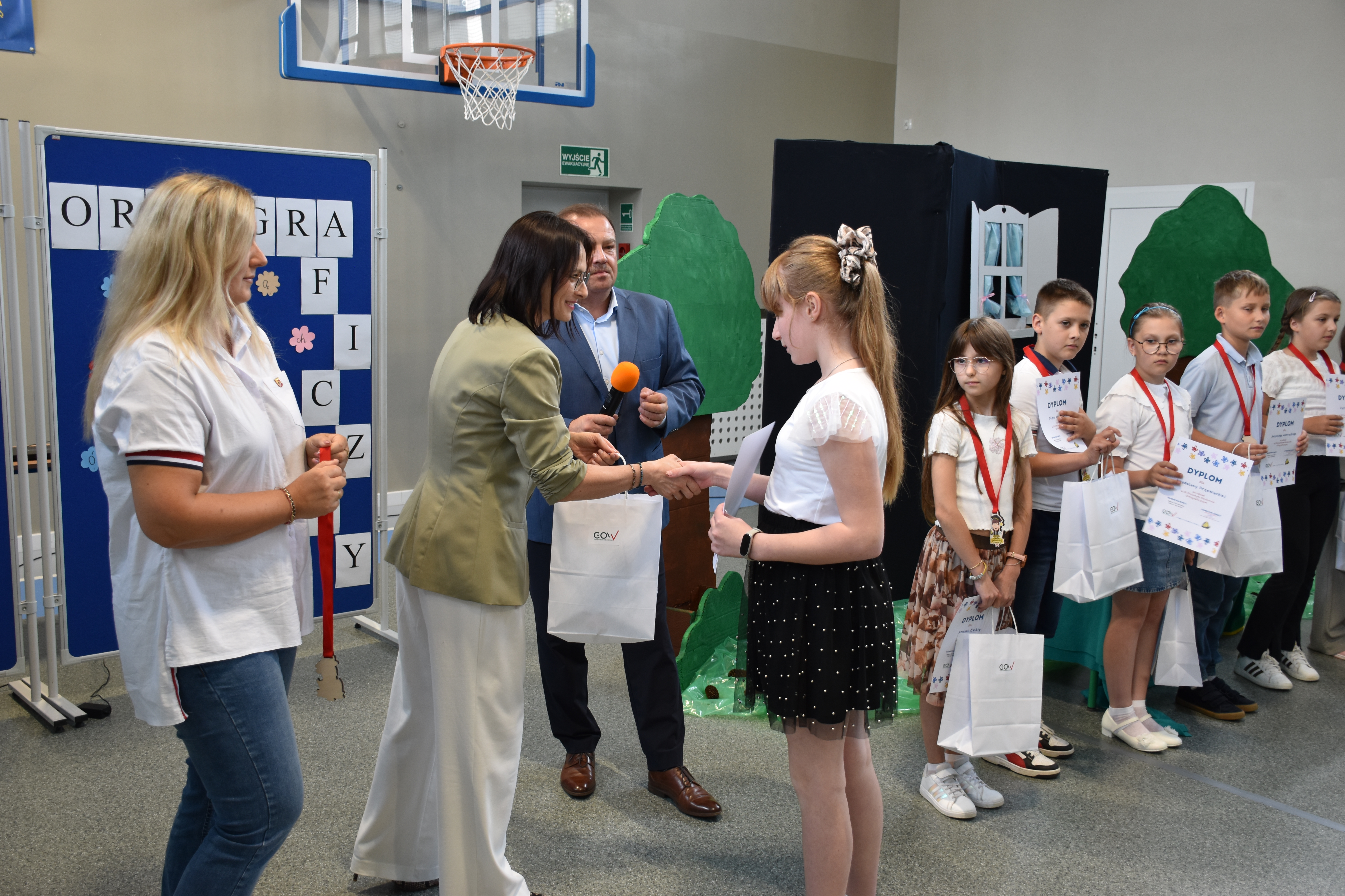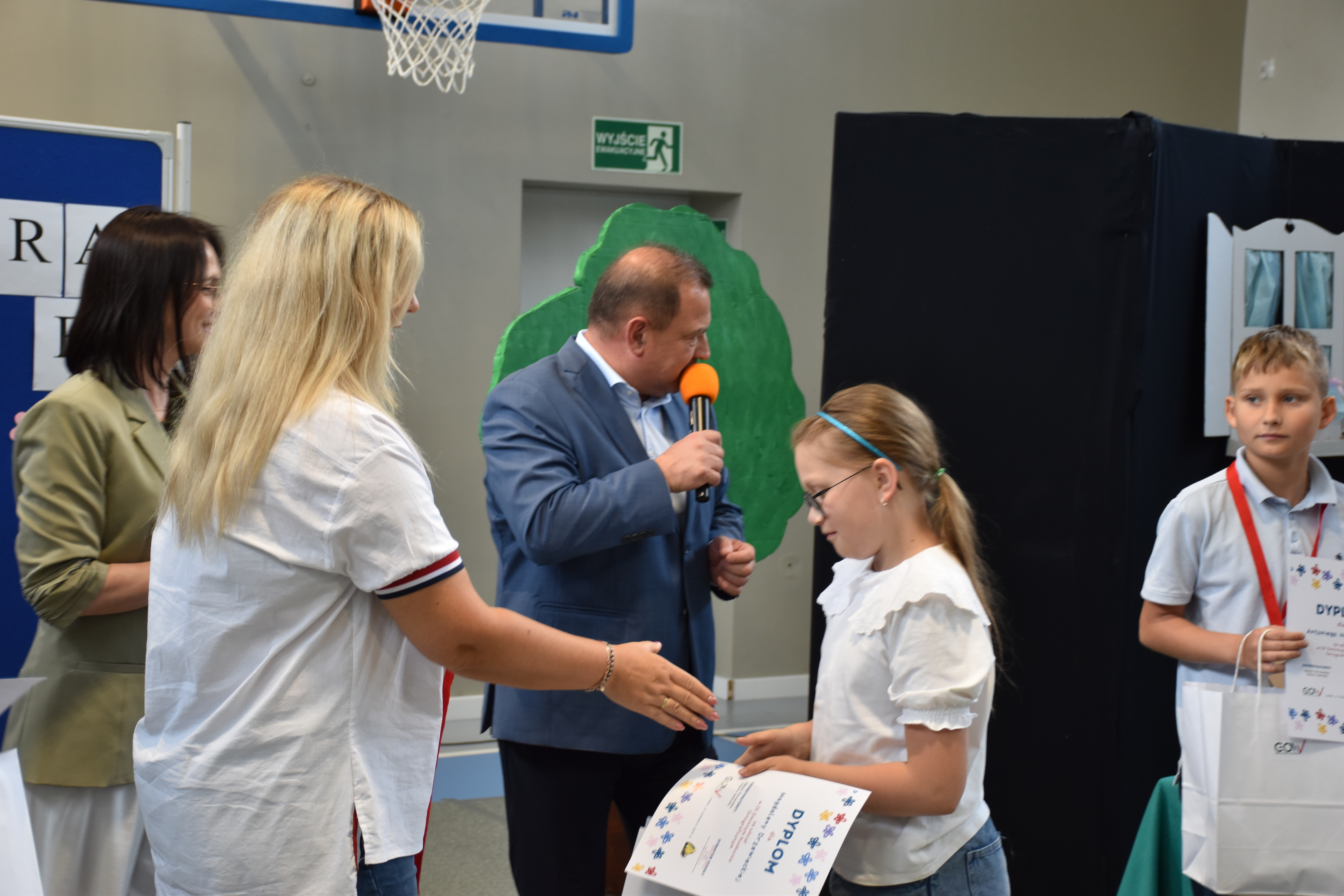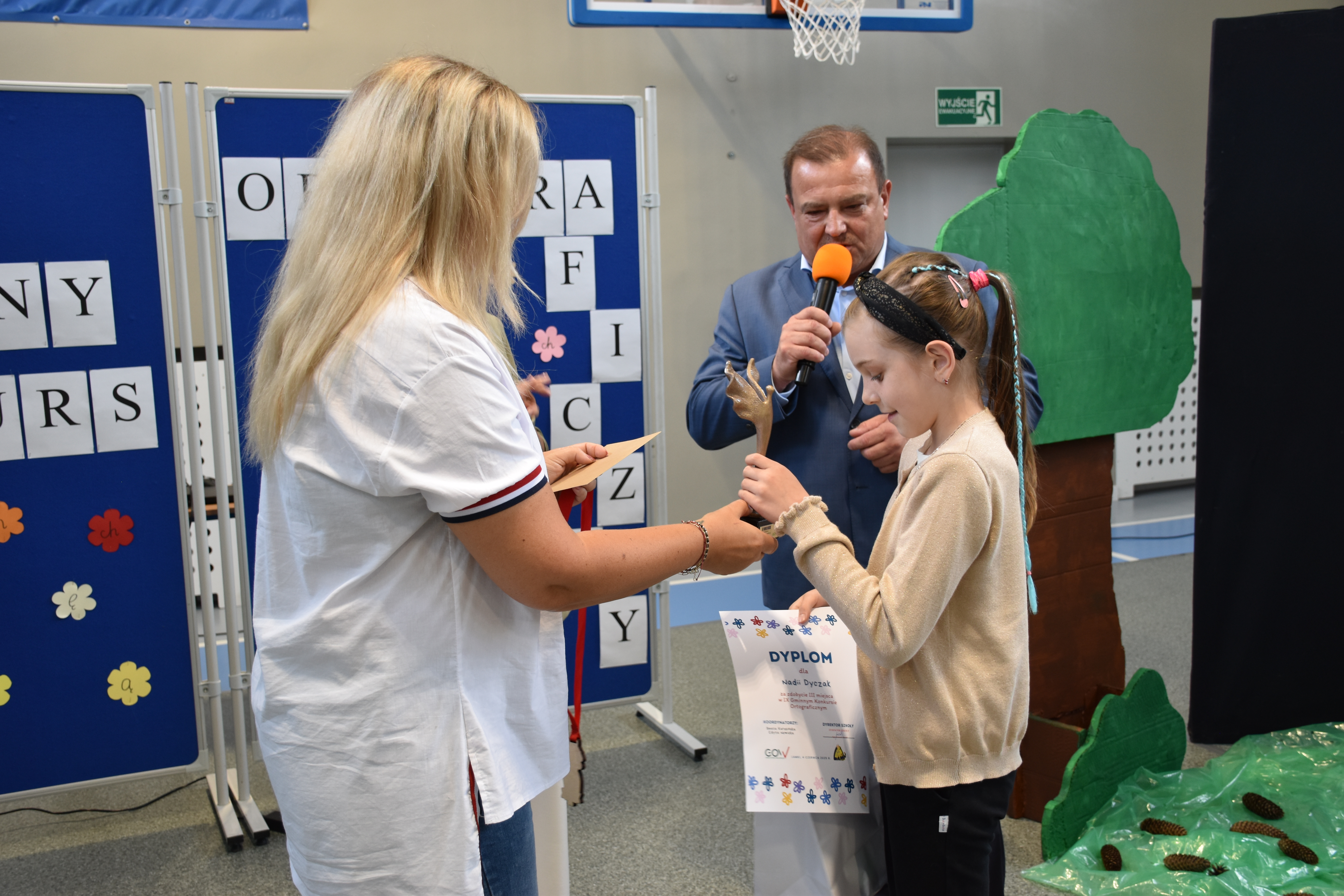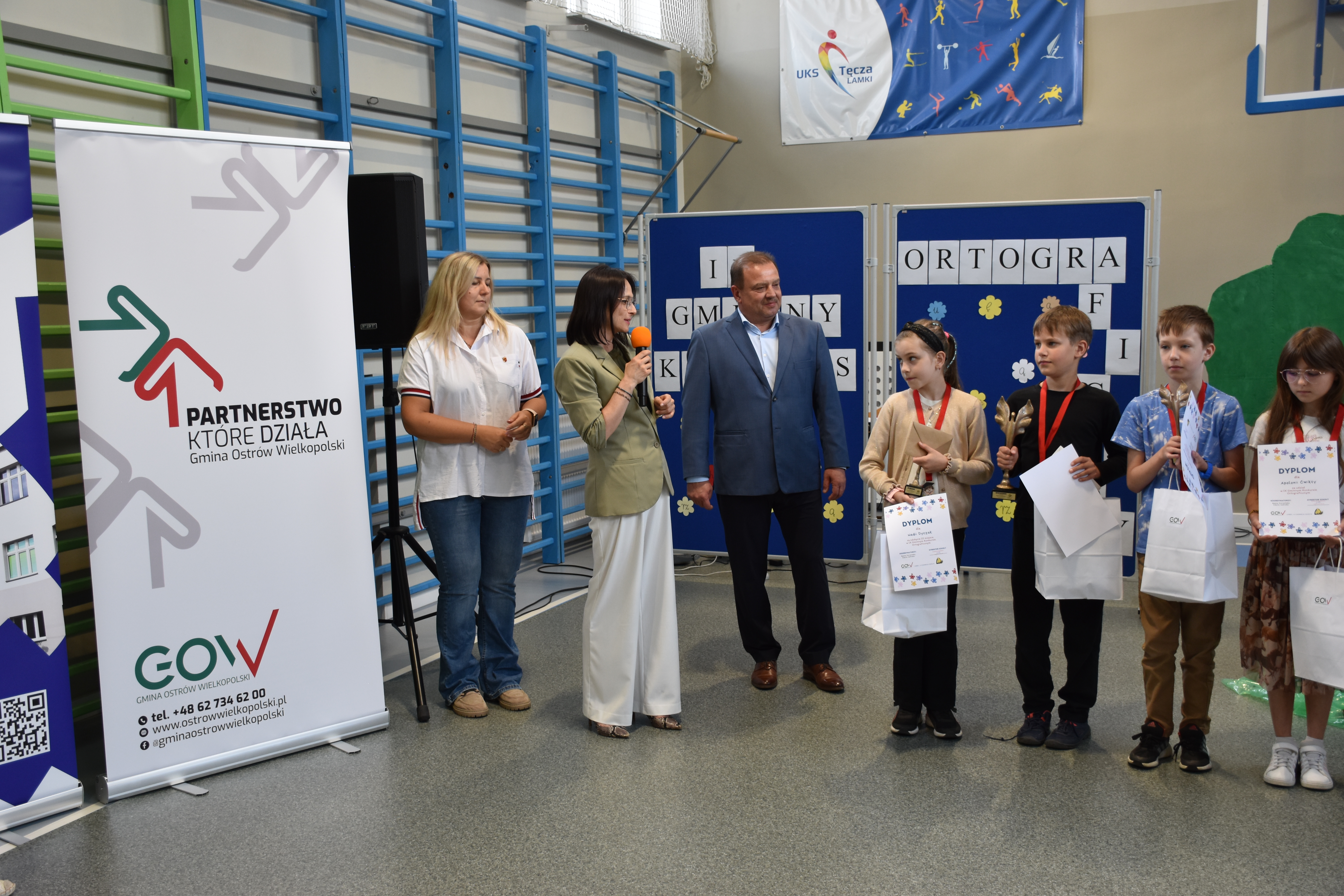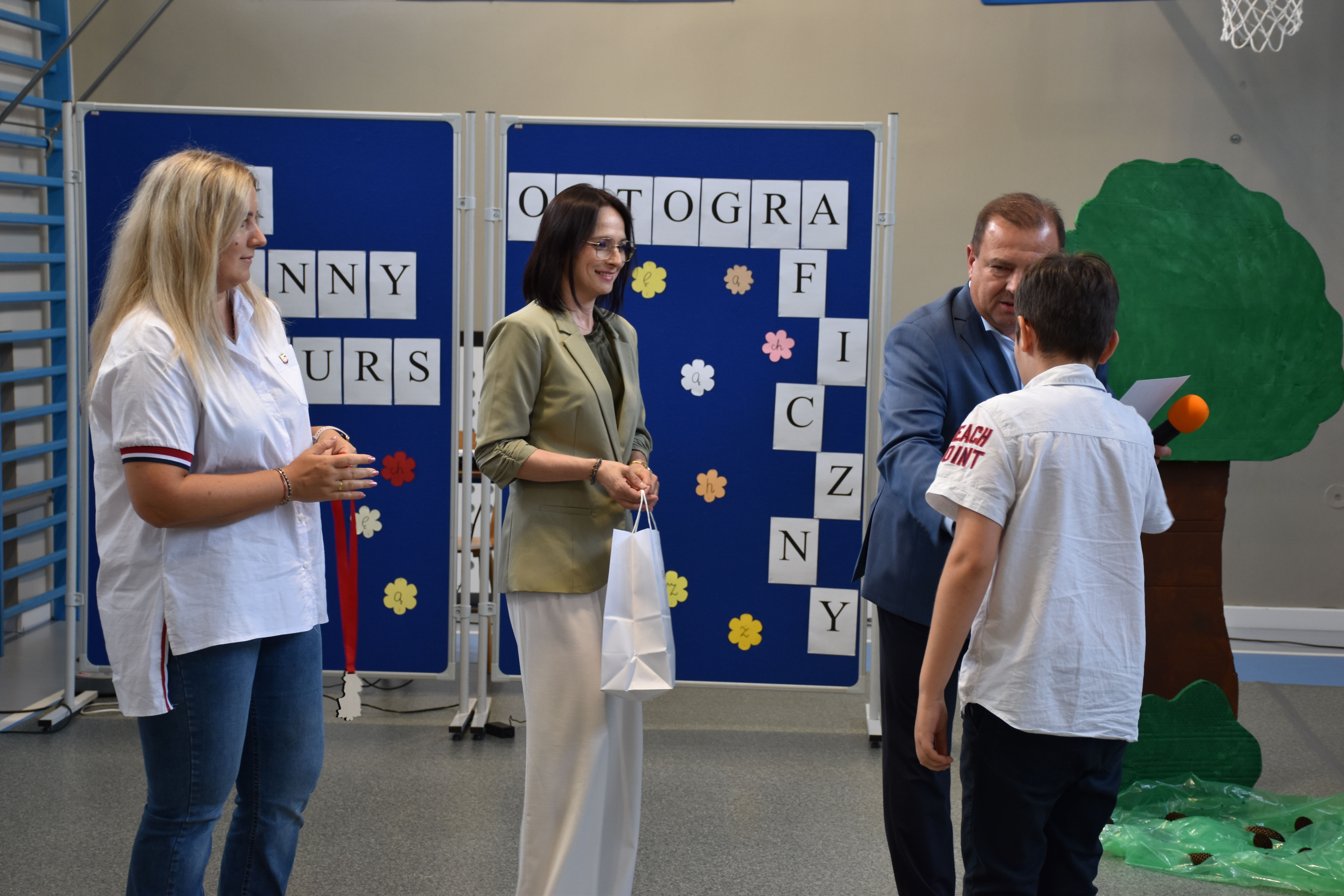 Nagrody dla finałowej trójki, dyplomy za udział w konkursie, podziękowania dla nauczycieli za przygotowanie do konkursu oraz podziękowania dla komisji sprawdzającej wręczyli, dyrektor Szkoły Podstawowej pan Tomasz Mocek, Kierownik Referatu Oświaty i Polityki Społecznej pani Aneta Kasprzak i radna Gminy Ostrów Wielkopolski pani Karolina Przytuła.