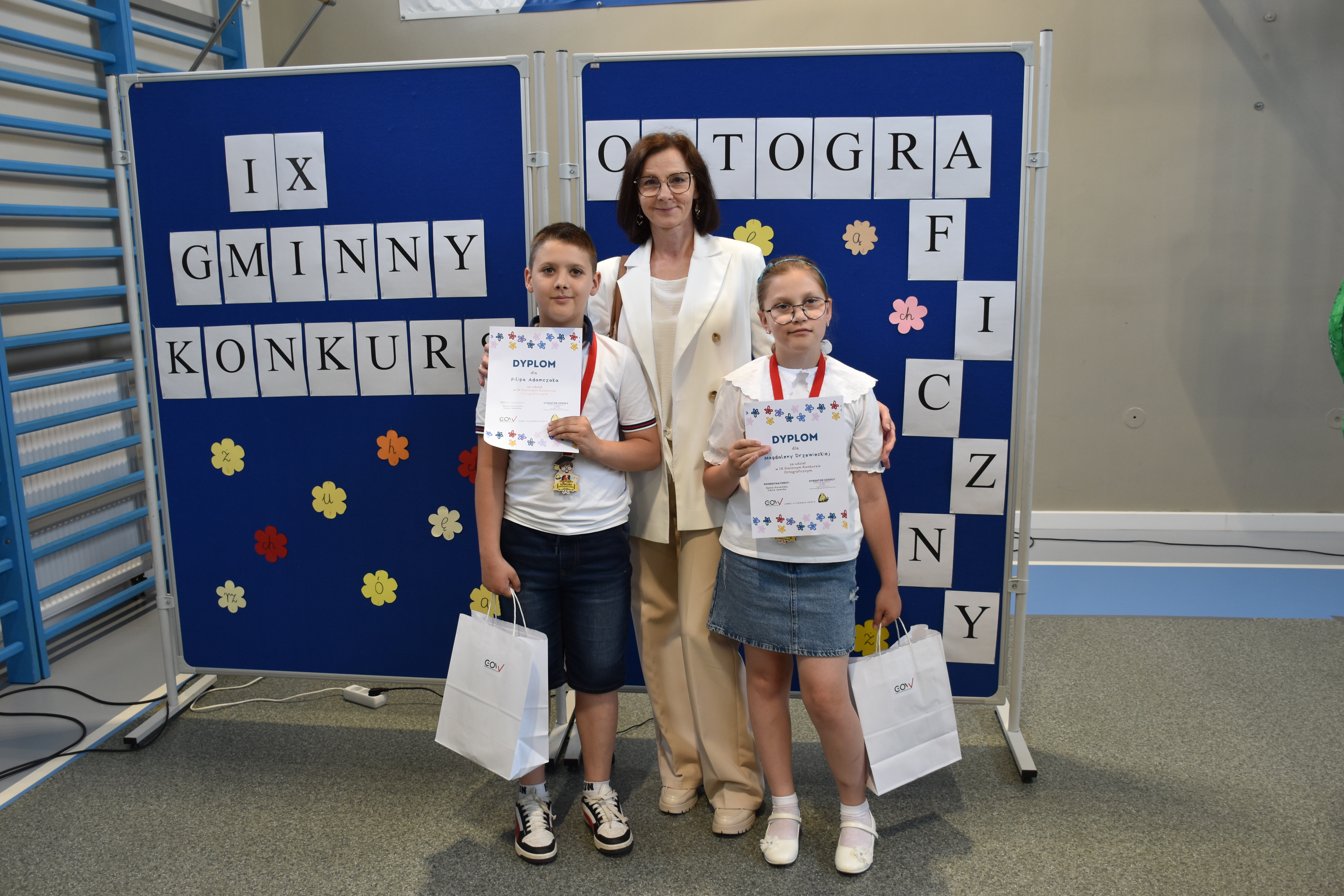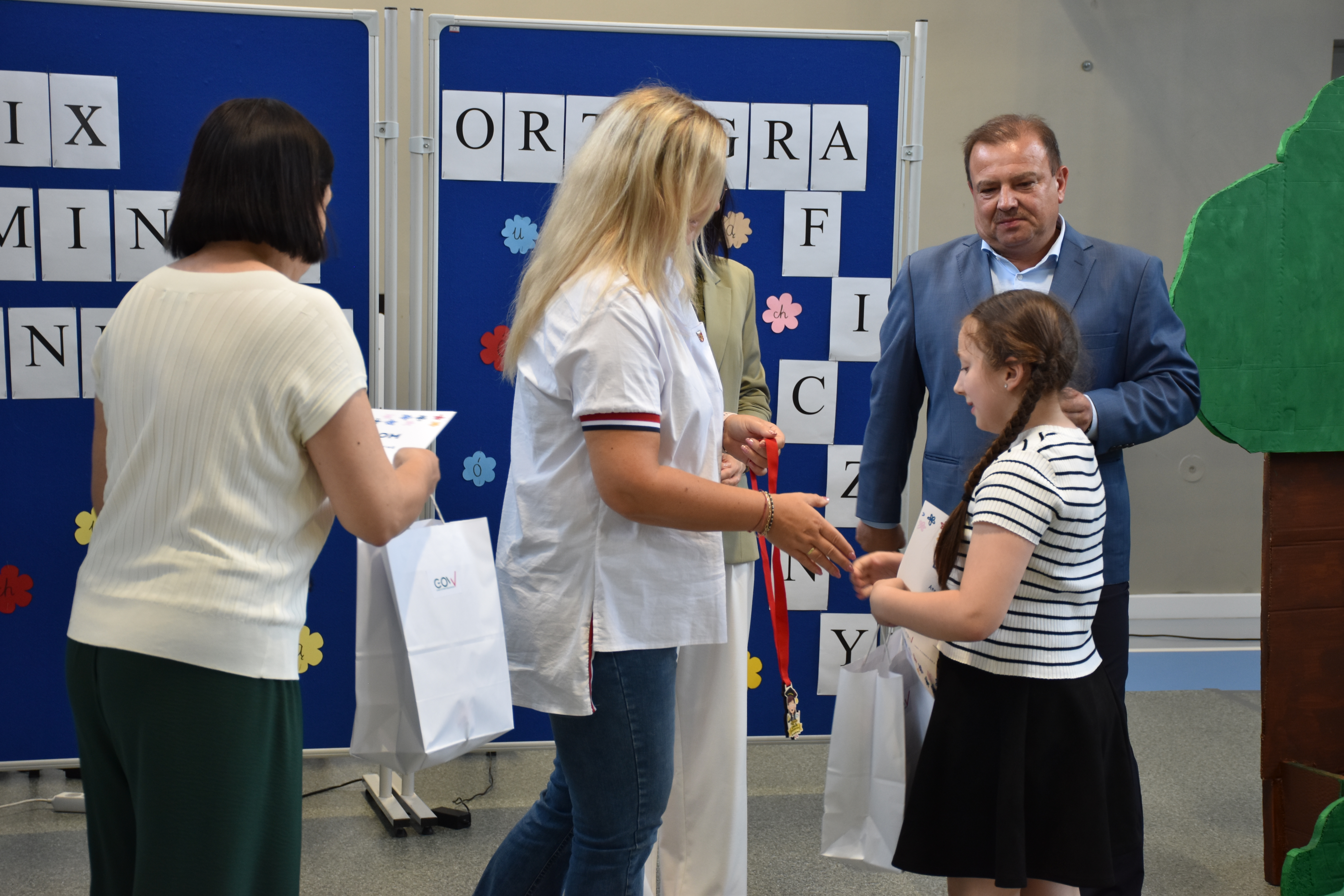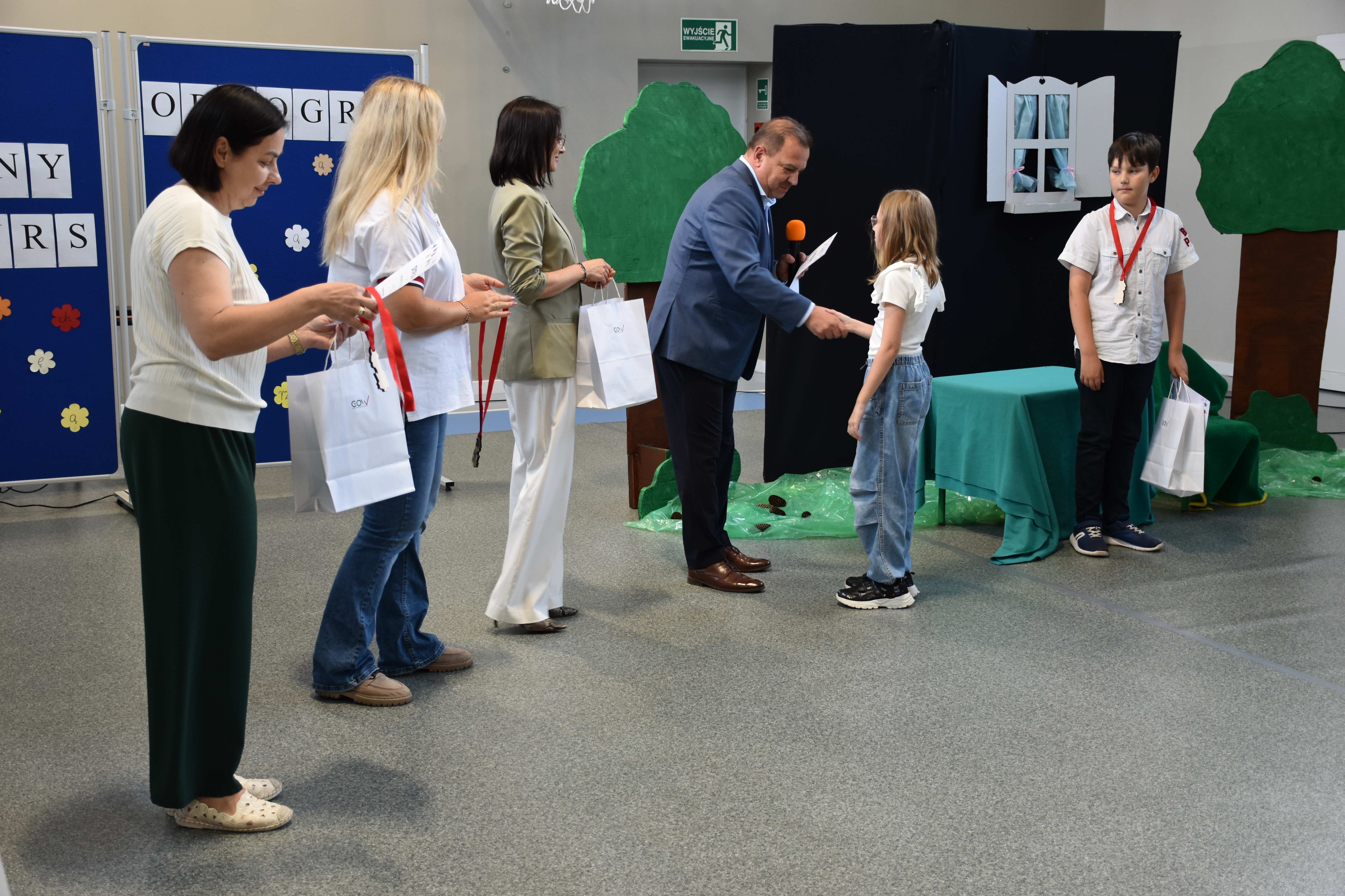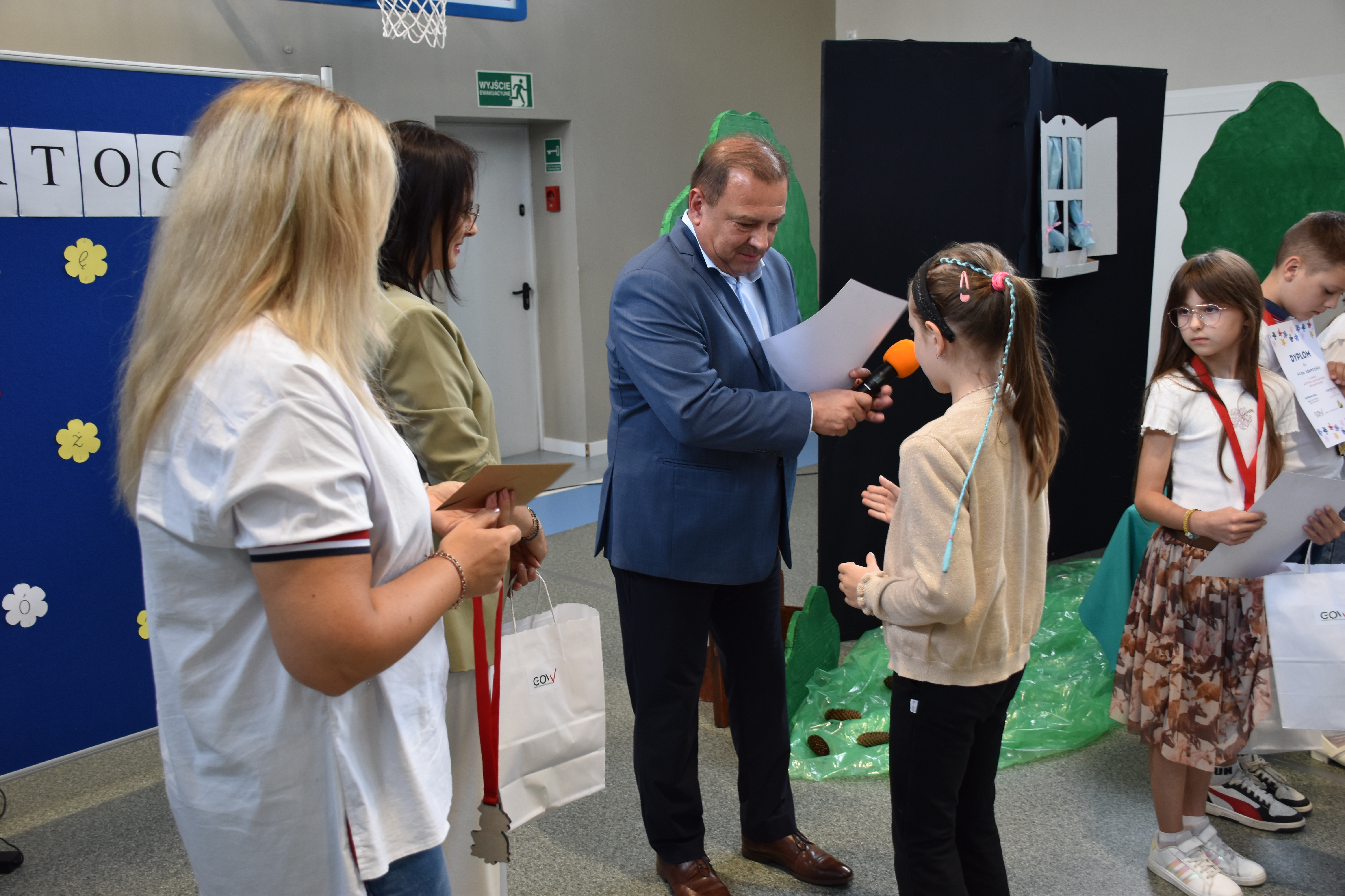 Nagrody dla finałowej trójki, dyplomy za udział w konkursie, podziękowania dla nauczycieli za przygotowanie do konkursu oraz podziękowania dla komisji sprawdzającej wręczyli, dyrektor Szkoły Podstawowej pan Tomasz Mocek, Kierownik Referatu Oświaty i Polityki Społecznej pani Aneta Kasprzak i radna Gminy Ostrów Wielkopolski pani Karolina Przytuła.