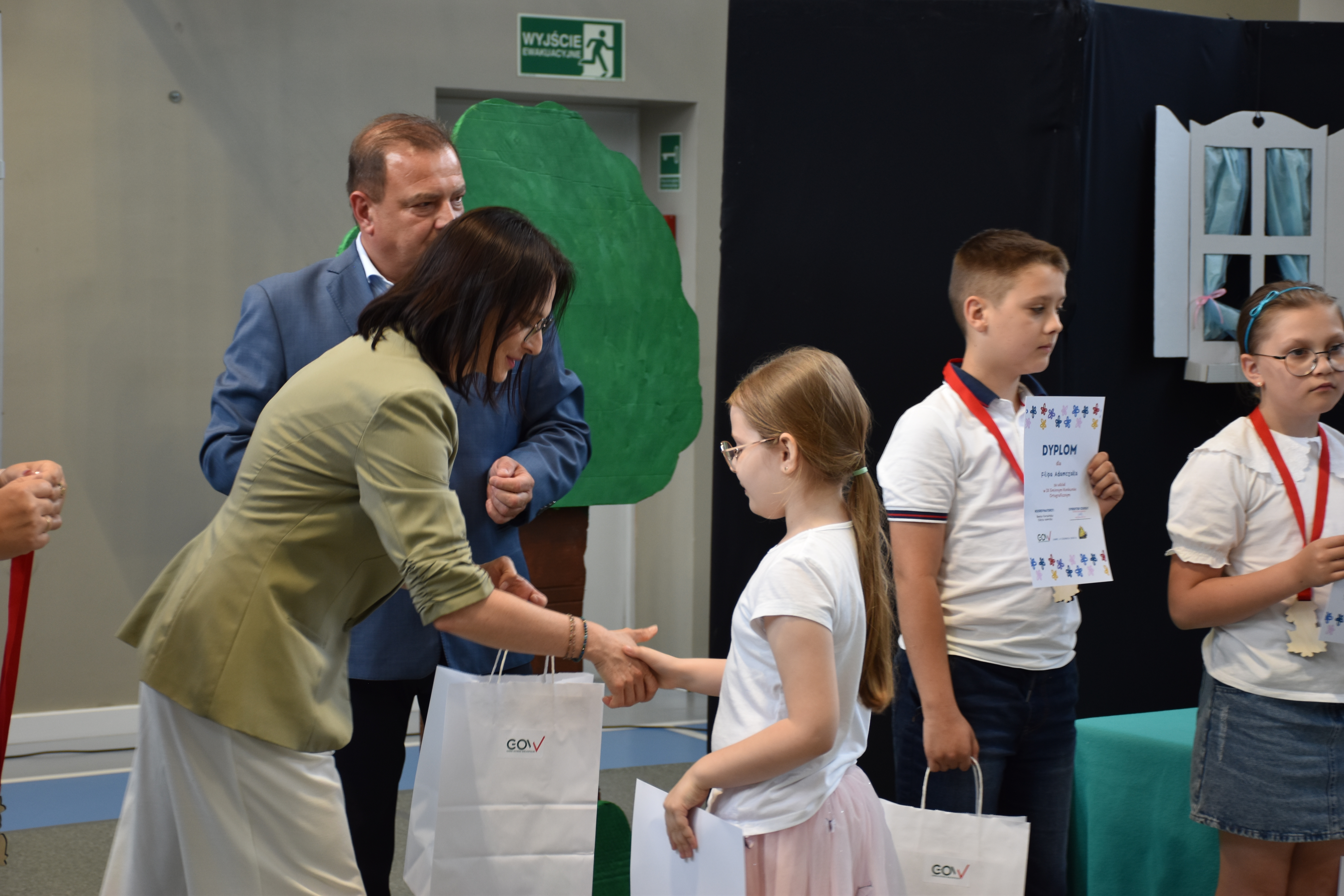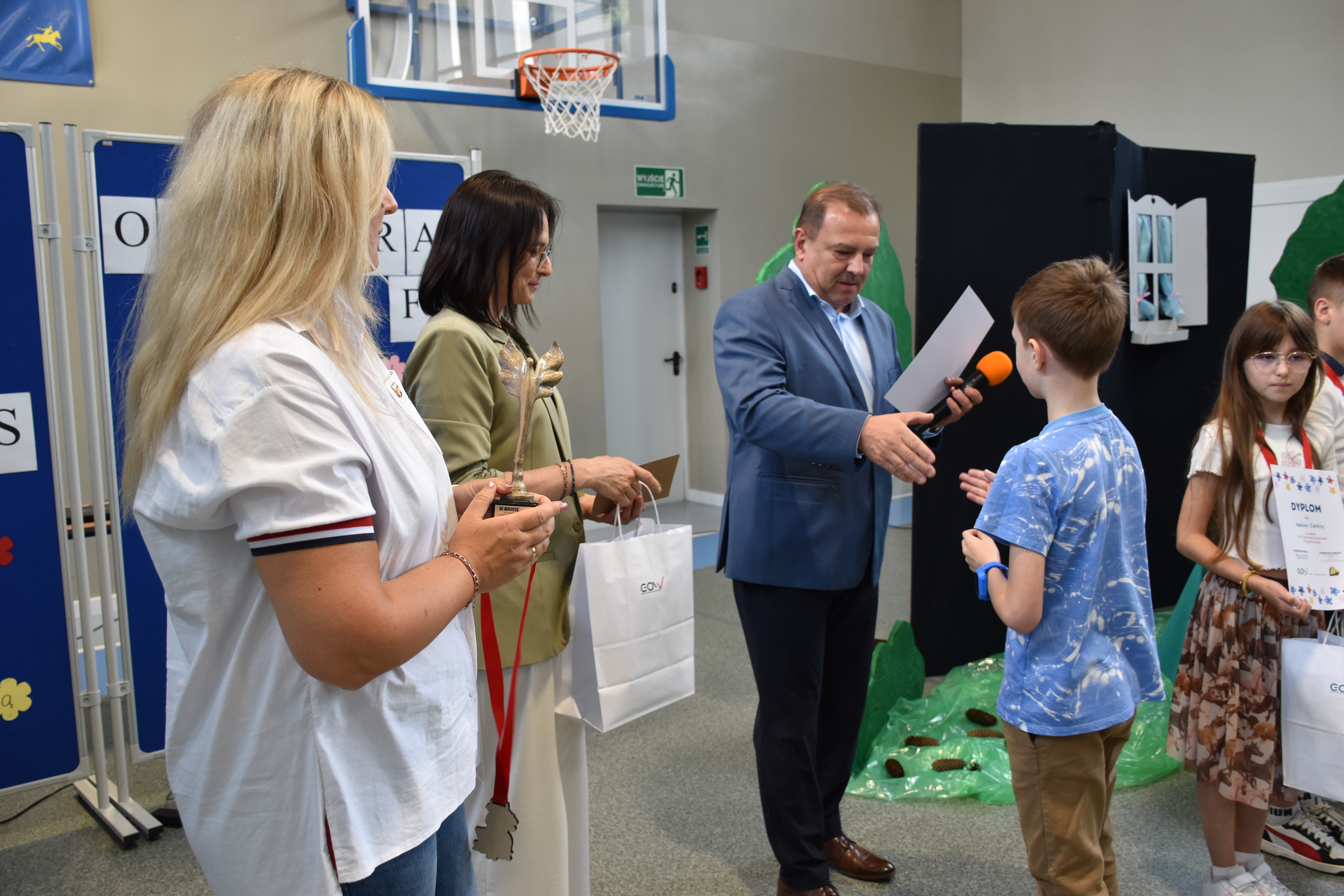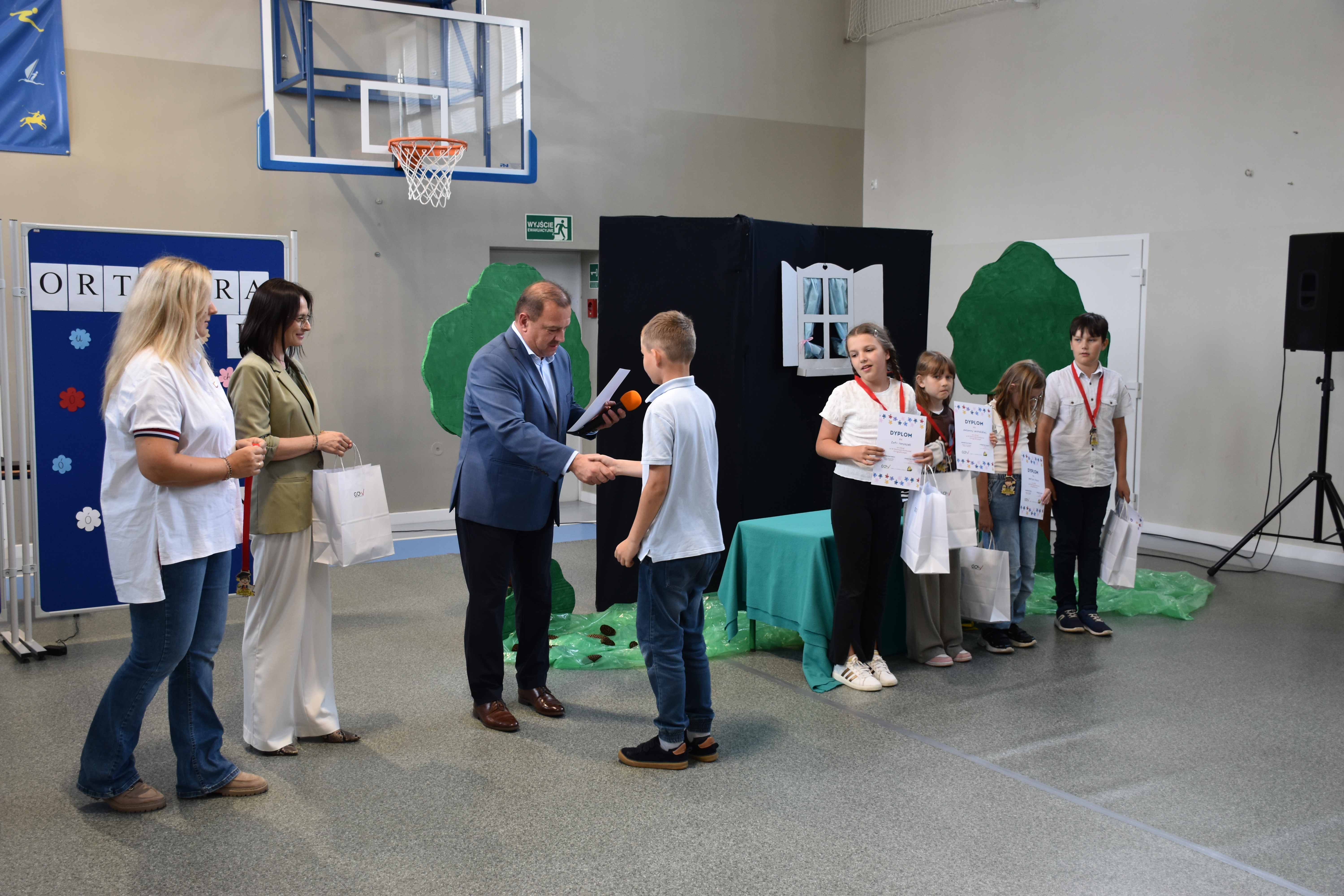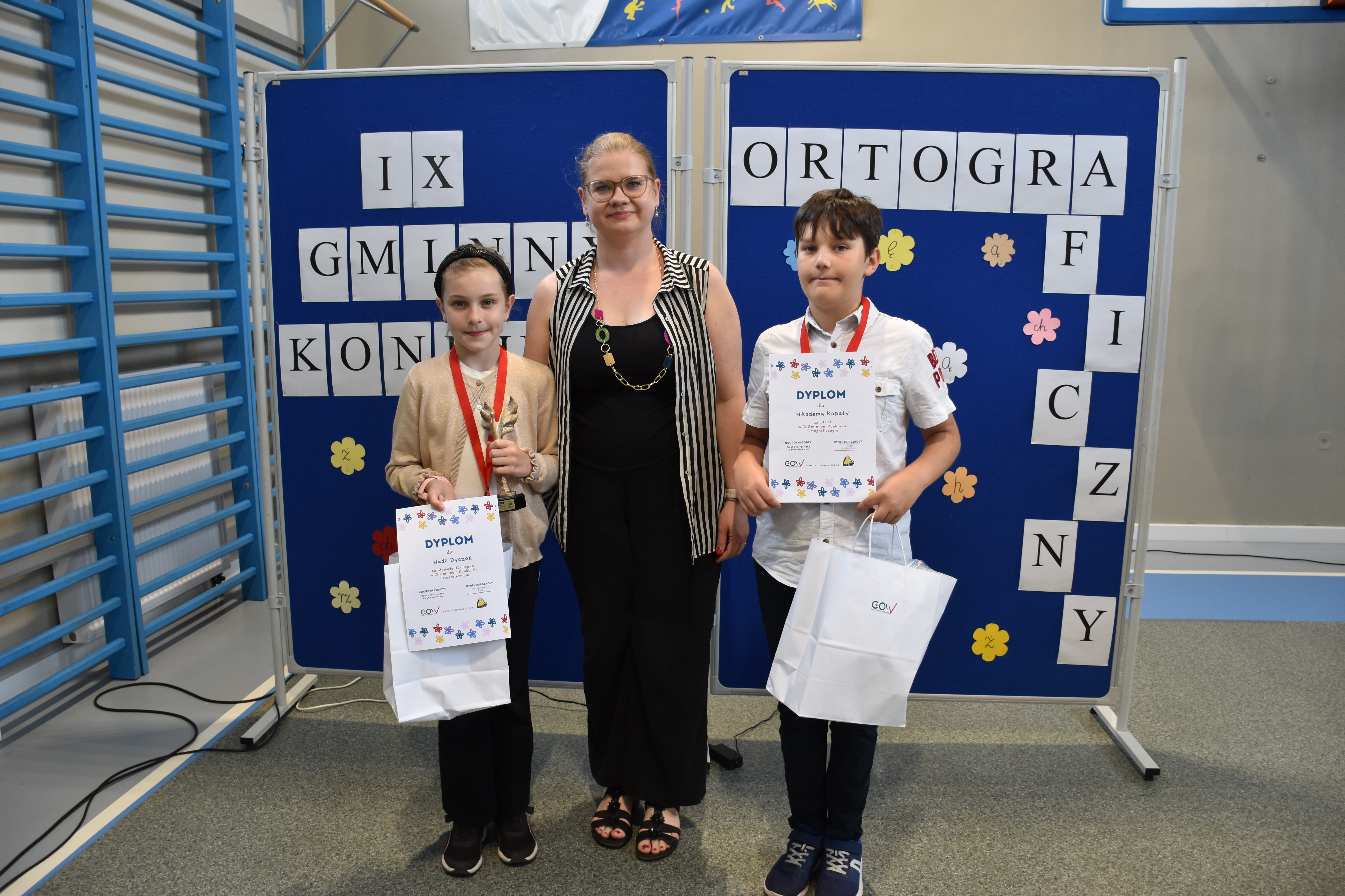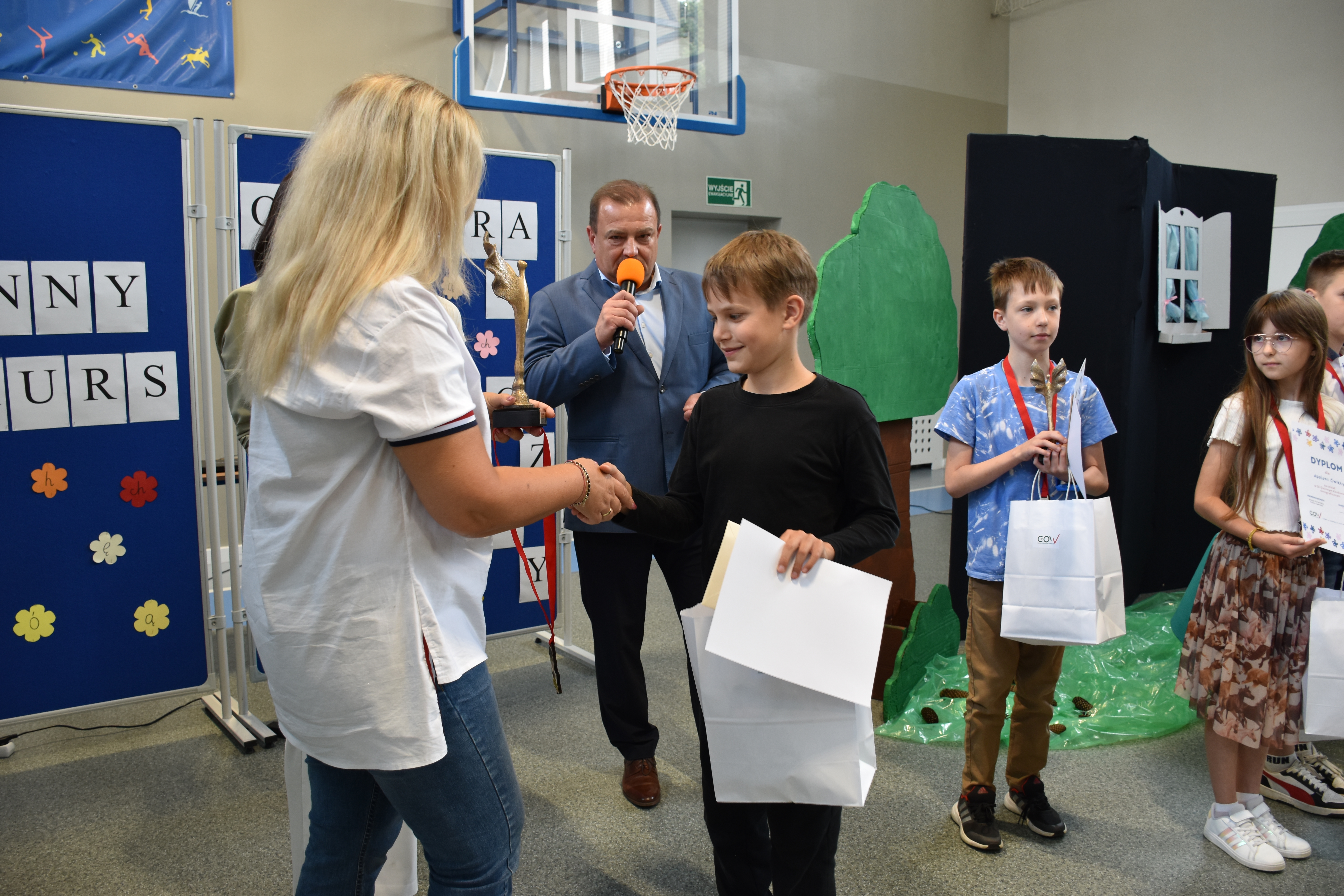 Nagrody dla finałowej trójki, dyplomy za udział w konkursie, podziękowania dla nauczycieli za przygotowanie do konkursu oraz podziękowania dla komisji sprawdzającej wręczyli, dyrektor Szkoły Podstawowej pan Tomasz Mocek, Kierownik Referatu Oświaty i Polityki Społecznej pani Aneta Kasprzak i radna Gminy Ostrów Wielkopolski pani Karolina Przytuła.