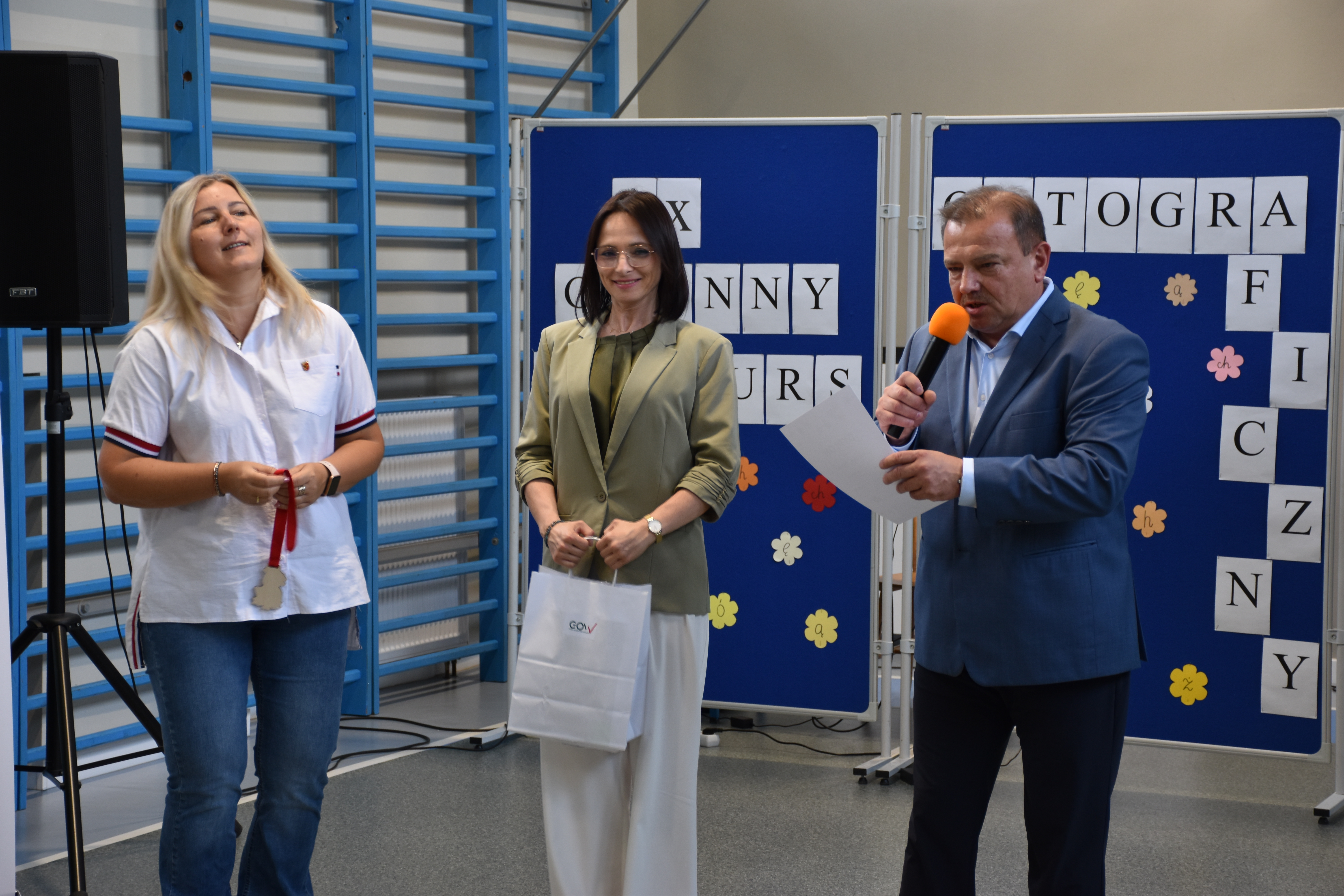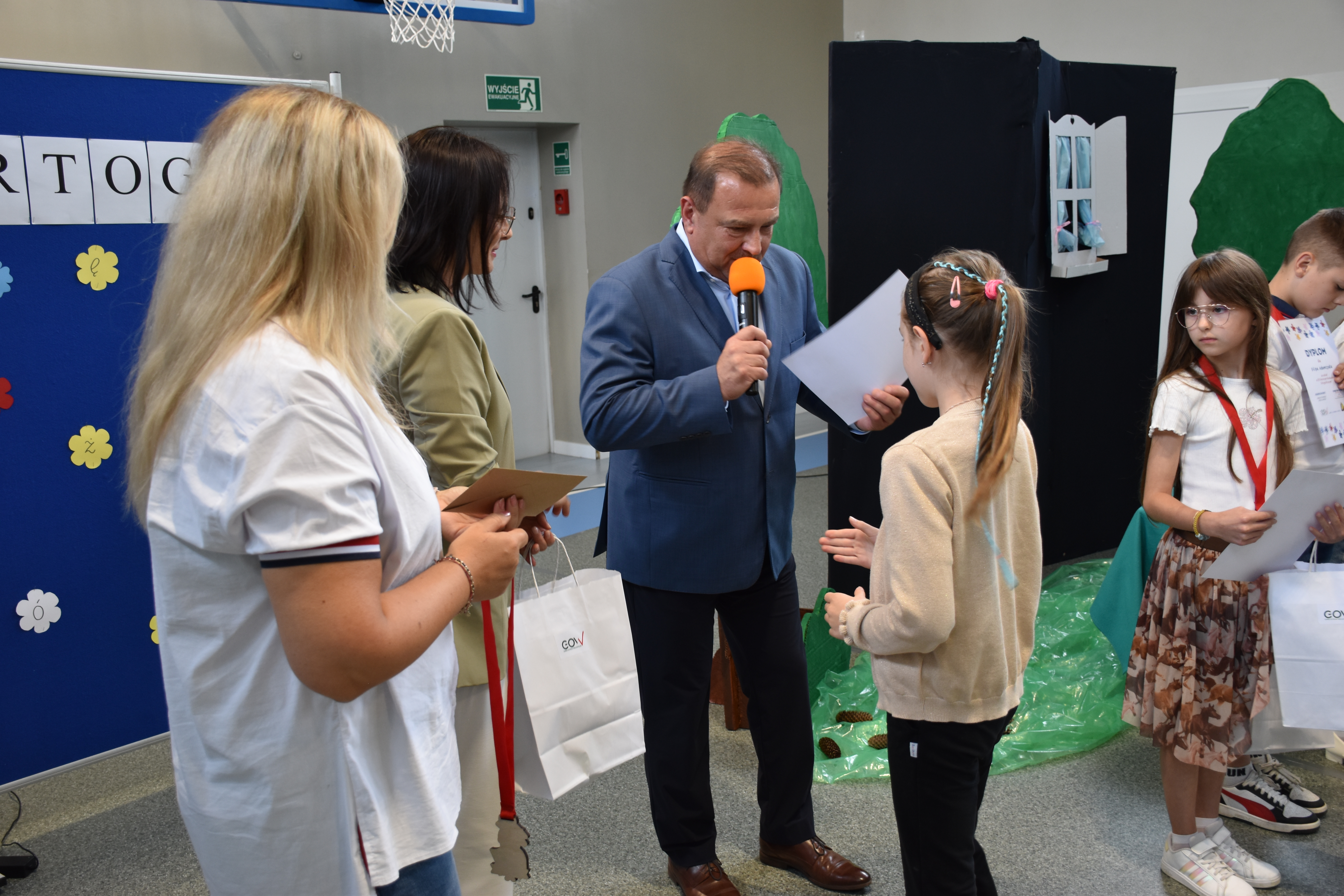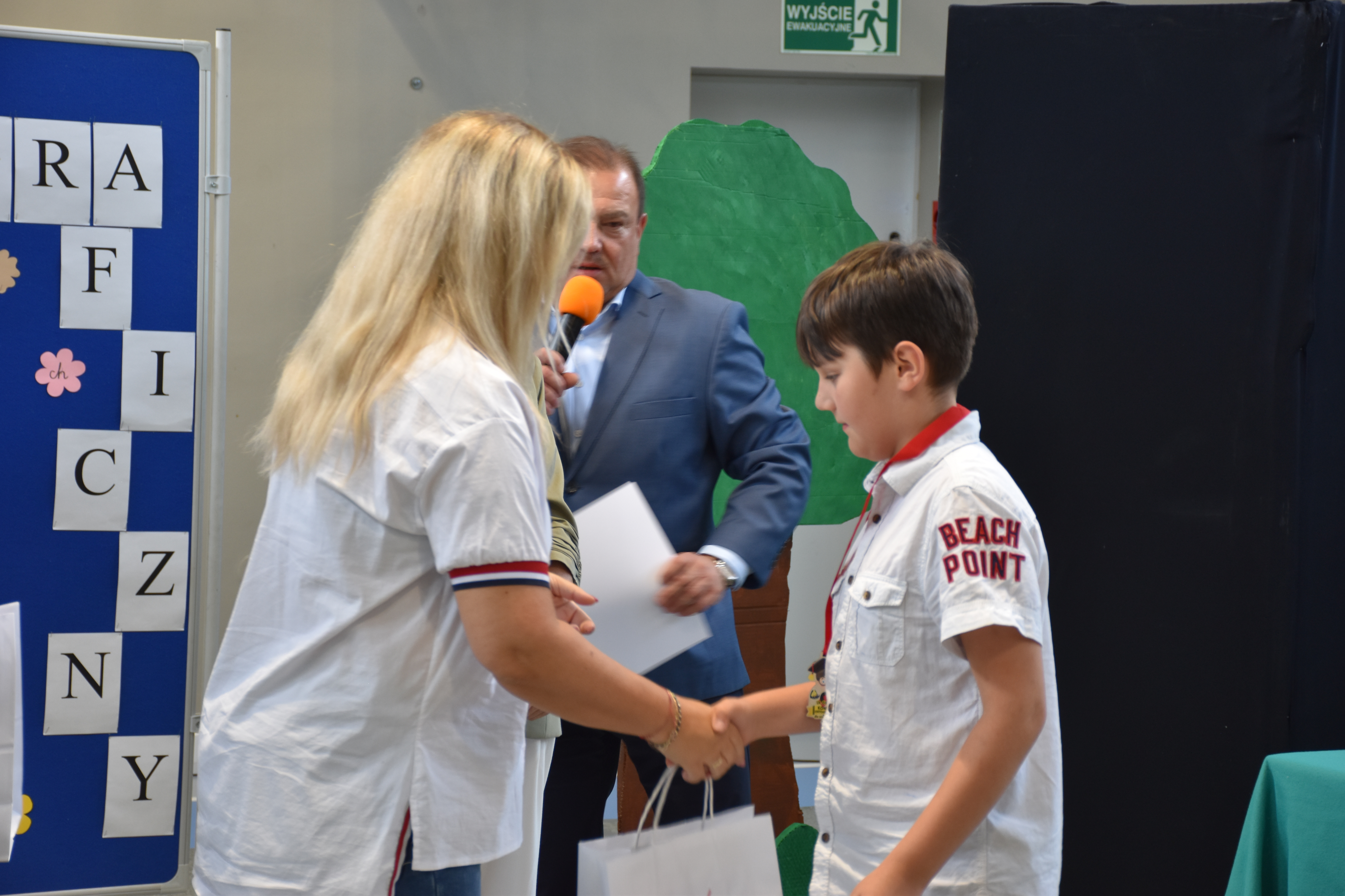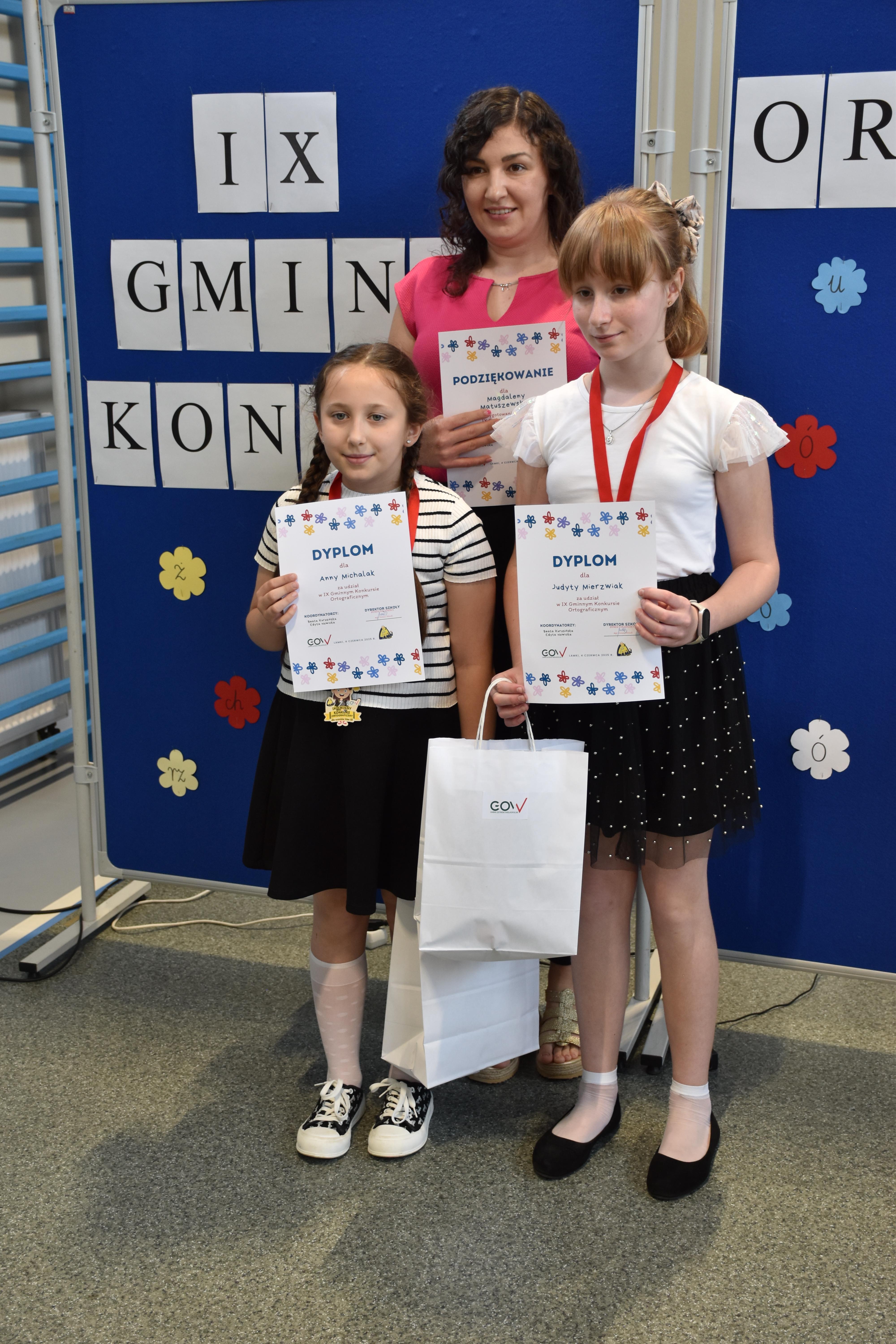 Nagrody dla finałowej trójki, dyplomy za udział w konkursie, podziękowania dla nauczycieli za przygotowanie do konkursu oraz podziękowania dla komisji sprawdzającej wręczyli, dyrektor Szkoły Podstawowej pan Tomasz Mocek, Kierownik Referatu Oświaty i Polityki Społecznej pani Aneta Kasprzak i radna Gminy Ostrów Wielkopolski pani Karolina Przytuła.