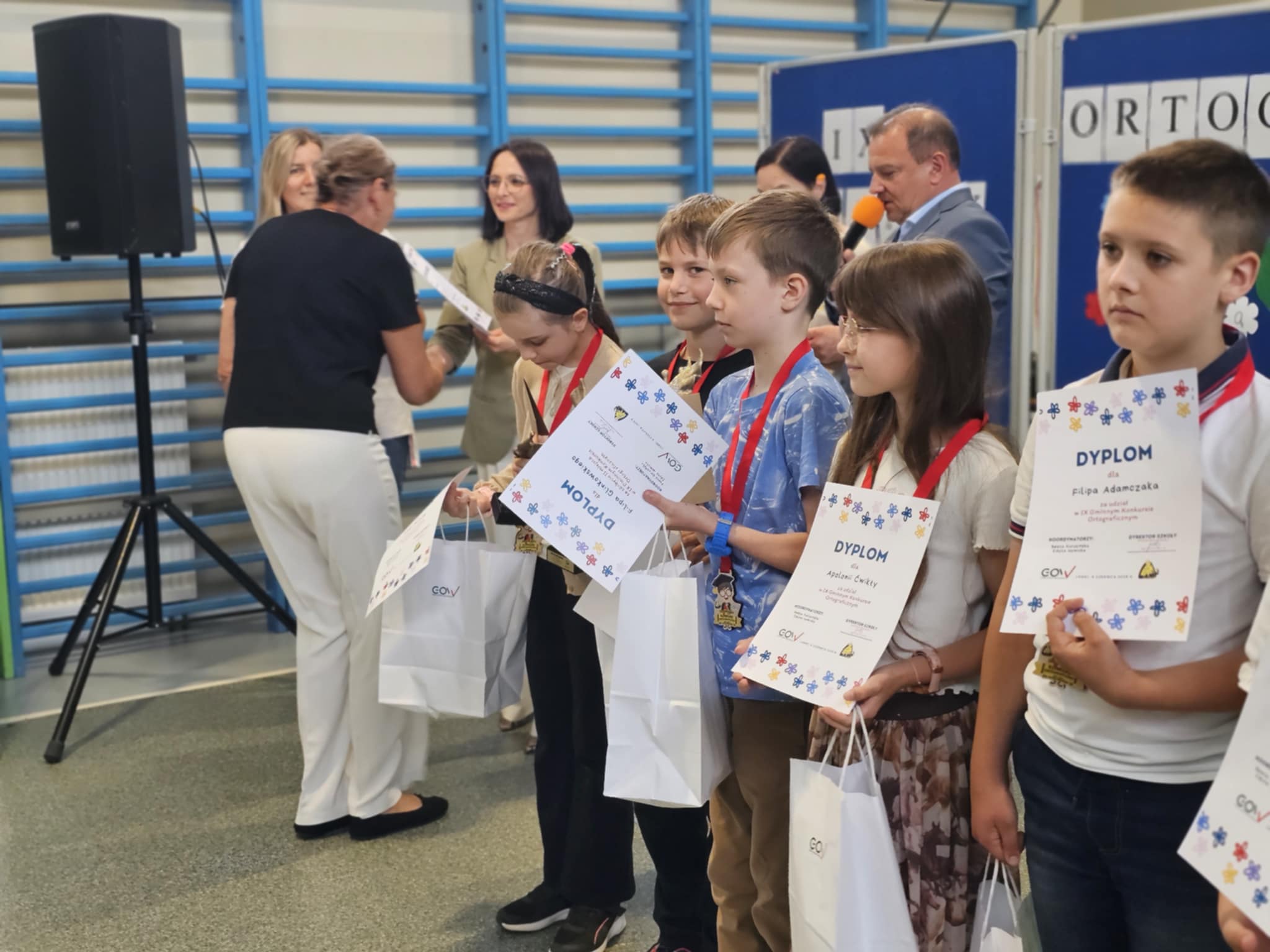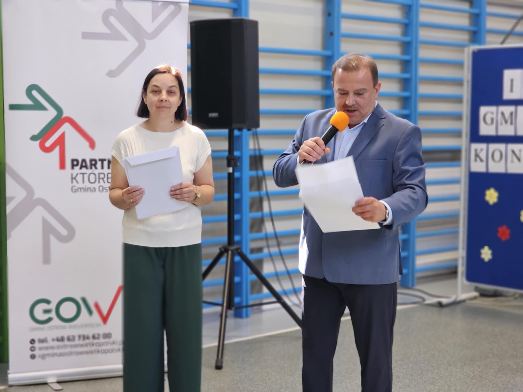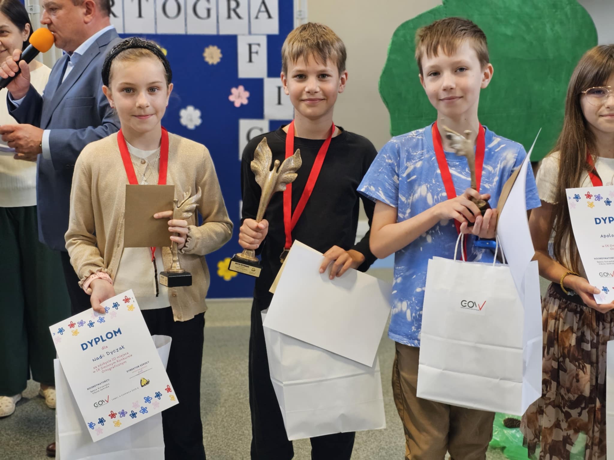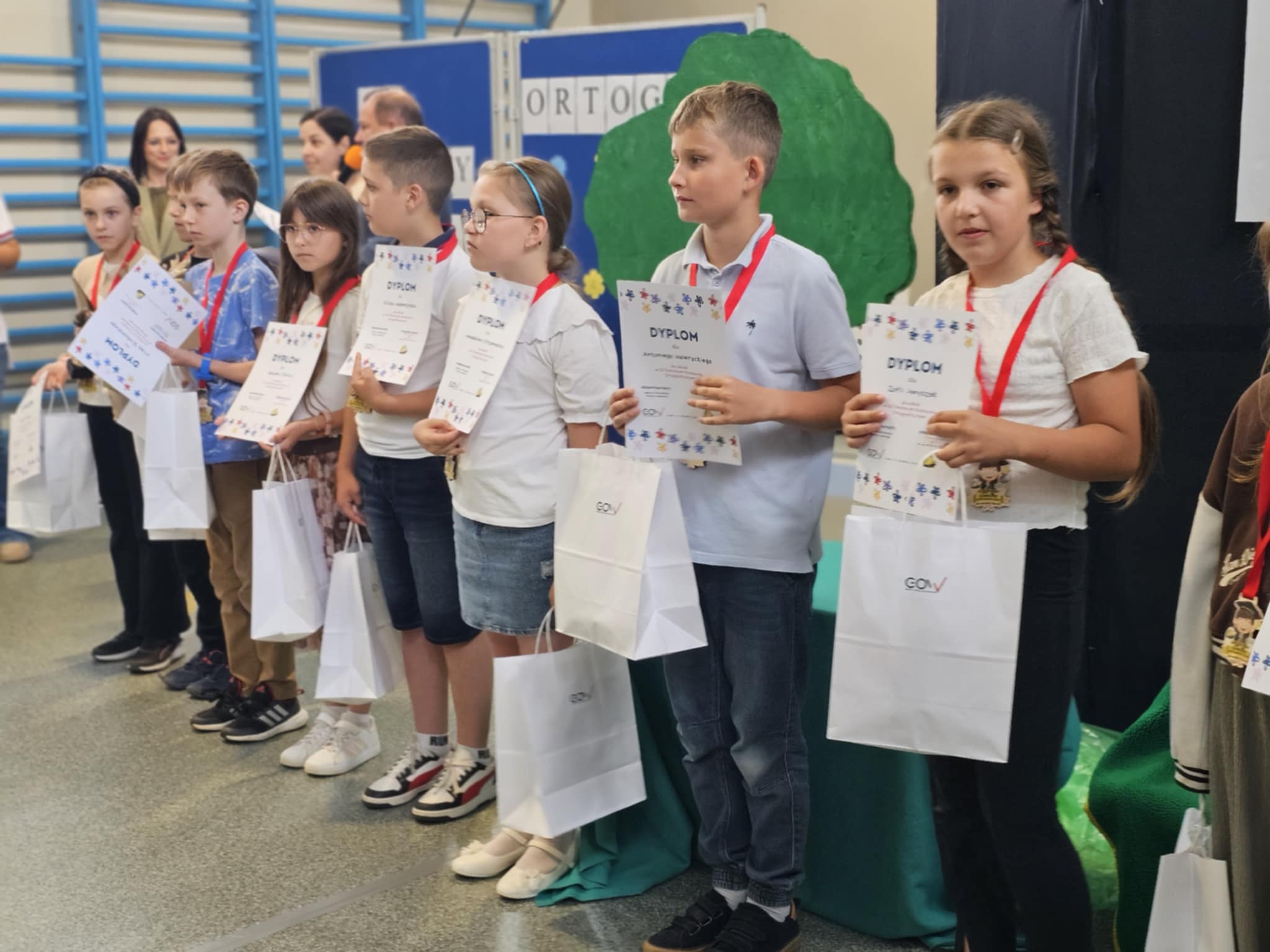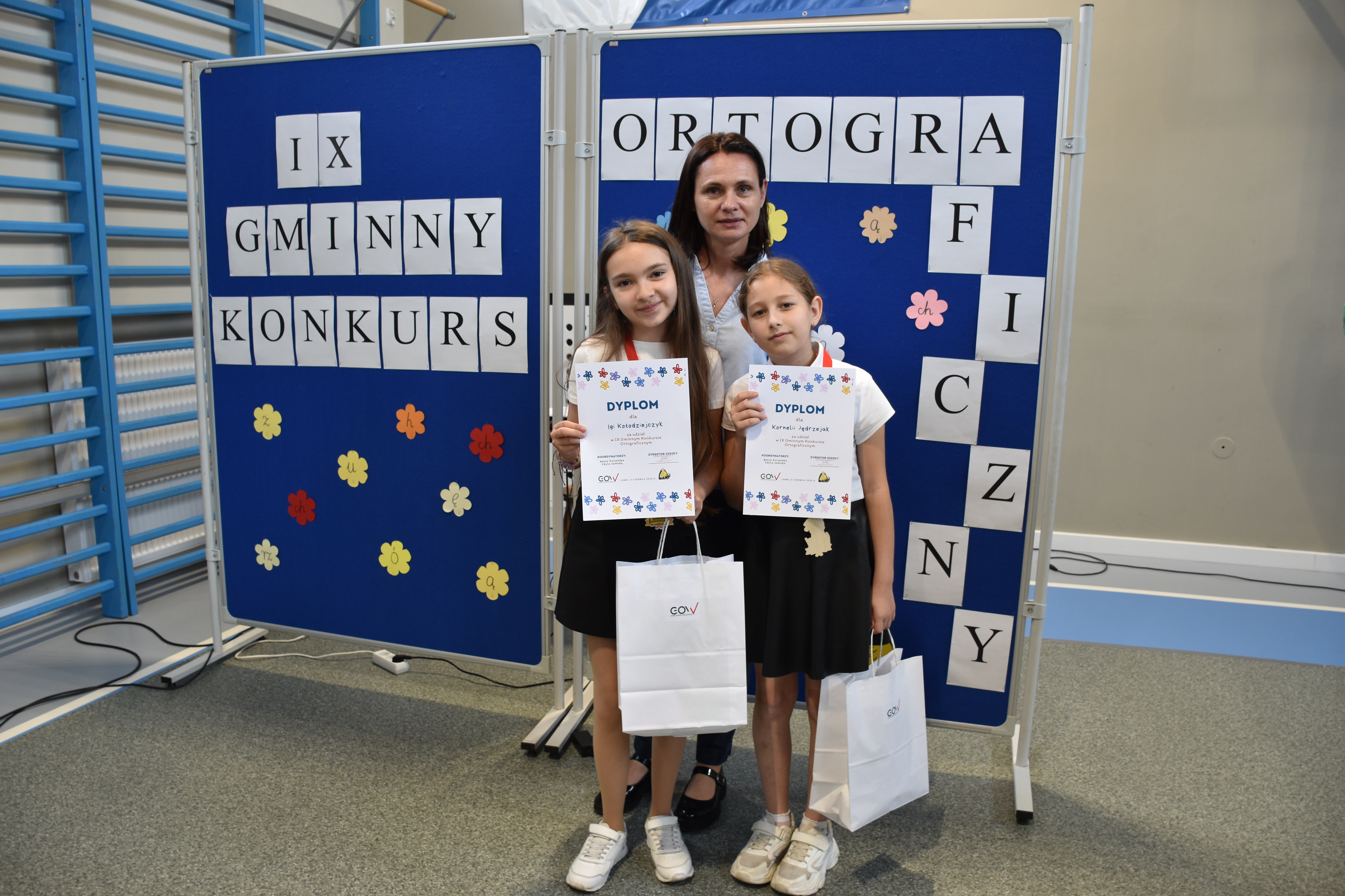 Nagrody dla finałowej trójki, dyplomy za udział w konkursie, podziękowania dla nauczycieli za przygotowanie do konkursu oraz podziękowania dla komisji sprawdzającej wręczyli, dyrektor Szkoły Podstawowej pan Tomasz Mocek, Kierownik Referatu Oświaty i Polityki Społecznej pani Aneta Kasprzak i radna Gminy Ostrów Wielkopolski pani Karolina Przytuła.
