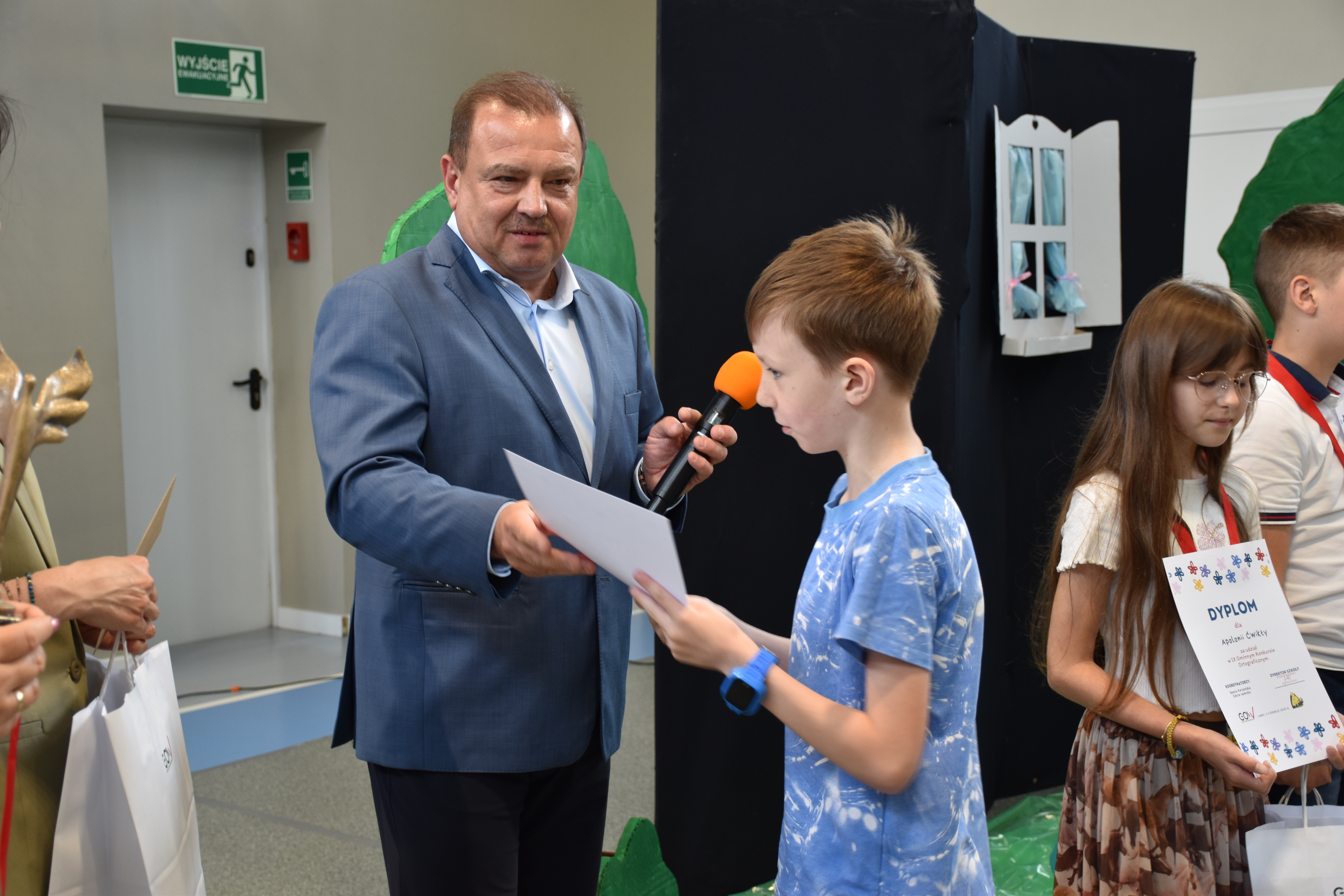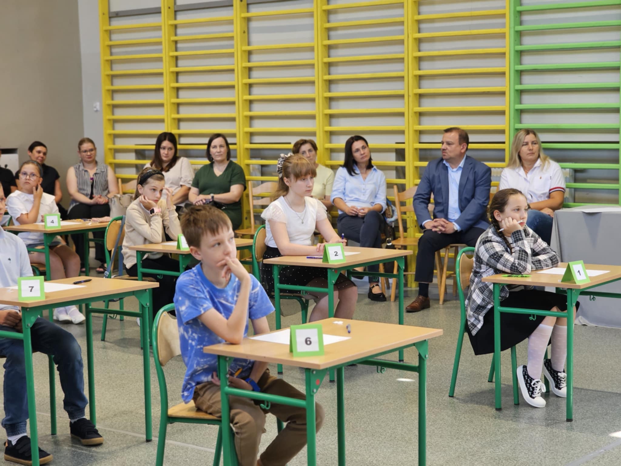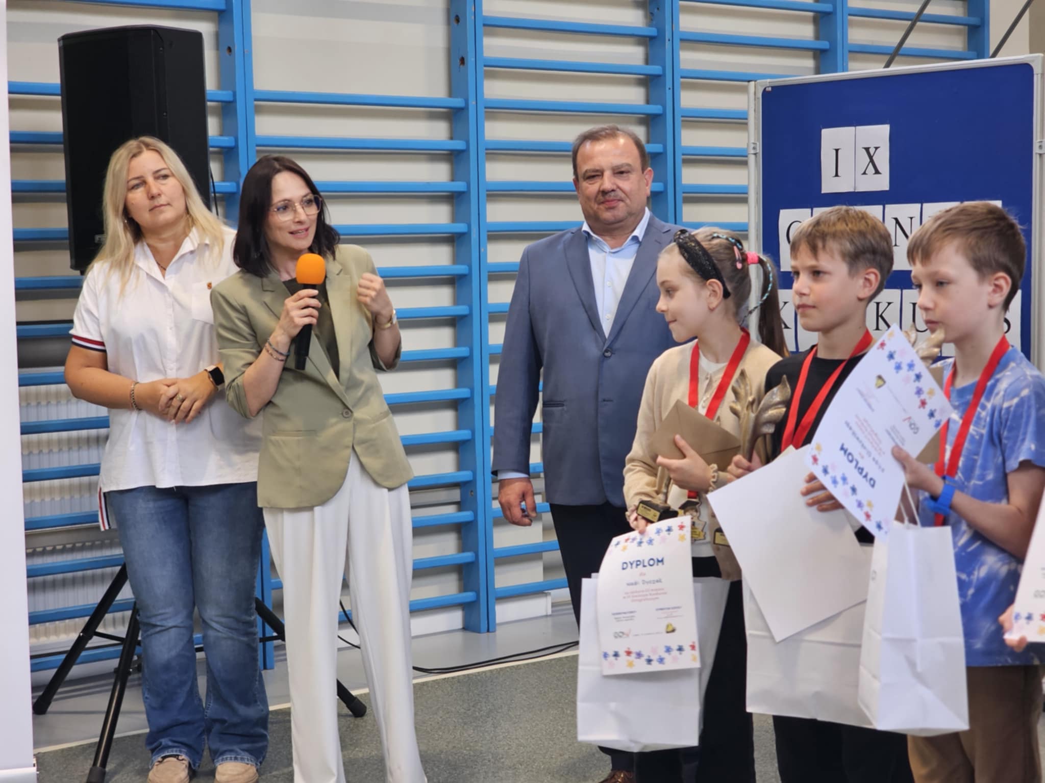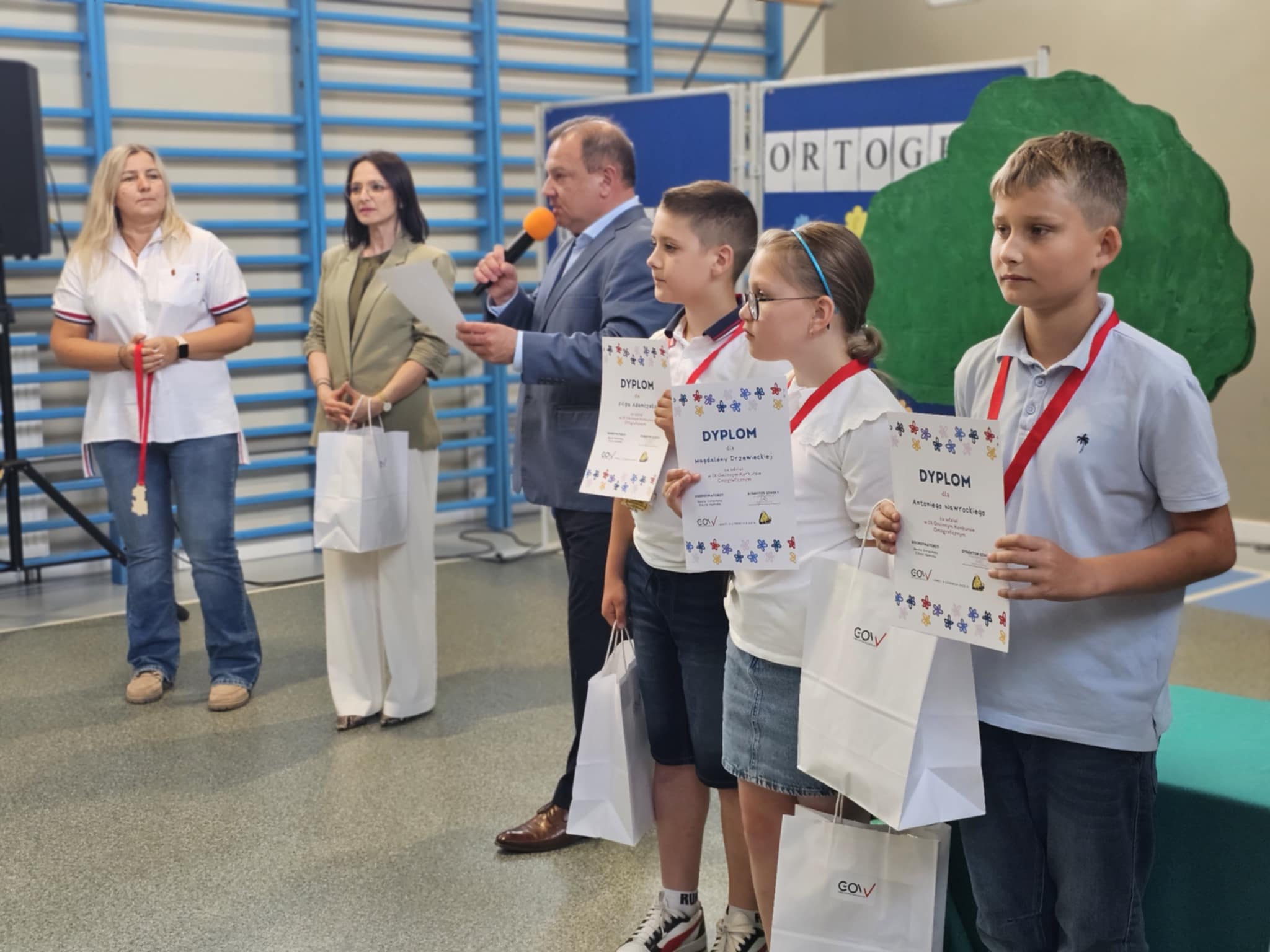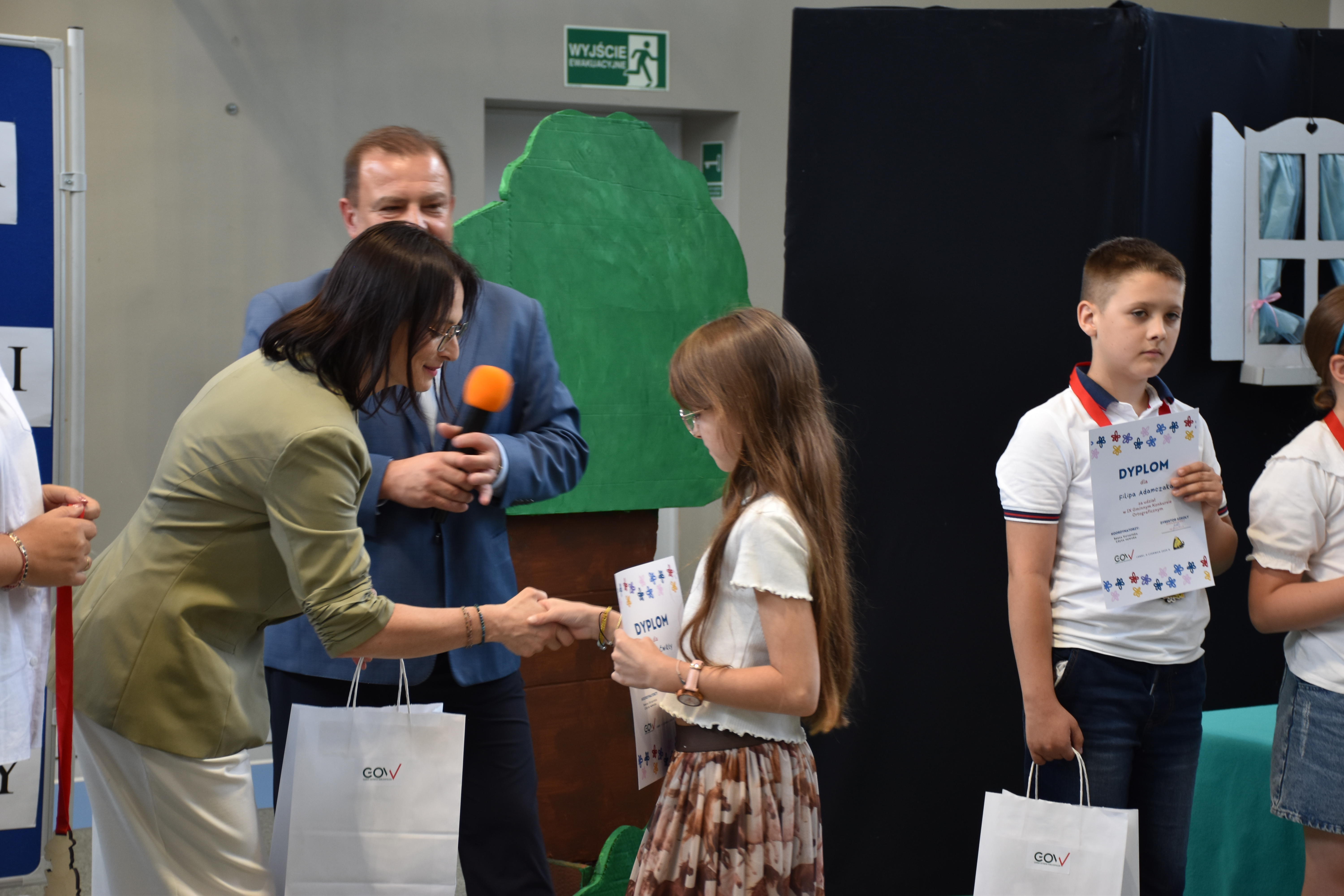 Nagrody dla finałowej trójki, dyplomy za udział w konkursie, podziękowania dla nauczycieli za przygotowanie do konkursu oraz podziękowania dla komisji sprawdzającej wręczyli, dyrektor Szkoły Podstawowej pan Tomasz Mocek, Kierownik Referatu Oświaty i Polityki Społecznej pani Aneta Kasprzak i radna Gminy Ostrów Wielkopolski pani Karolina Przytuła.