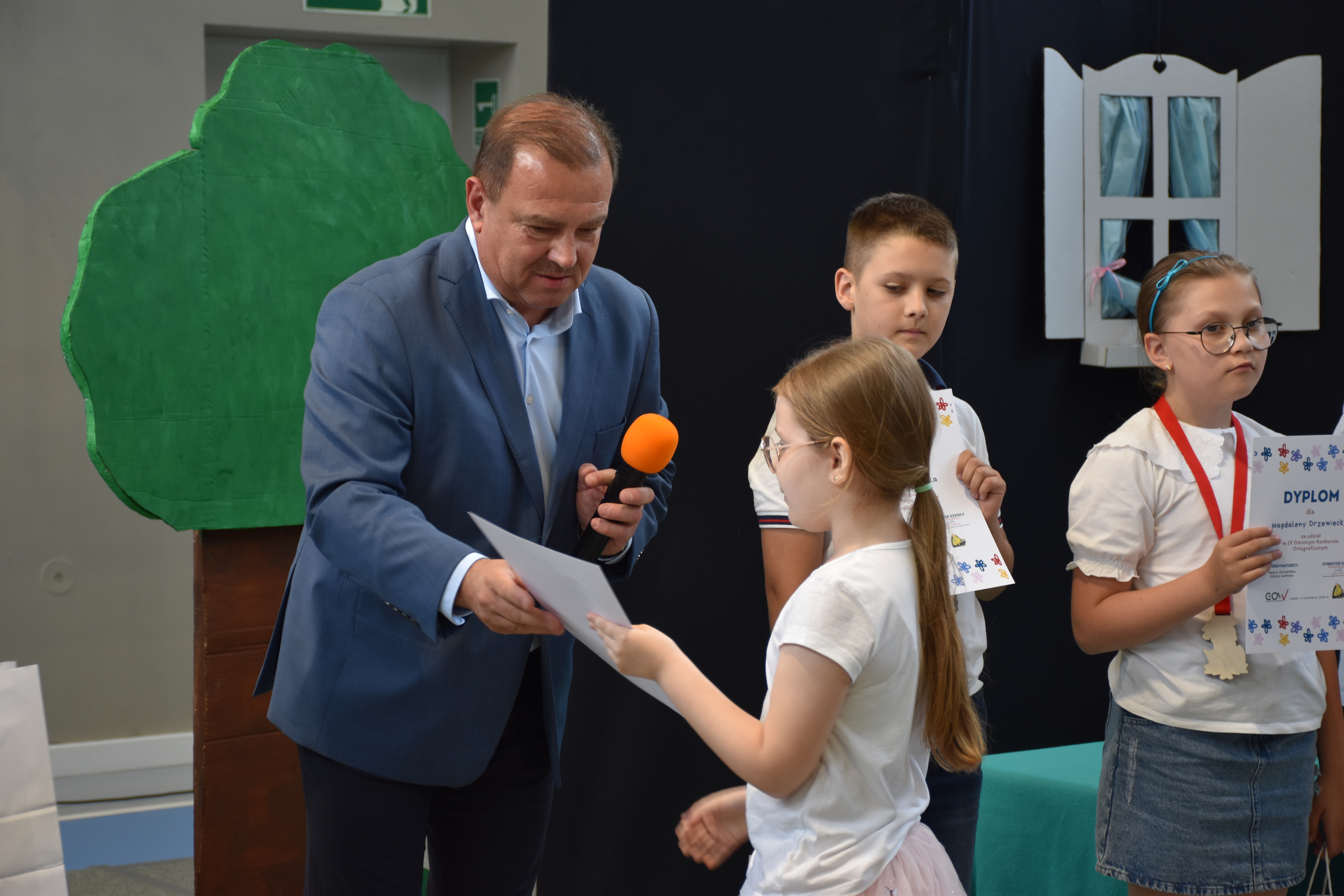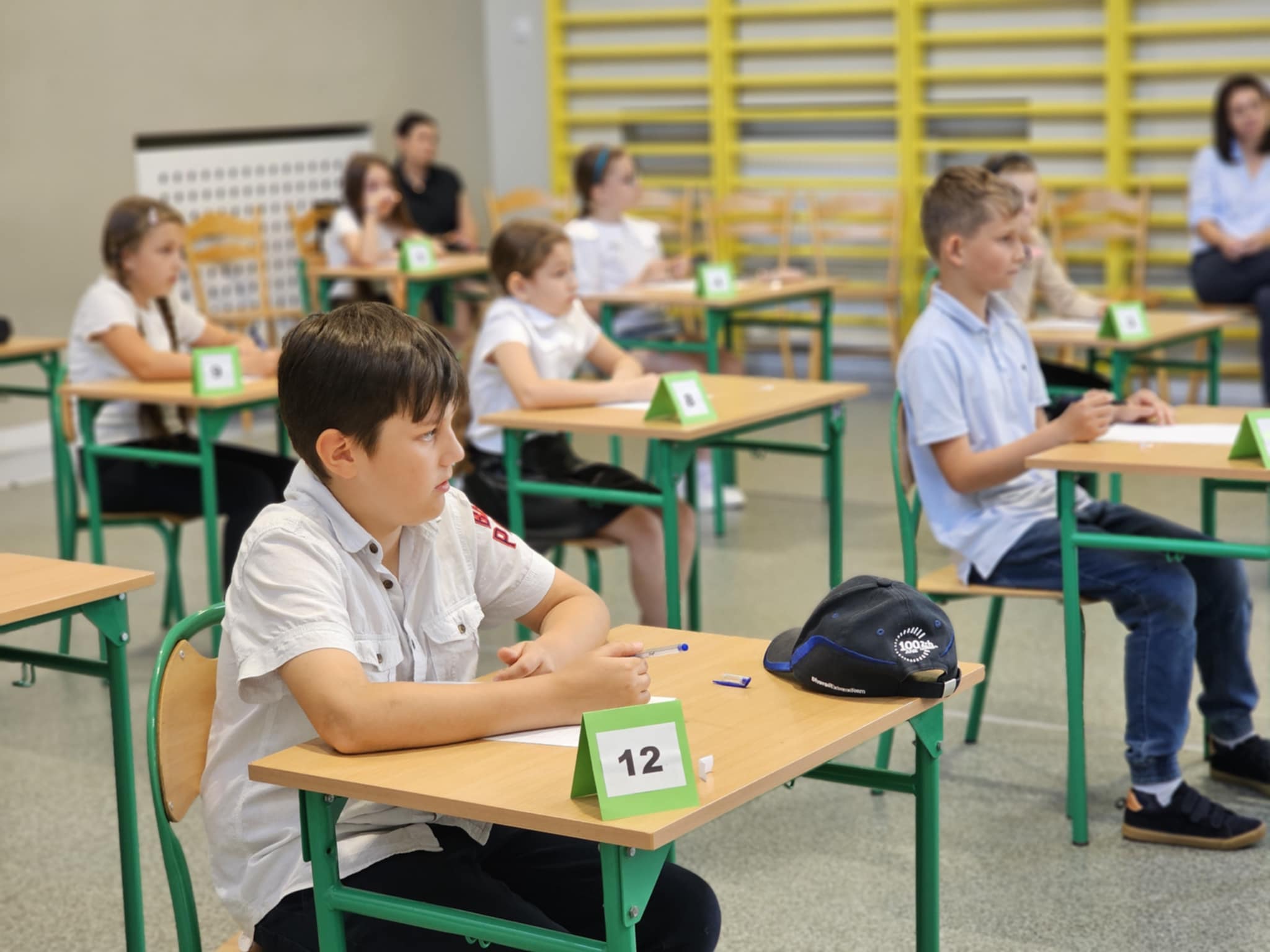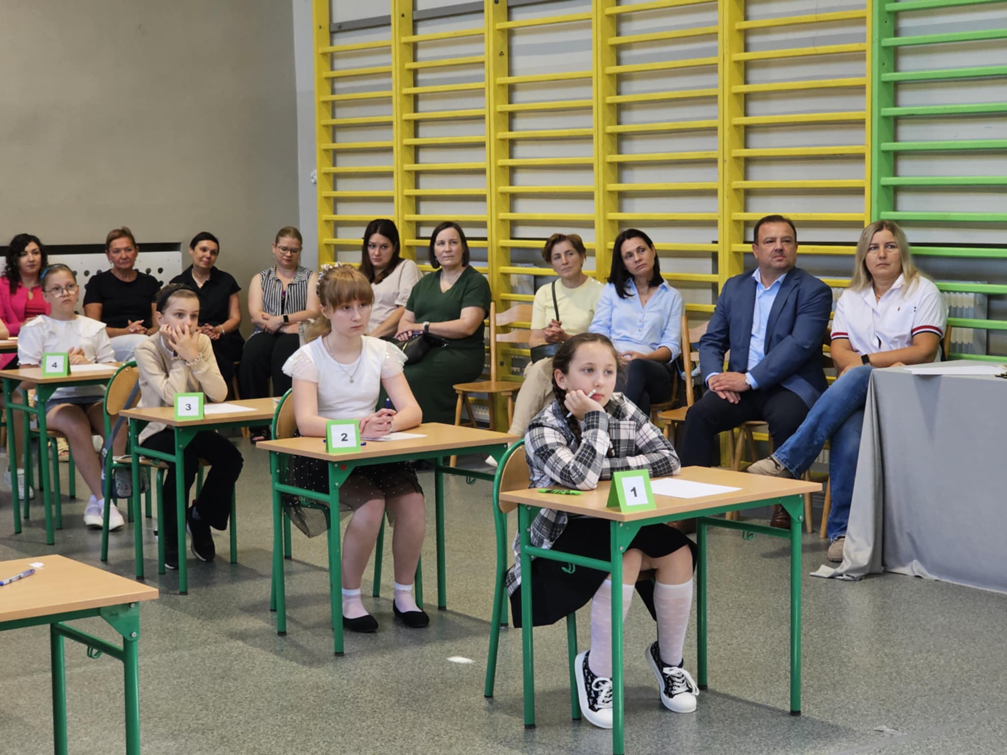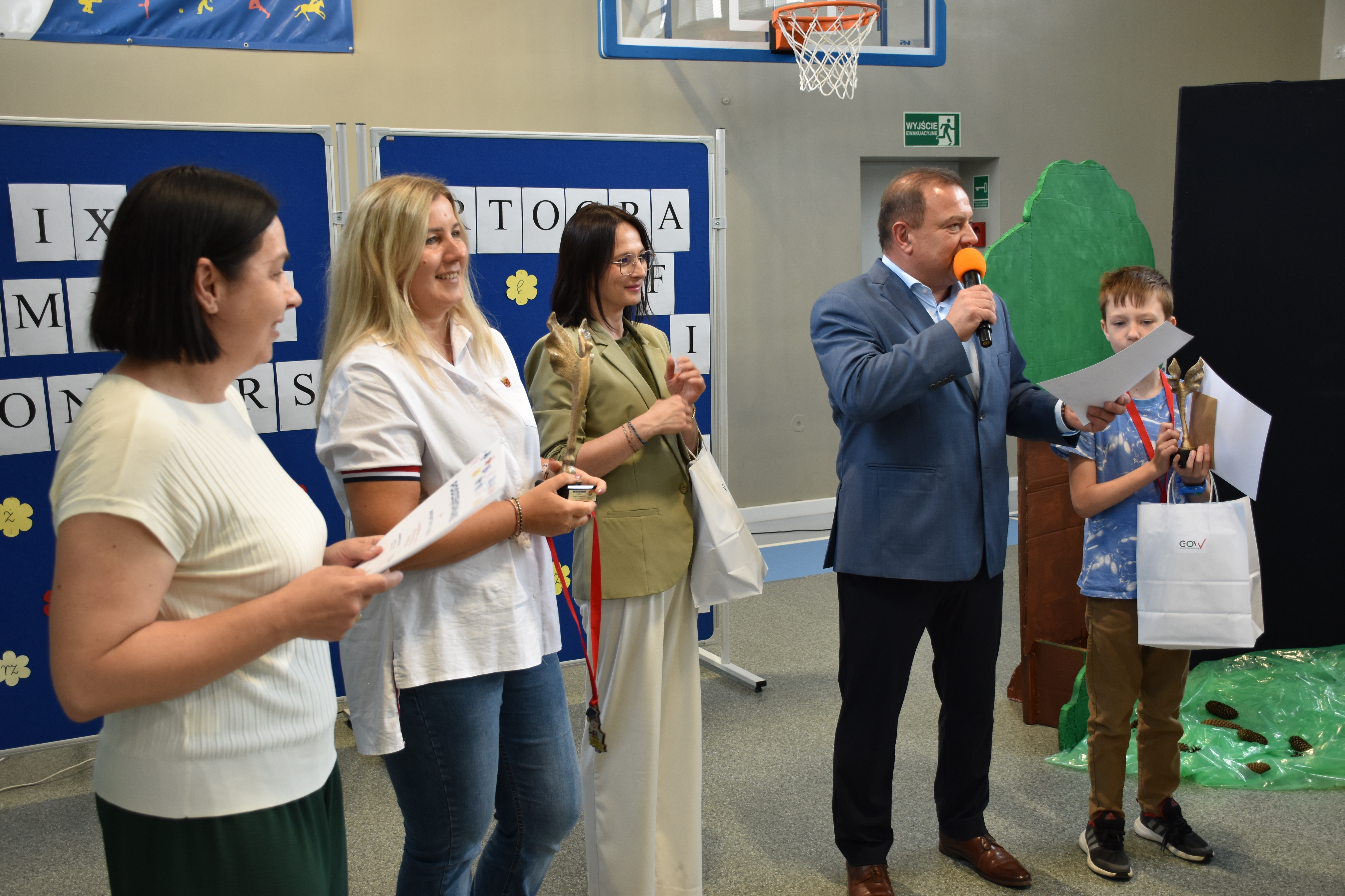 Nagrody dla finałowej trójki, dyplomy za udział w konkursie, podziękowania dla nauczycieli za przygotowanie do konkursu oraz podziękowania dla komisji sprawdzającej wręczyli, dyrektor Szkoły Podstawowej pan Tomasz Mocek, Kierownik Referatu Oświaty i Polityki Społecznej pani Aneta Kasprzak i radna Gminy Ostrów Wielkopolski pani Karolina Przytuła.