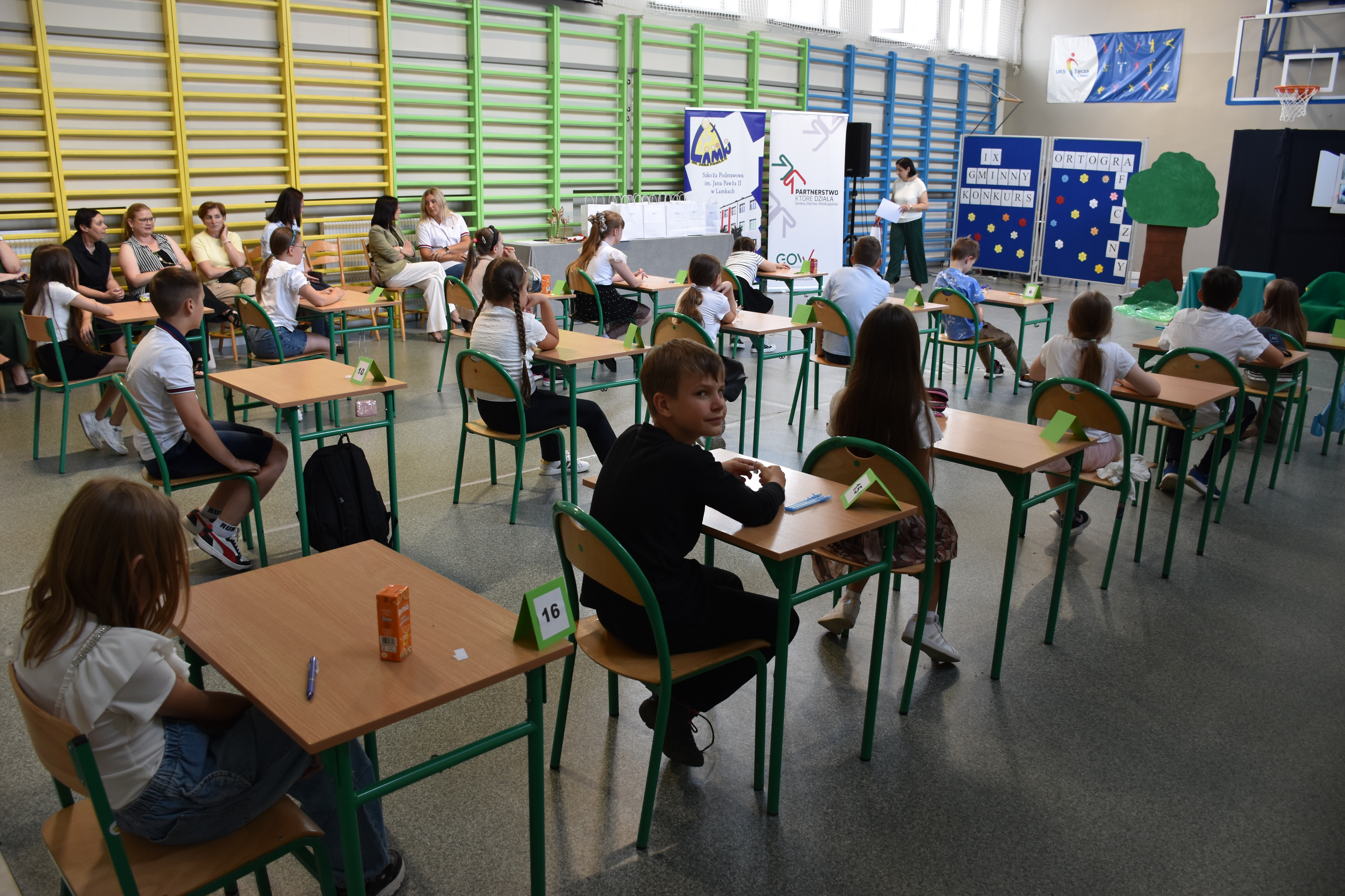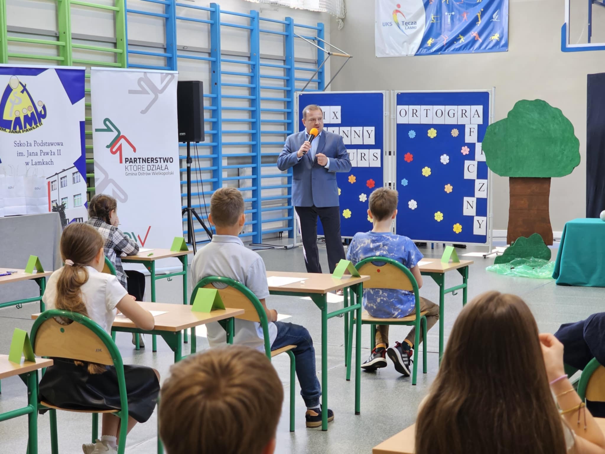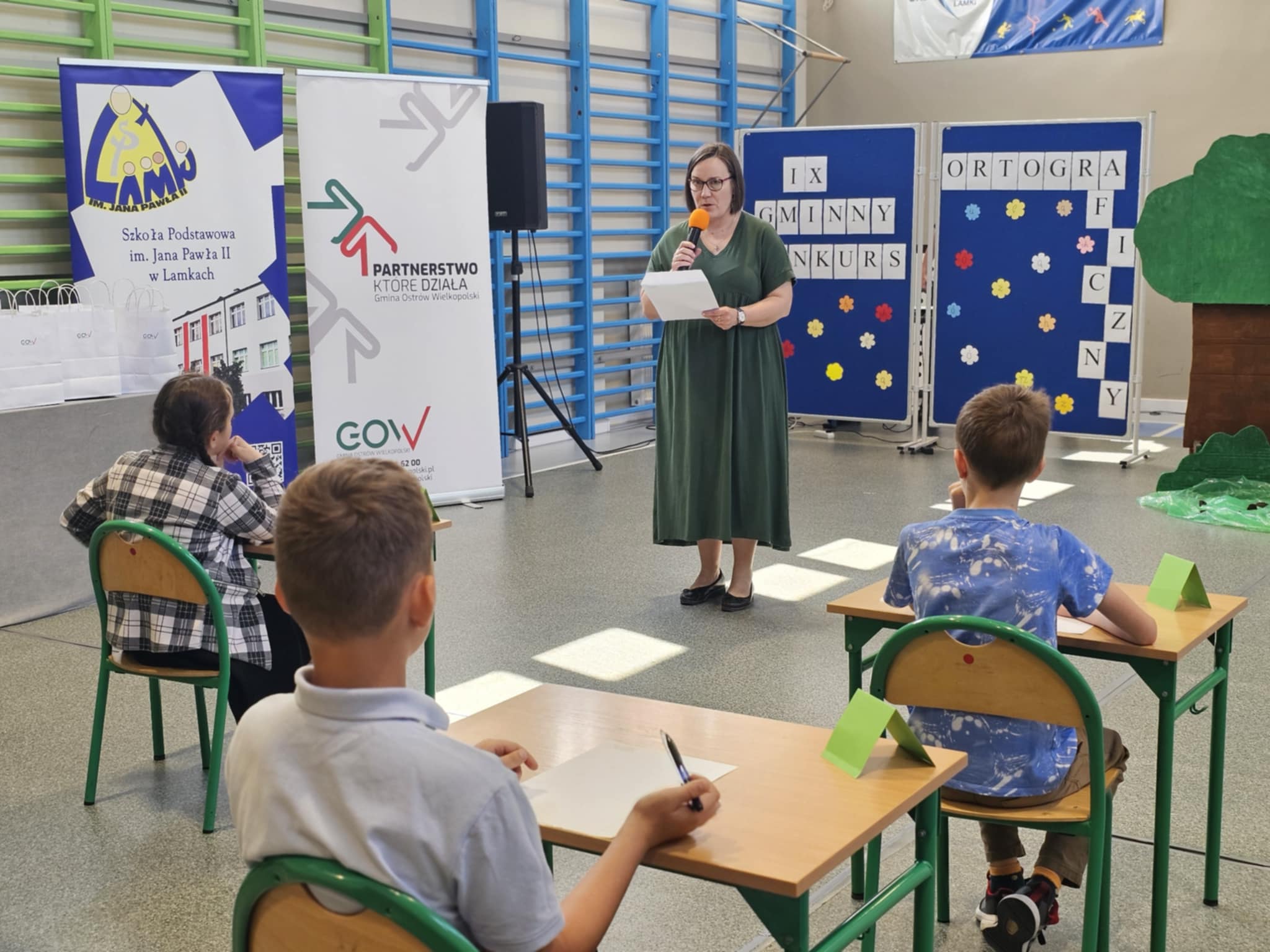 4 czerwca 2025 roku w Szkole Podstawowej im. Jana Pawła II w Lamkach odbył się IX Gminny Konkurs Ortograficzny pod patronatem Wójta Gminy Ostrów Wielkopolski. W konkursie wzięli udział uczniowie klas trzecich z ośmiu szkól Gminy Ostrów Wielkopolski, którzy zostali wyłonieni podczas wewnętrznych eliminacji szkolnych w swojej placówce. Podczas części konkursowej uczniowie pisali dyktando do książki pt. „Anaruk, chłopiec z Grenlandii” Czesława Centkiewicza, przygotowane przez nauczyciela języka polskiego. Tekst dyktanda dostosowany był do poziomu uczniów klas trzecich. Po napisaniu dyktanda komisja oceniająca składająca się z nauczycieli języka polskiego i edukacji wczesnoszkolnej udała się do oddzielnej sali w celu sprawdzenia prac. Po części konkursowej odbyła się krótka przerwa. Następnie dzieci, nauczyciele i rodzice zostali zaproszeni do obejrzenia przedstawienia pt. „Nie ma tego złego” w wykonaniu uczniów klas 1 -3 oraz pokaz tańca w wykonaniu dziewczynek.