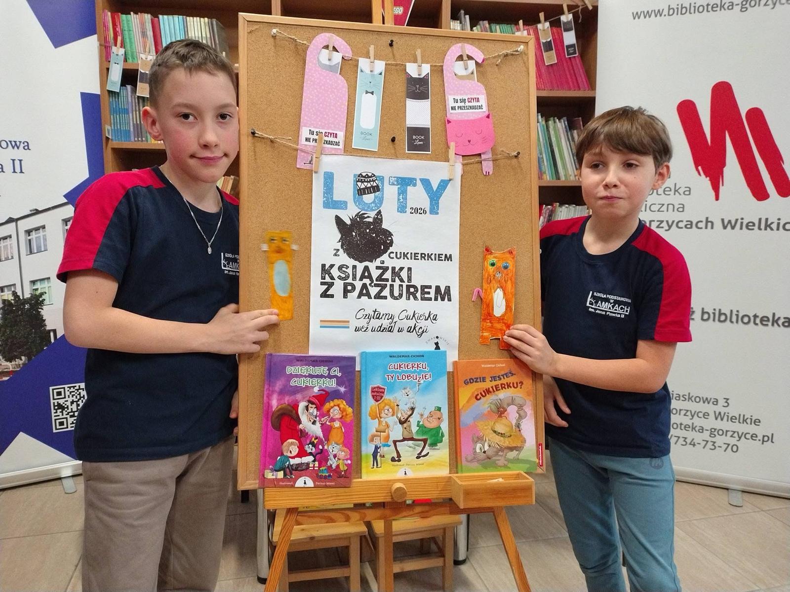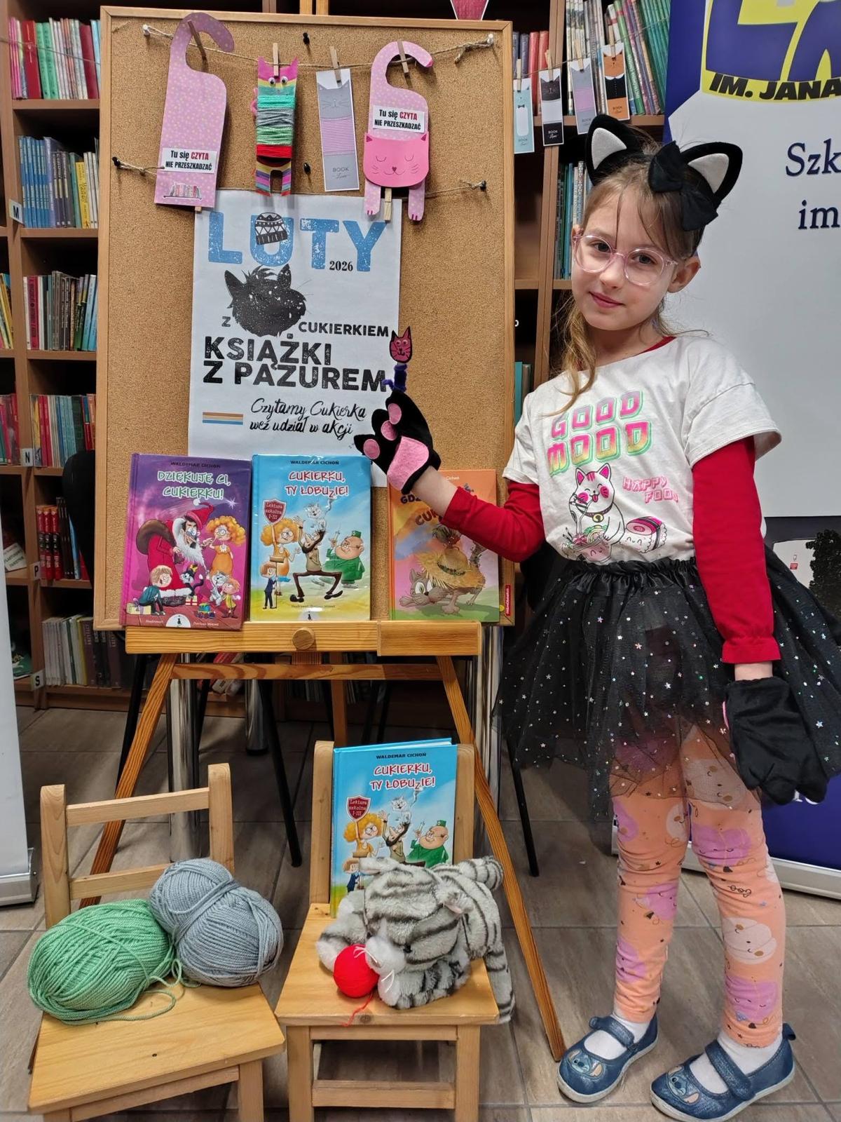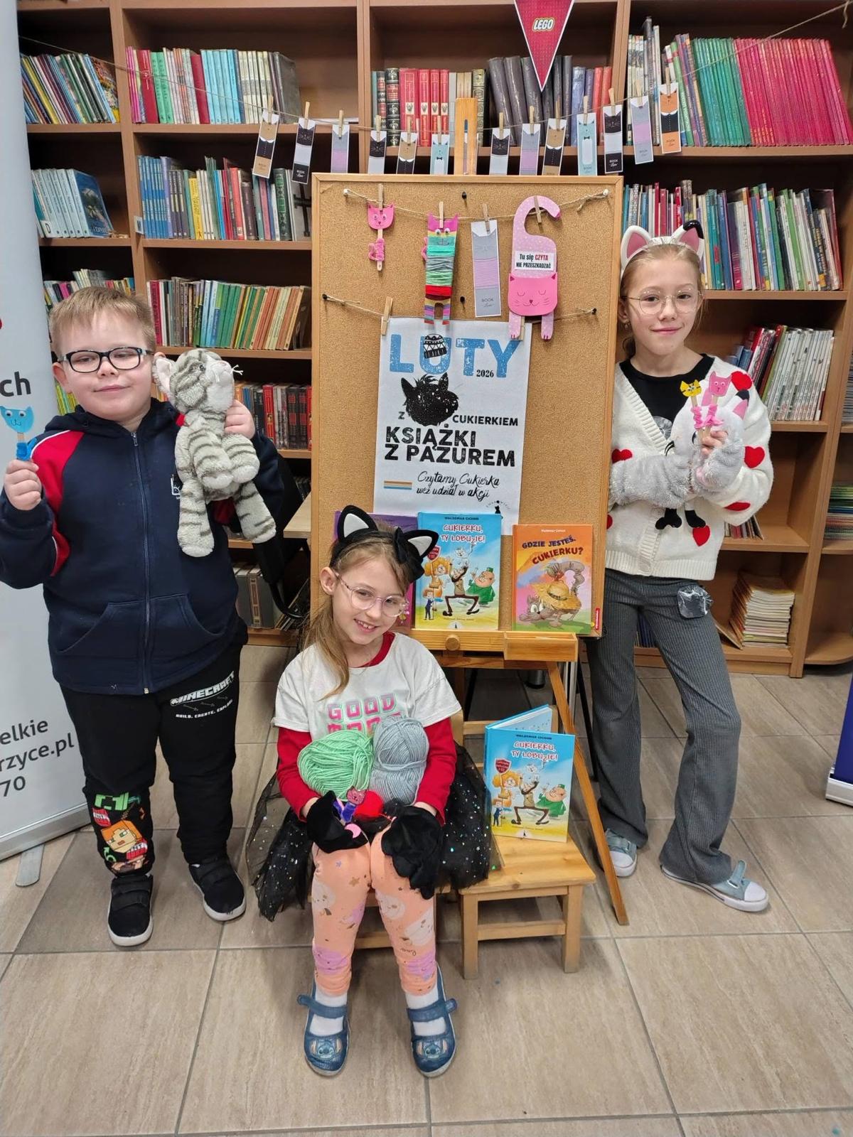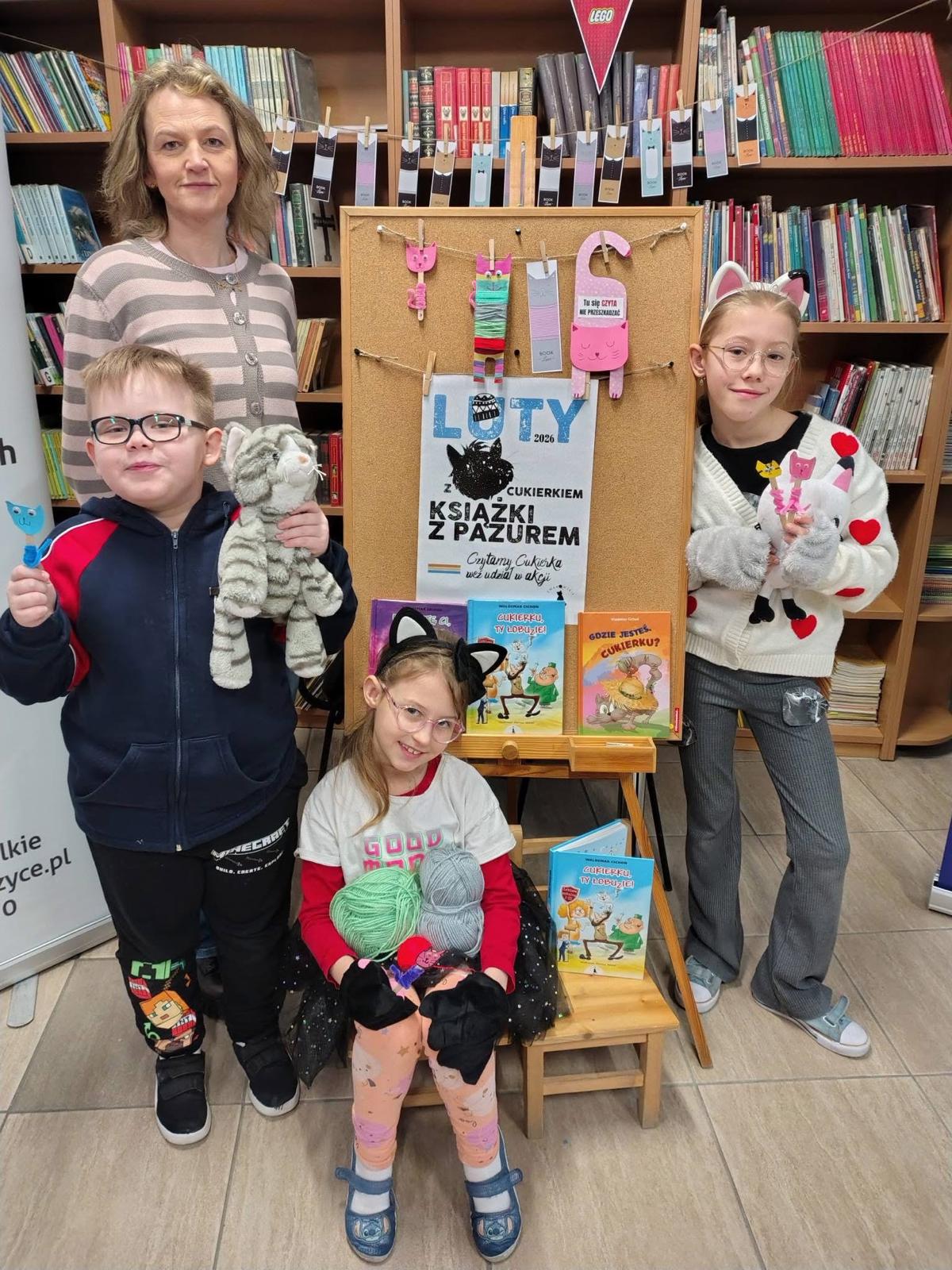 W lutym nasza biblioteka zamieniła się w krainę kocich przygód! Wszystko za sprawą ogólnopolskiej akcji czytelniczej „Luty z Cukierkiem – Książki z Pazurem”, organizowanej przez Wydawnictwo Żwakowskie. Głównym bohaterem naszych spotkań został nie kto inny, jak Cukierek – najbardziej niesforny, pręgowany dachowiec na świecie, stworzony przez Waldemara Cichonia.