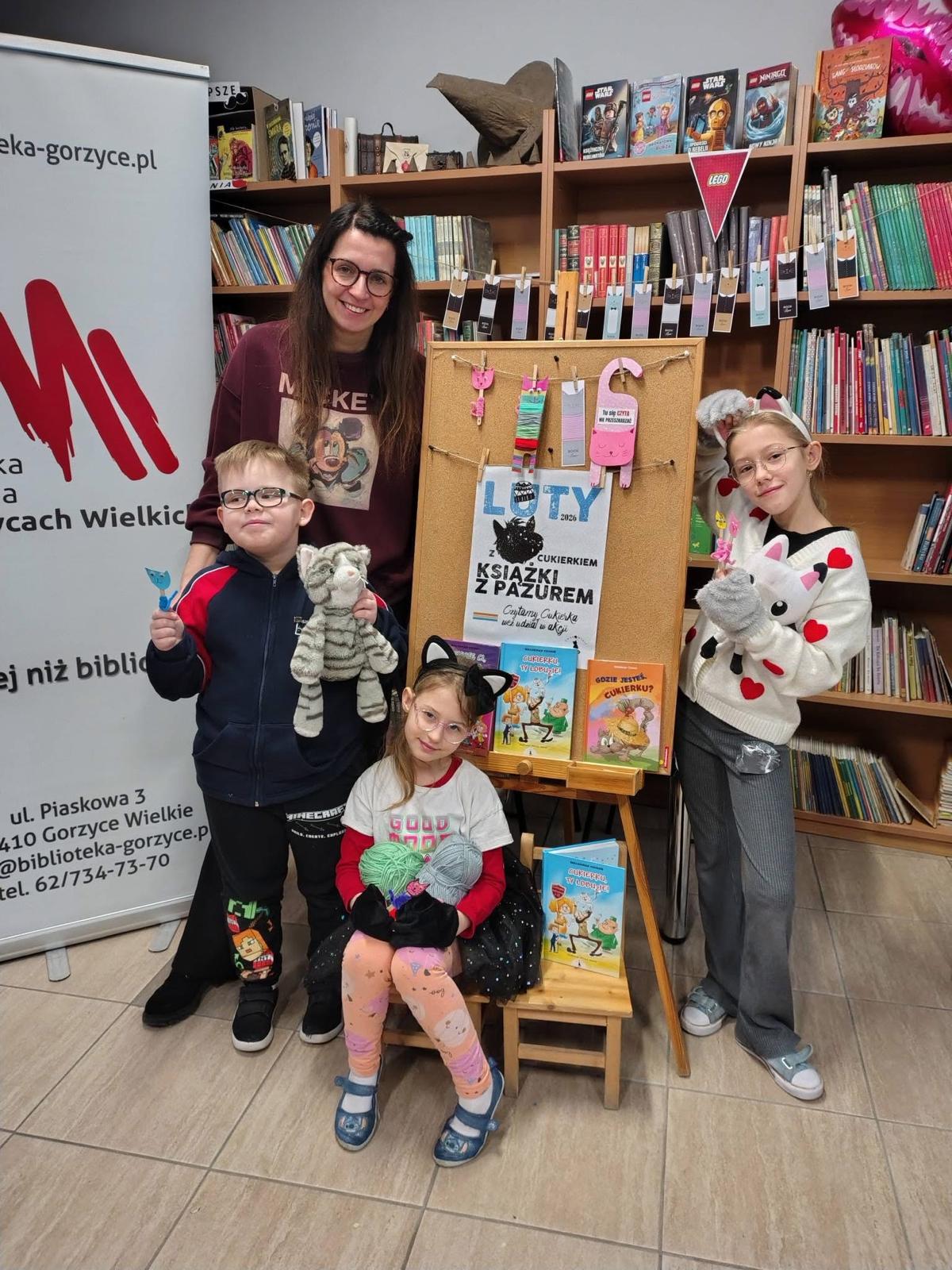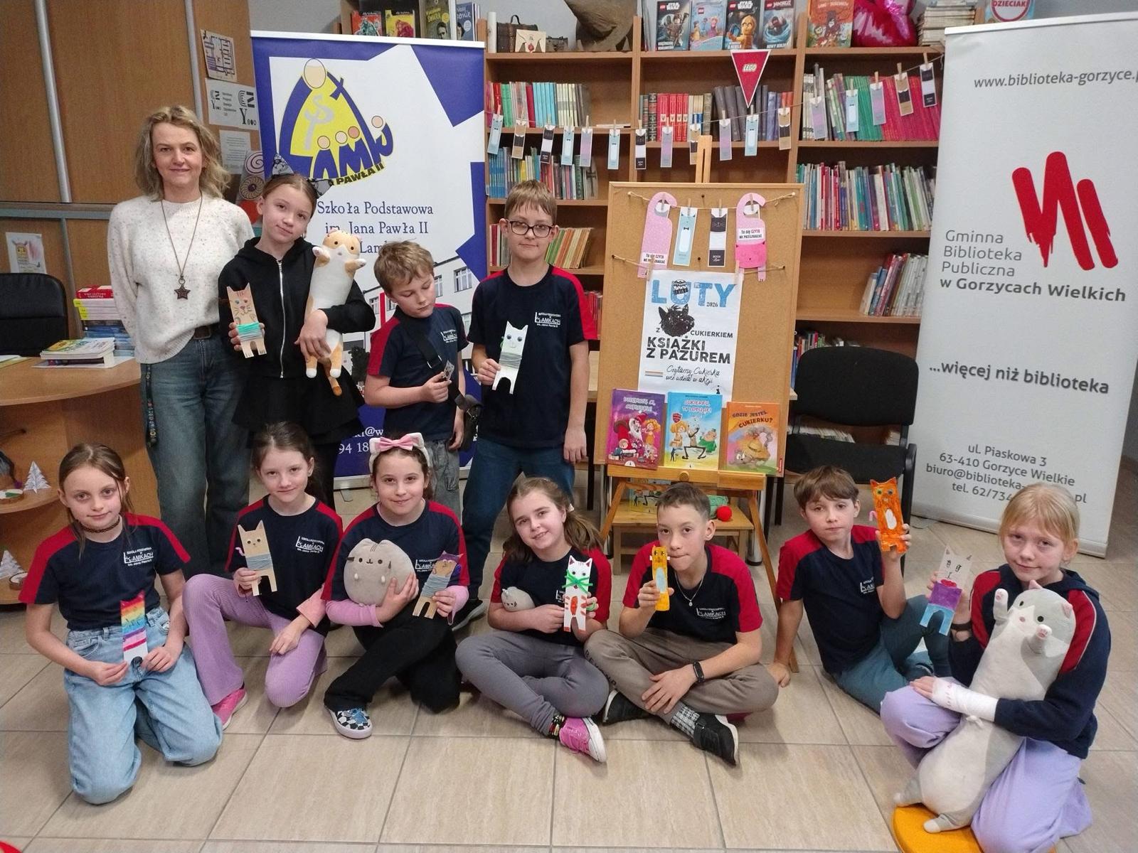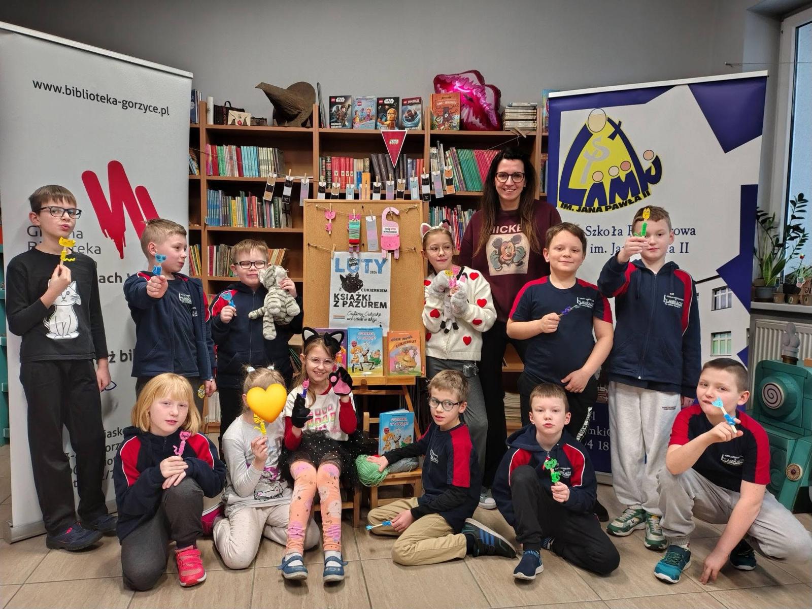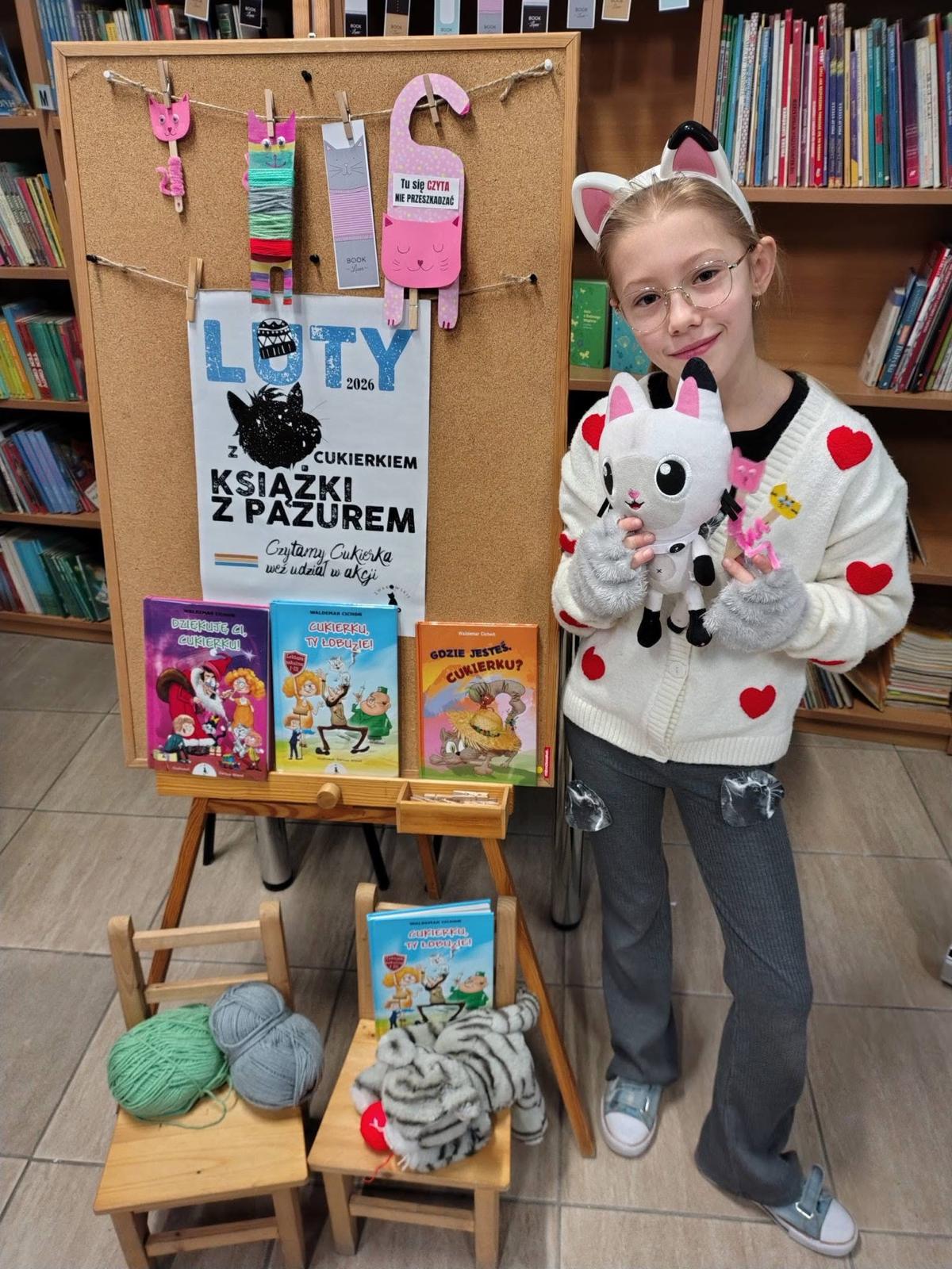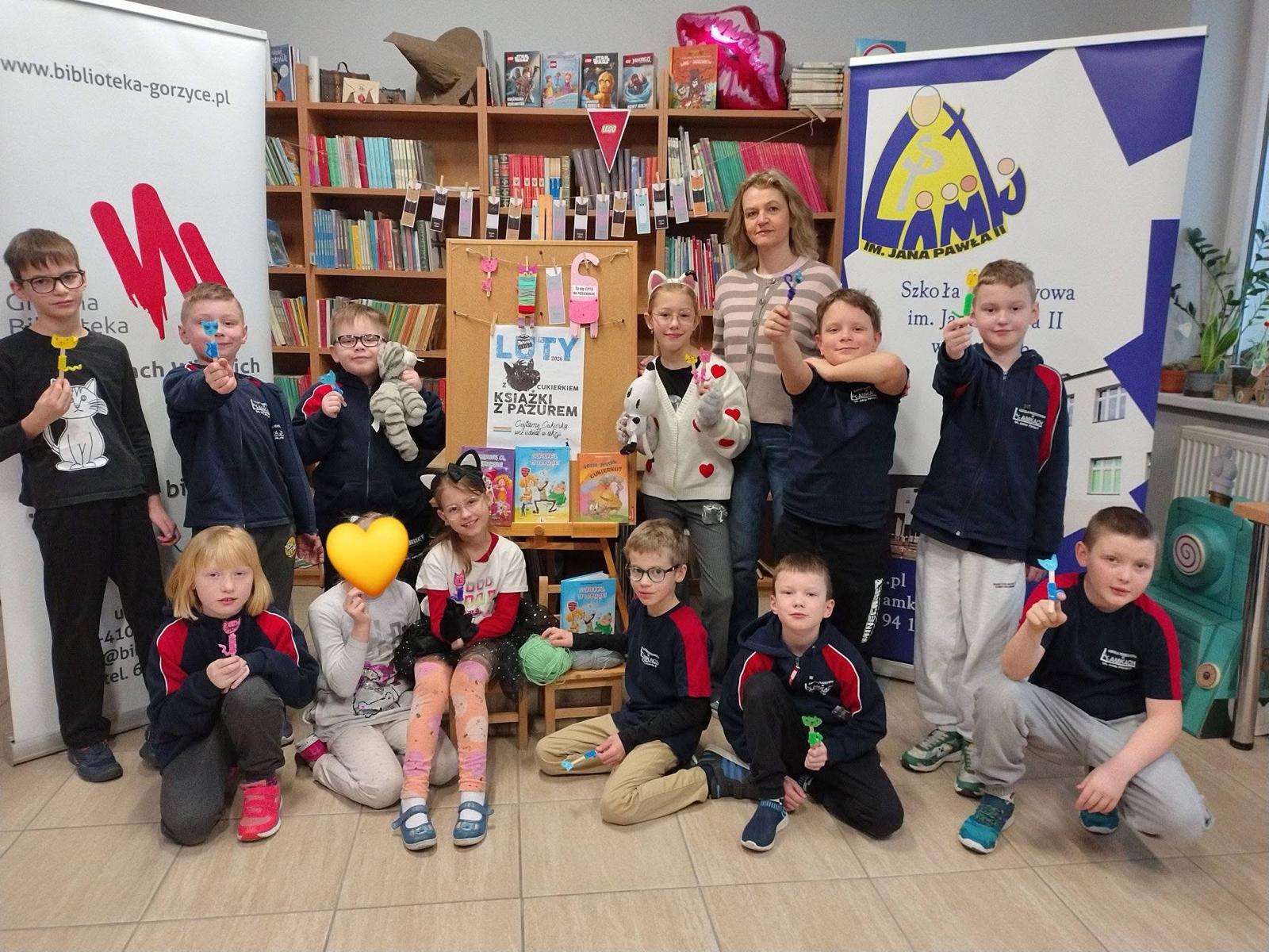 W lutym nasza biblioteka zamieniła się w krainę kocich przygód! Wszystko za sprawą ogólnopolskiej akcji czytelniczej „Luty z Cukierkiem – Książki z Pazurem”, organizowanej przez Wydawnictwo Żwakowskie. Głównym bohaterem naszych spotkań został nie kto inny, jak Cukierek – najbardziej niesforny, pręgowany dachowiec na świecie, stworzony przez Waldemara Cichonia.