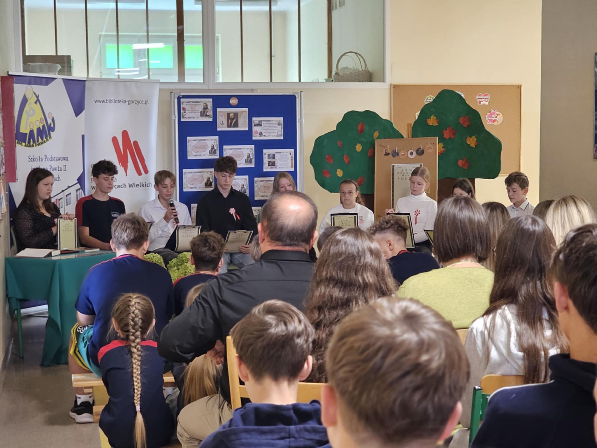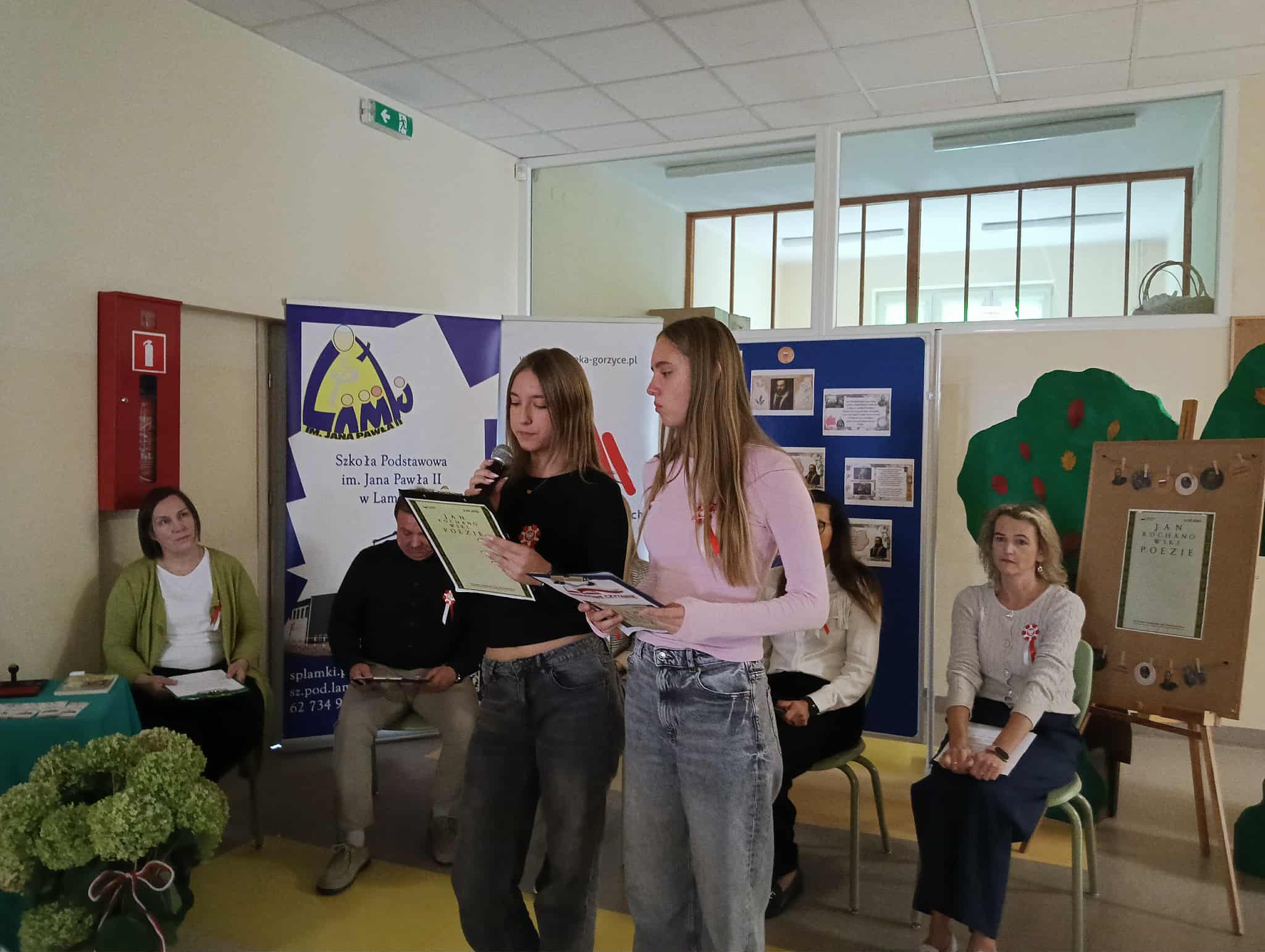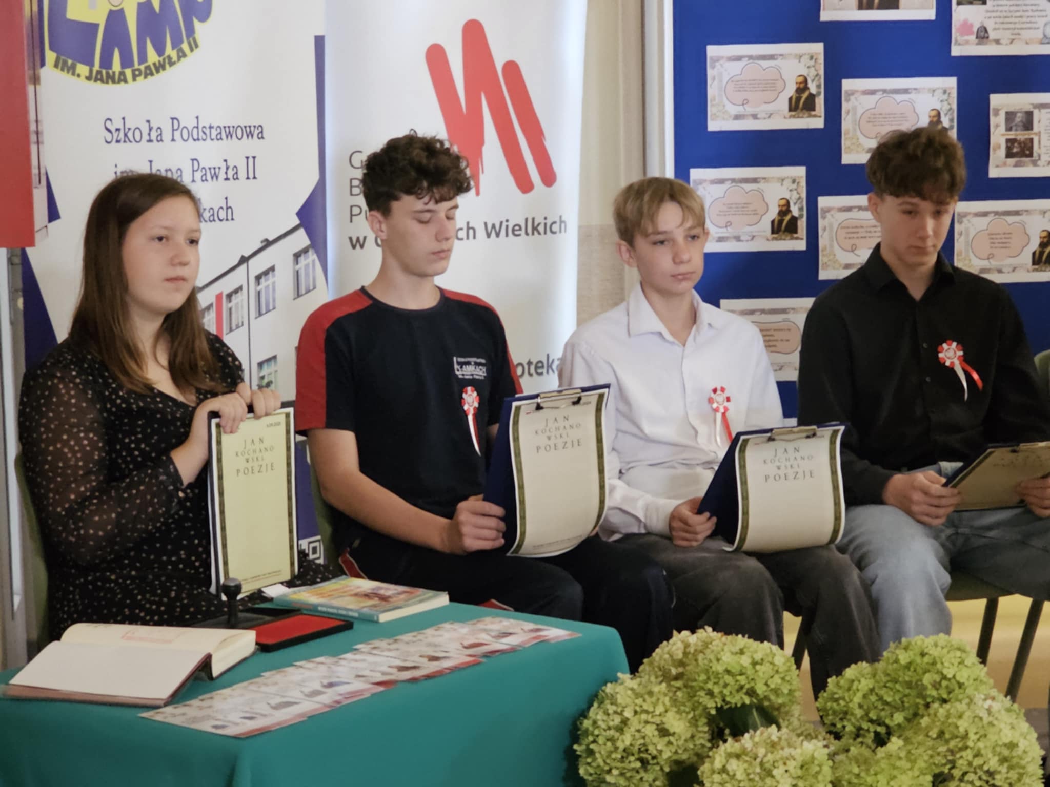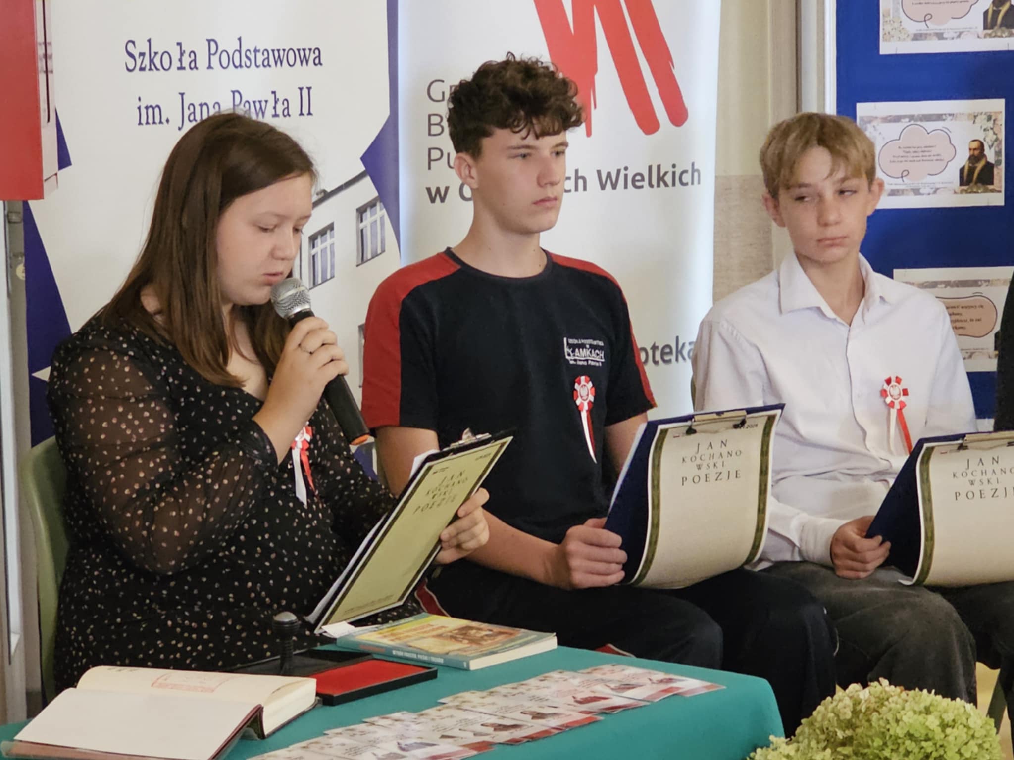 W poniedziałkowe przedpołudnie 29 września odbyło się w naszej szkole Narodowe Czytanie. Chociaż tradycję czytania dzieł znanych poetów i pisarzy polskich zainicjował już w 2012 roku ówczesny prezydent RP lekturą „Pan Tadeusz”, u nas czytanie odbyło się po raz pierwszy. W tym roku lekturą Narodowego Czytania była poezja Jana Kochanowskiego. To jeden z najwybitniejszych poetów i największych twórców europejskich epoki renesansu. Poezja Kochanowskiego porusza różnorodne tematy - od poważnych i doniosłych po lżejsze, refleksje moralne, nawiązania antyczne i biblijne. W wierszach odnajdujemy humanistyczną religijność, zachwyt życiem, ale też głęboką zadumę nad przemijaniem i ludzkim losem. Twórczość Kochanowskiego to m.in. treny poświęcone zmarłej córce, pieśni oraz prezentowane dziś fraszki, rymowane, krótkie utwory napisane w żartobliwy sposób, czasem złośliwy, zakończone puentą, czasem zaskakujące czytelnika. W pięknej, klimatycznej scenografii fraszki prezentowali uczniowie: Anastazja Borowczyk, Mateusz Kurkiewicz, Jakub Kruszyk, Adrian Grzesiak, Maja Rusek, Jagoda Pilarska, Gabriela Marciniak, Lena Strzelecka, Kacper Nyklewicz, a także: dyrektor Szkoły Podstawowej im. Jana Pawła II w Lamkach pan Tomasz Mocek, pani Joanna Wybierała, pani Izabela Stasiak oraz bibliotekarki, pani Sylwia Szymczak i pani Anita Kaczmarek z zaprzyjaźnionej biblioteki w Gorzycach Wielkich z filią w Lamkach. Nastrój był podniosły, uczniowe wraz z wychowawcami zasłuchani i skupieni. Po zakończeniu spotkania można było „ozdobić” swój prywatny tomik wierszy Jana Kochanowskiego pamiątkową pieczęcią z tegorocznego Narodowego Czytania. Z pewnością takie spotkania od dziś staną się tradycją w naszej szkole. S.Sz.