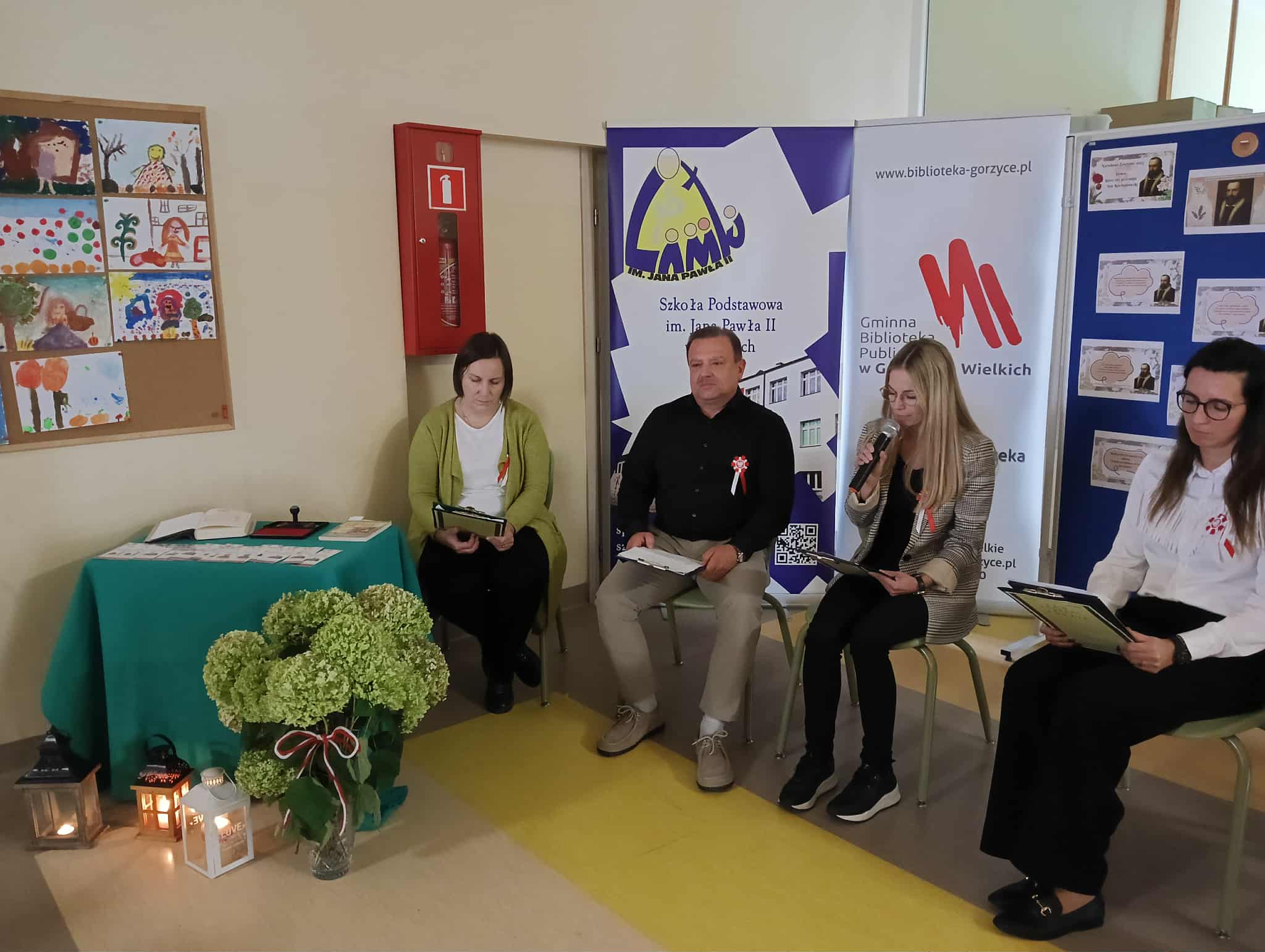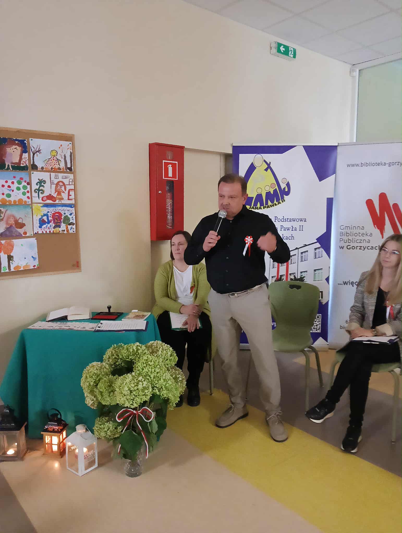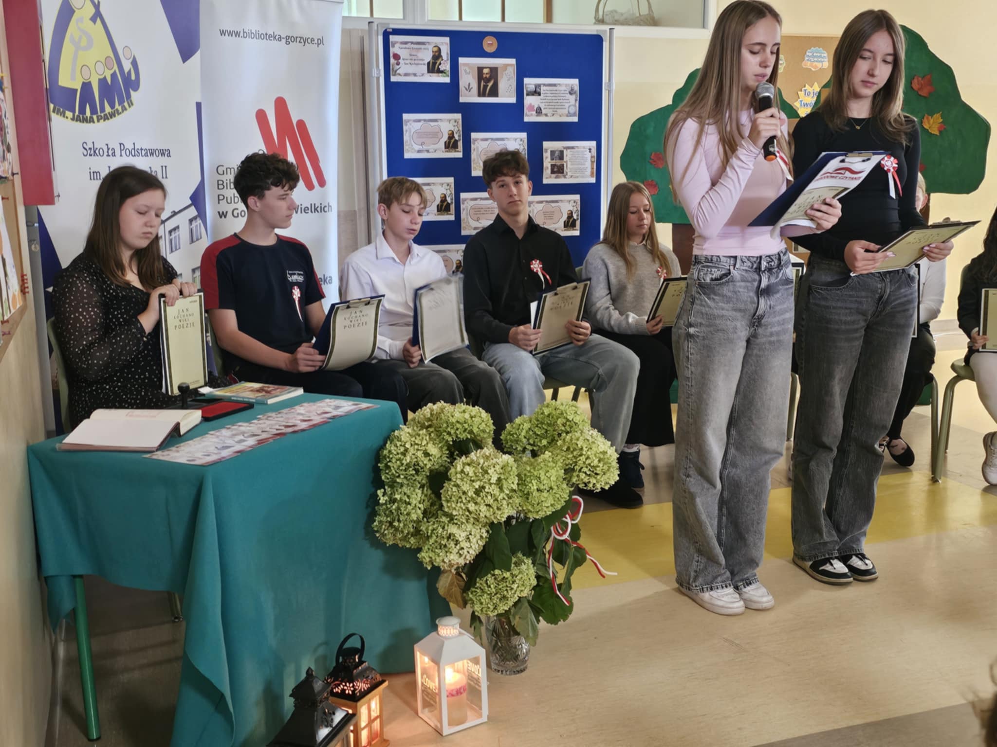 W poniedziałkowe przedpołudnie 29 września odbyło się w naszej szkole Narodowe Czytanie. Chociaż tradycję czytania dzieł znanych poetów i pisarzy polskich zainicjował już w 2012 roku ówczesny prezydent RP lekturą „Pan Tadeusz”, u nas czytanie odbyło się po raz pierwszy. W tym roku lekturą Narodowego Czytania była poezja Jana Kochanowskiego. To jeden z najwybitniejszych poetów i największych twórców europejskich epoki renesansu. Poezja Kochanowskiego porusza różnorodne tematy - od poważnych i doniosłych po lżejsze, refleksje moralne, nawiązania antyczne i biblijne. W wierszach odnajdujemy humanistyczną religijność, zachwyt życiem, ale też głęboką zadumę nad przemijaniem i ludzkim losem. Twórczość Kochanowskiego to m.in. treny poświęcone zmarłej córce, pieśni oraz prezentowane dziś fraszki, rymowane, krótkie utwory napisane w żartobliwy sposób, czasem złośliwy, zakończone puentą, czasem zaskakujące czytelnika. W pięknej, klimatycznej scenografii fraszki prezentowali uczniowie: Anastazja Borowczyk, Mateusz Kurkiewicz, Jakub Kruszyk, Adrian Grzesiak, Maja Rusek, Jagoda Pilarska, Gabriela Marciniak, Lena Strzelecka, Kacper Nyklewicz, a także: dyrektor Szkoły Podstawowej im. Jana Pawła II w Lamkach pan Tomasz Mocek, pani Joanna Wybierała, pani Izabela Stasiak oraz bibliotekarki, pani Sylwia Szymczak i pani Anita Kaczmarek z zaprzyjaźnionej biblioteki w Gorzycach Wielkich z filią w Lamkach. Nastrój był podniosły, uczniowe wraz z wychowawcami zasłuchani i skupieni. Po zakończeniu spotkania można było „ozdobić” swój prywatny tomik wierszy Jana Kochanowskiego pamiątkową pieczęcią z tegorocznego Narodowego Czytania. Z pewnością takie spotkania od dziś staną się tradycją w naszej szkole. S.Sz.