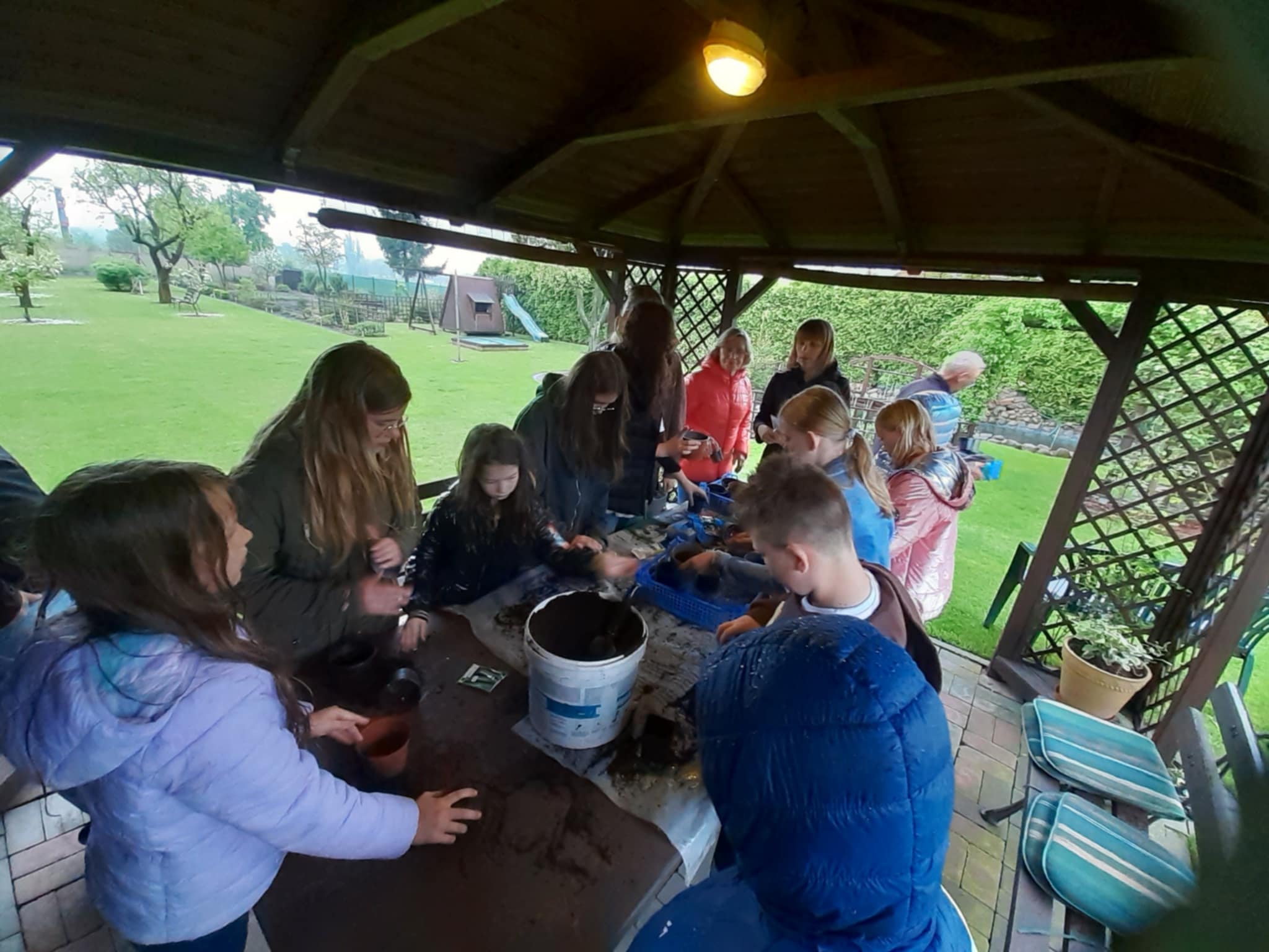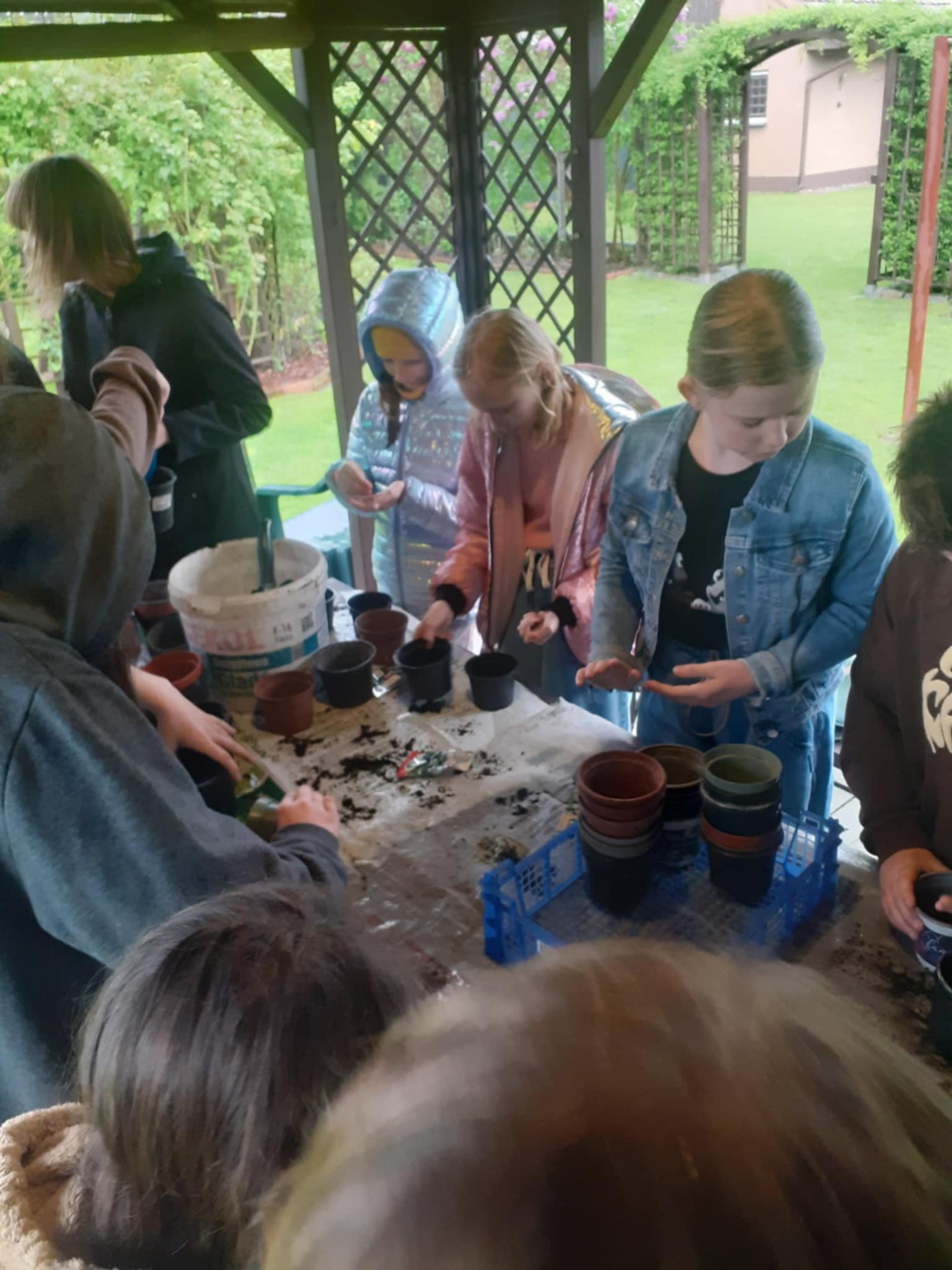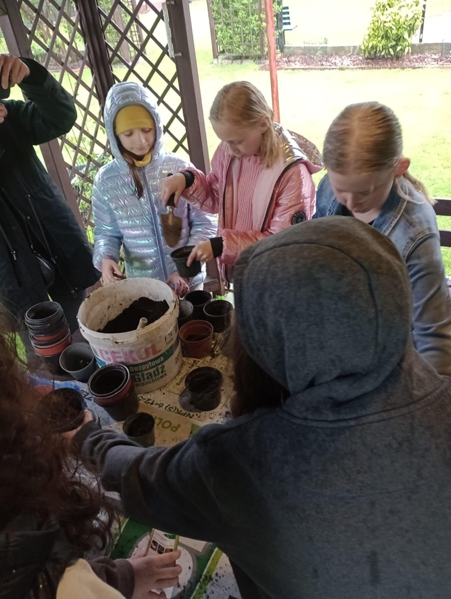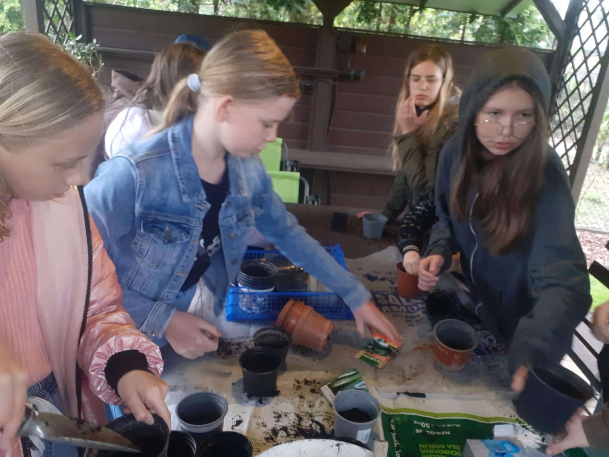 Praca przebiegała sprawnie, doniczki zapełniały się ziemią z nasionkami. A dlaczego