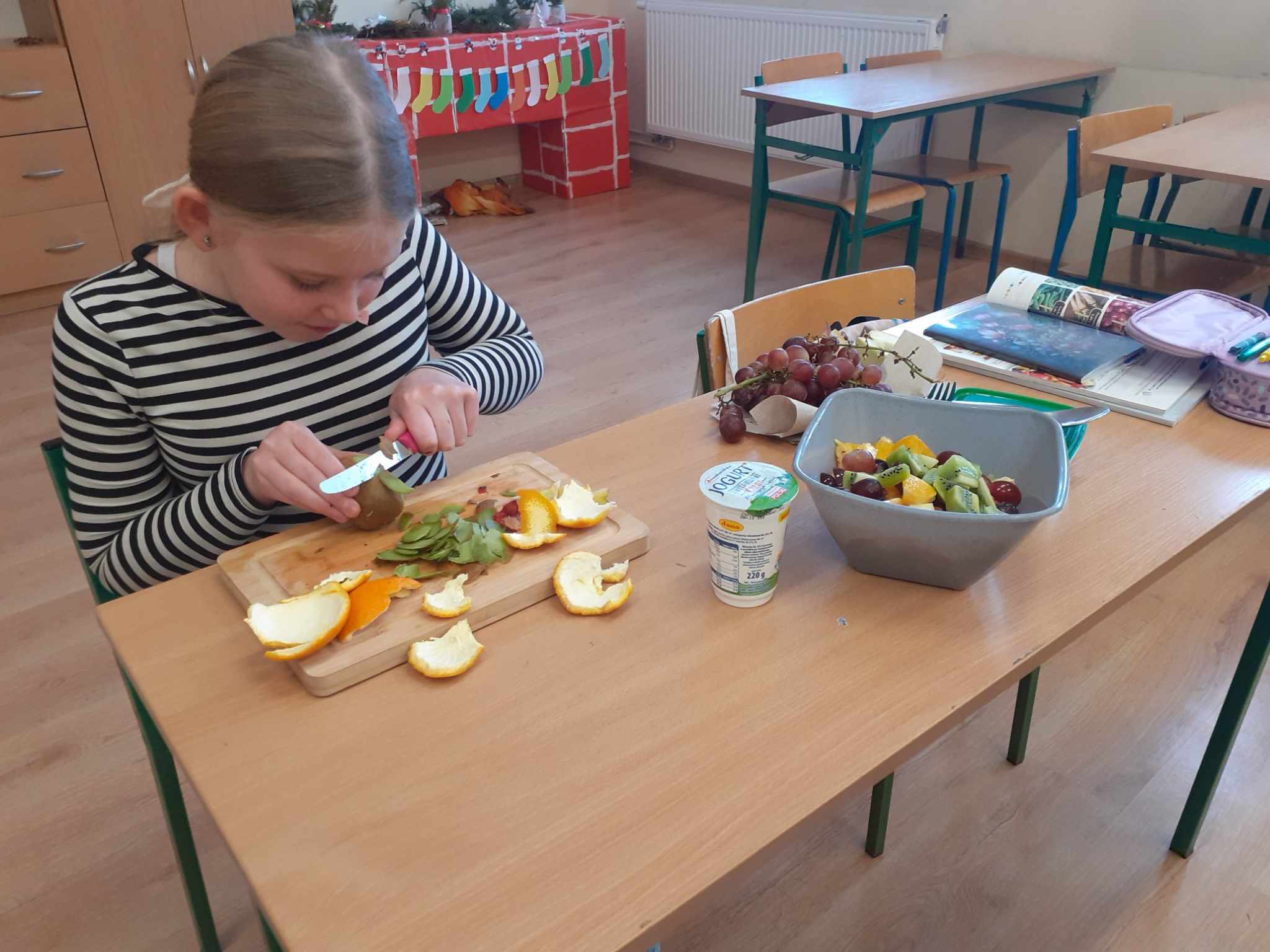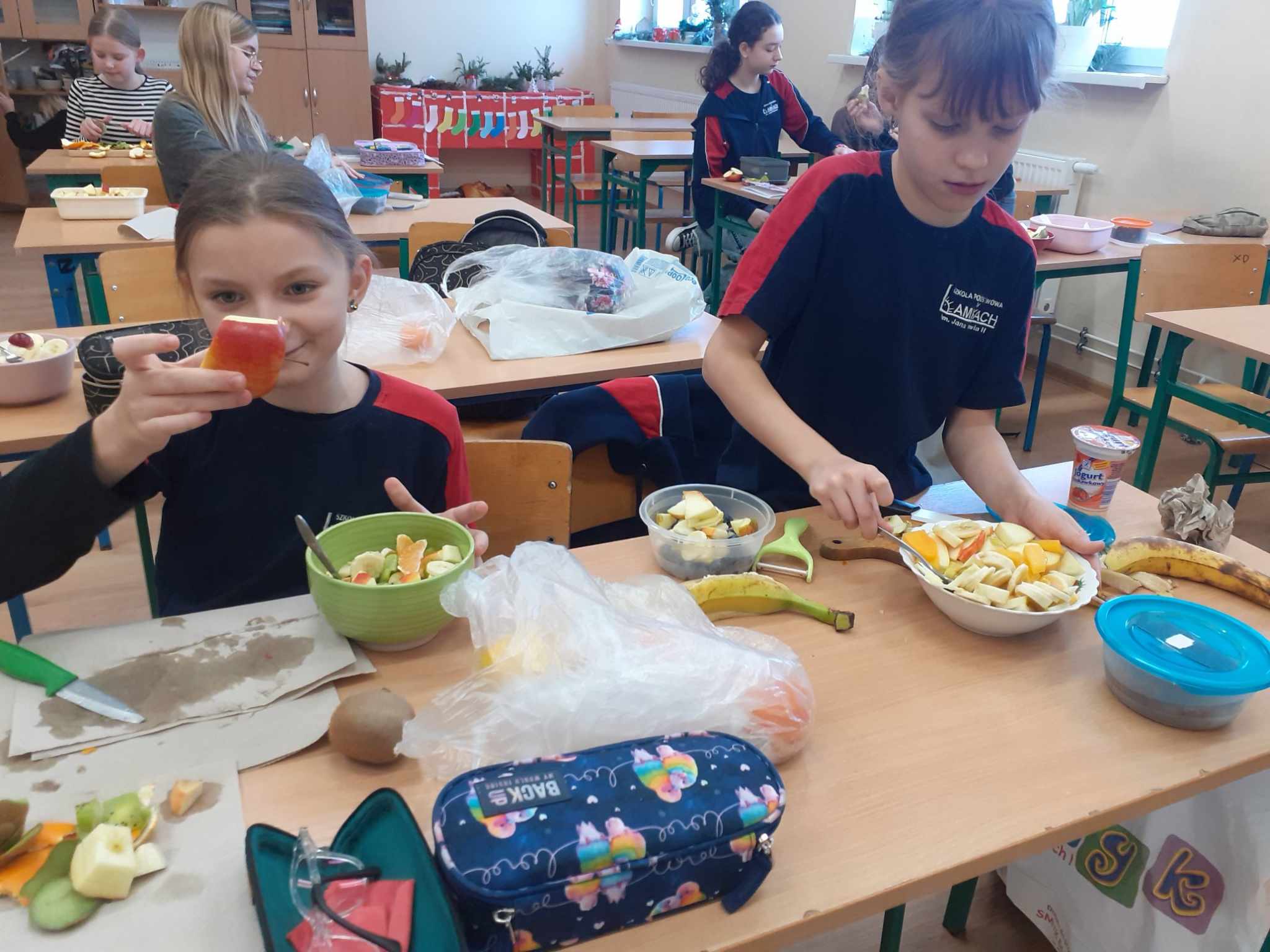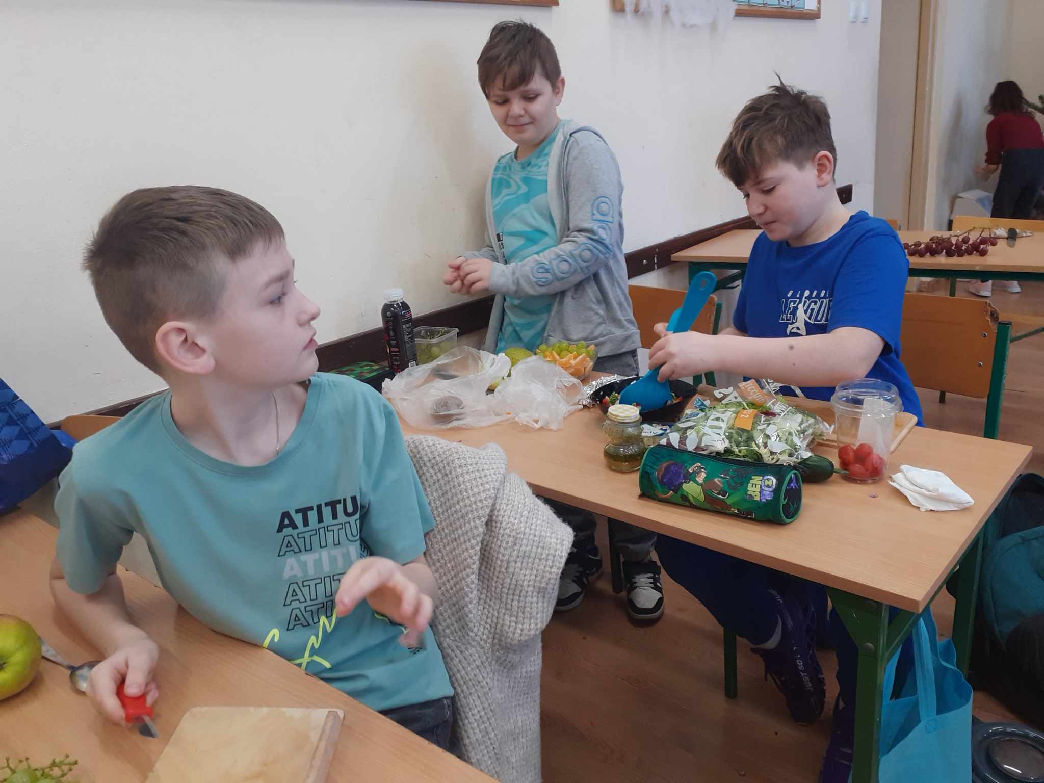 Ostatnio dobrą ku temu okazją stała się lekcja języka niemieckiego. Uczniowie mieli do wyboru wykonać sałatkę owocową lub warzywną. Ich głównym jednak zadaniem było przedstawienie ustne przepisów tychże potraw w języku obcym. Piątoklasiści wykazali się znajomością potrzebnego słownictwa w stopniu zadowalającym.