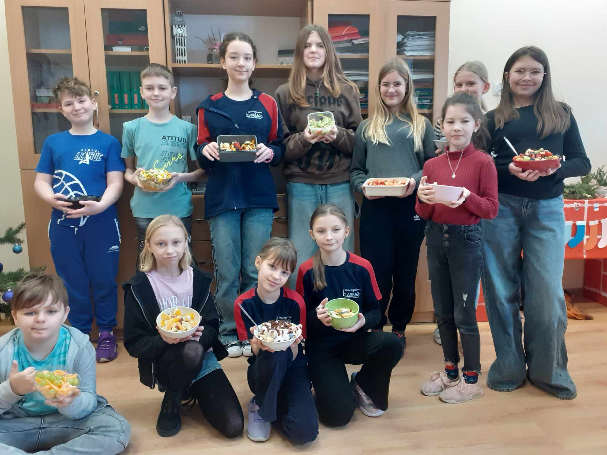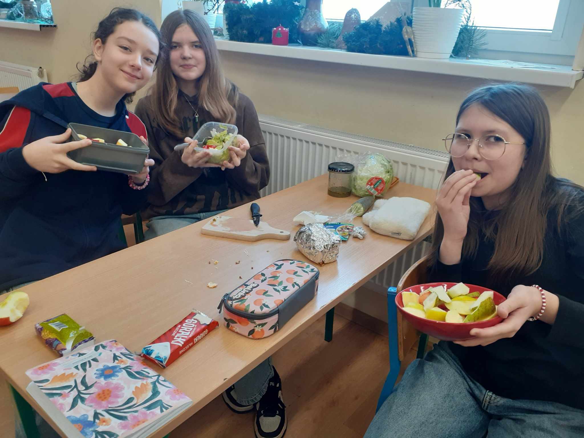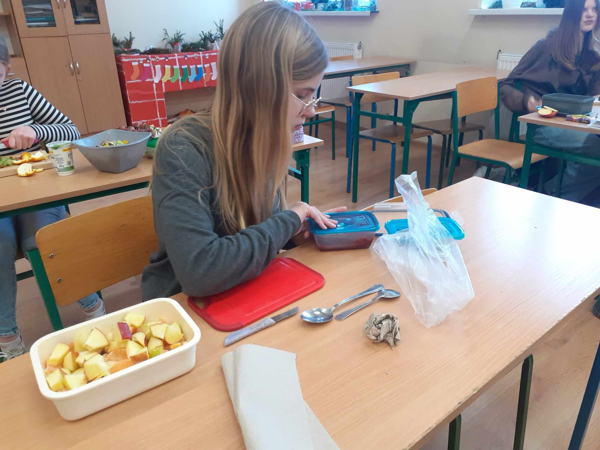Ostatnio dobrą ku temu okazją stała się lekcja języka niemieckiego. Uczniowie mieli do wyboru wykonać sałatkę owocową lub warzywną. Ich głównym jednak zadaniem było przedstawienie ustne przepisów tychże potraw w języku obcym. Piątoklasiści wykazali się znajomością potrzebnego słownictwa w stopniu zadowalającym.
