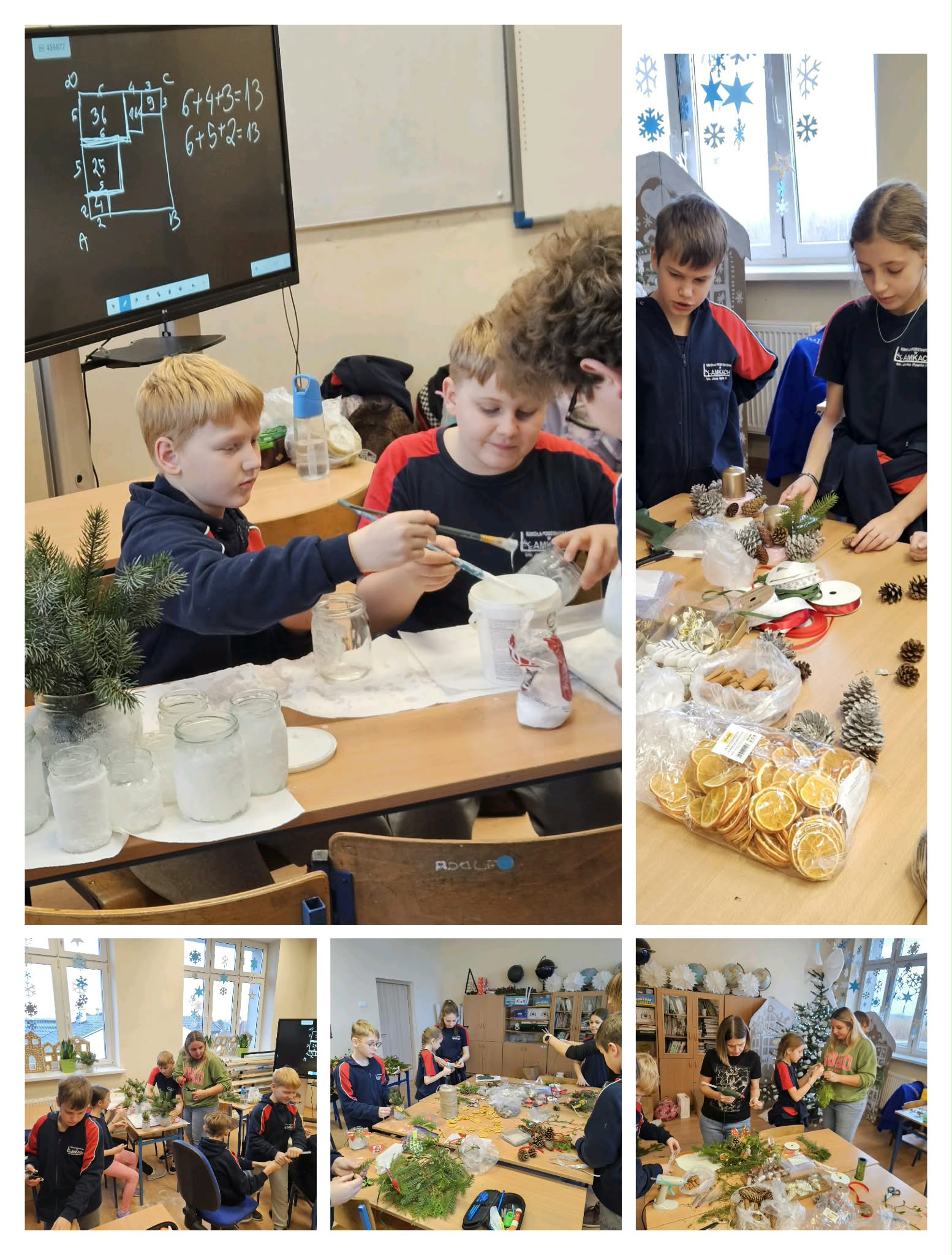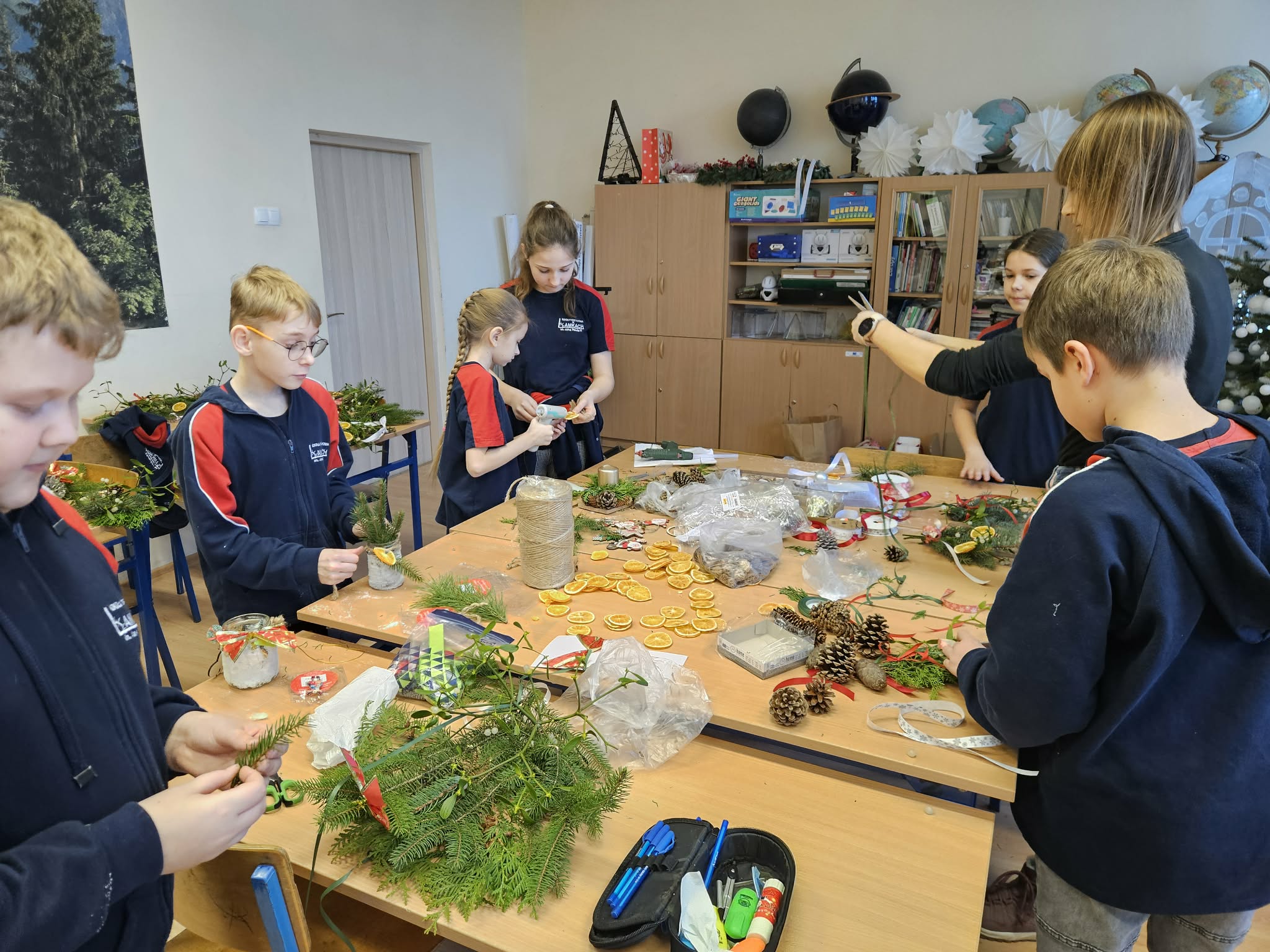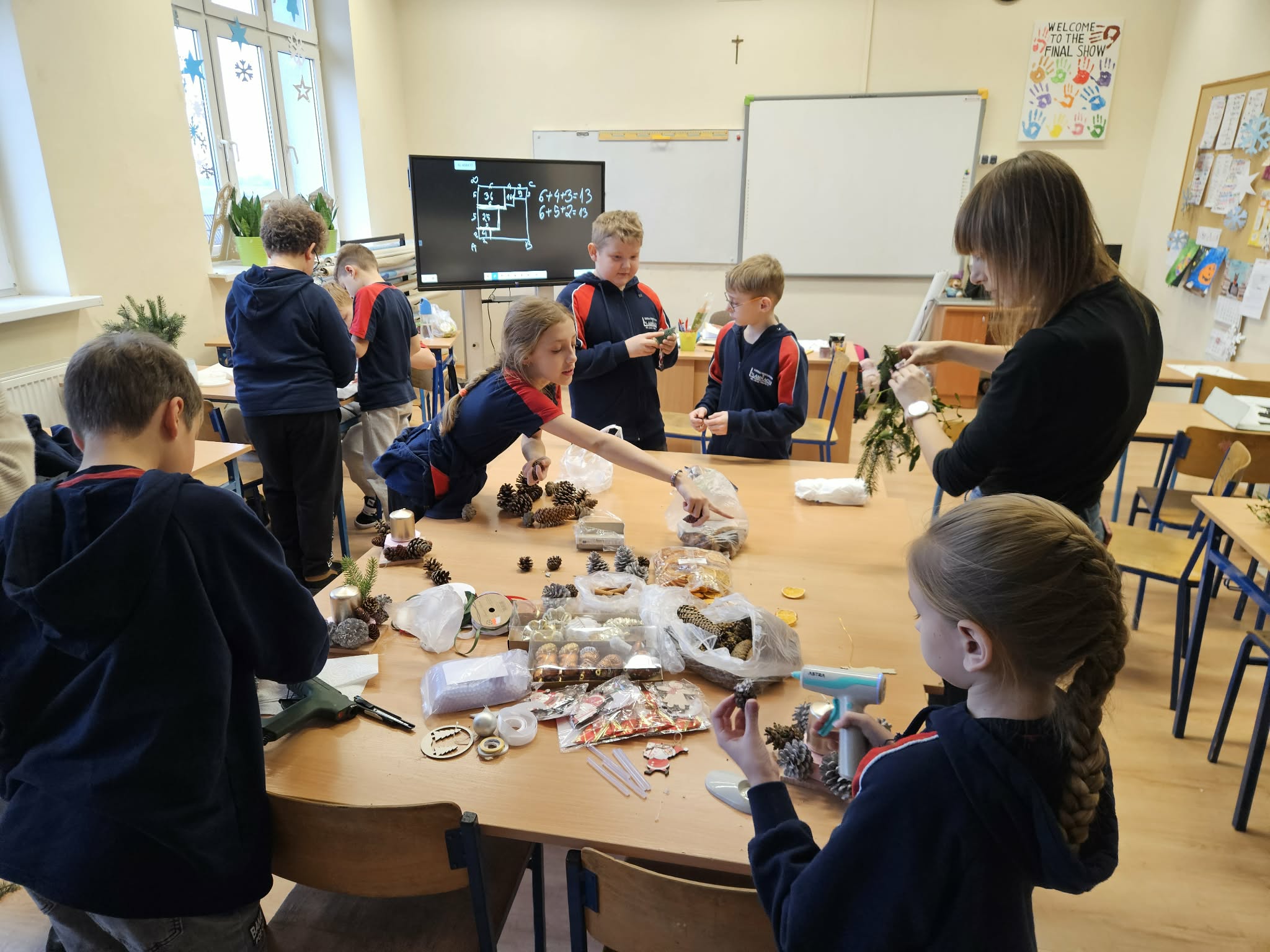 W naszej klasie zapanowała prawdziwie magiczna, świąteczna atmosfera. Uczniowie wraz ze swoimi mamami wzięli udział w warsztatach tworzenia bożonarodzeniowych ozdób. Podczas spotkania powstawały niezwykłe dekoracje z naturalnych materiałów: jemioły, gałązek świerku, szyszek oraz kolorowych wstążek. Dzieci chętnie sięgały również po figurki Mikołajów i błyszczące gwiazdki, dzięki którym każda ozdoba nabierała wyjątkowego charakteru. Dużym zainteresowaniem cieszyło się tworzenie świątecznych słoików pokrytych sztucznym śniegiem. Zdolni twórcy z ogromnym zaangażowaniem dekorowali je, tworząc piękne lampiony i stroiki, które z pewnością ozdobią ich domy na czas świąt. Nie zabrakło także tradycyjnych stroików – pełnych zieleni, zapachu świerku i własnoręcznie wykonanych dodatków. Wspólna praca dzieci i mam sprawiła, że każde z tych dzieł było niepowtarzalne. Warsztaty okazały się doskonałą okazją spędzenia czasu w ciepłej, rodzinnej atmosferze oraz wprowadzenia się w świąteczny nastrój. Dziękujemy wszystkim mamom za pomoc i wspólne tworzenie wyjątkowych chwil. Do podziwiania i zakupu ozdób zapraszamy na jarmarku.