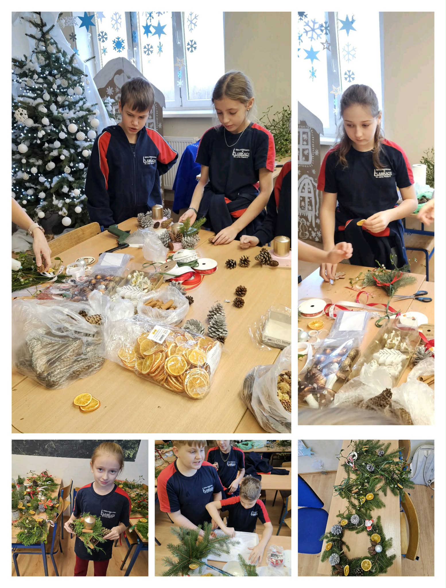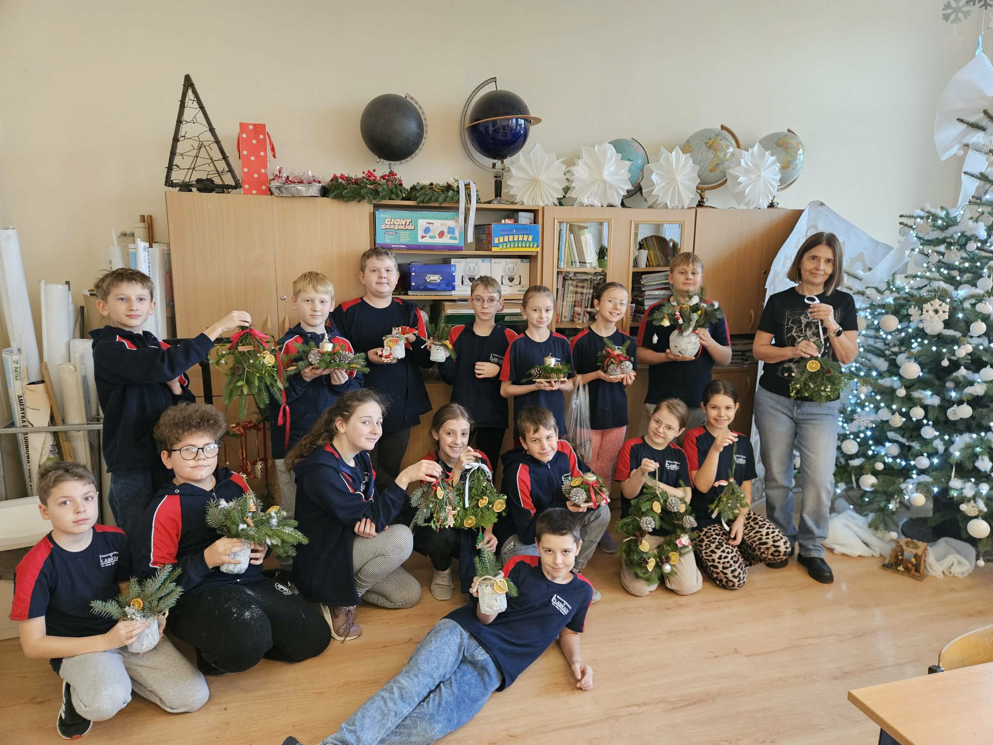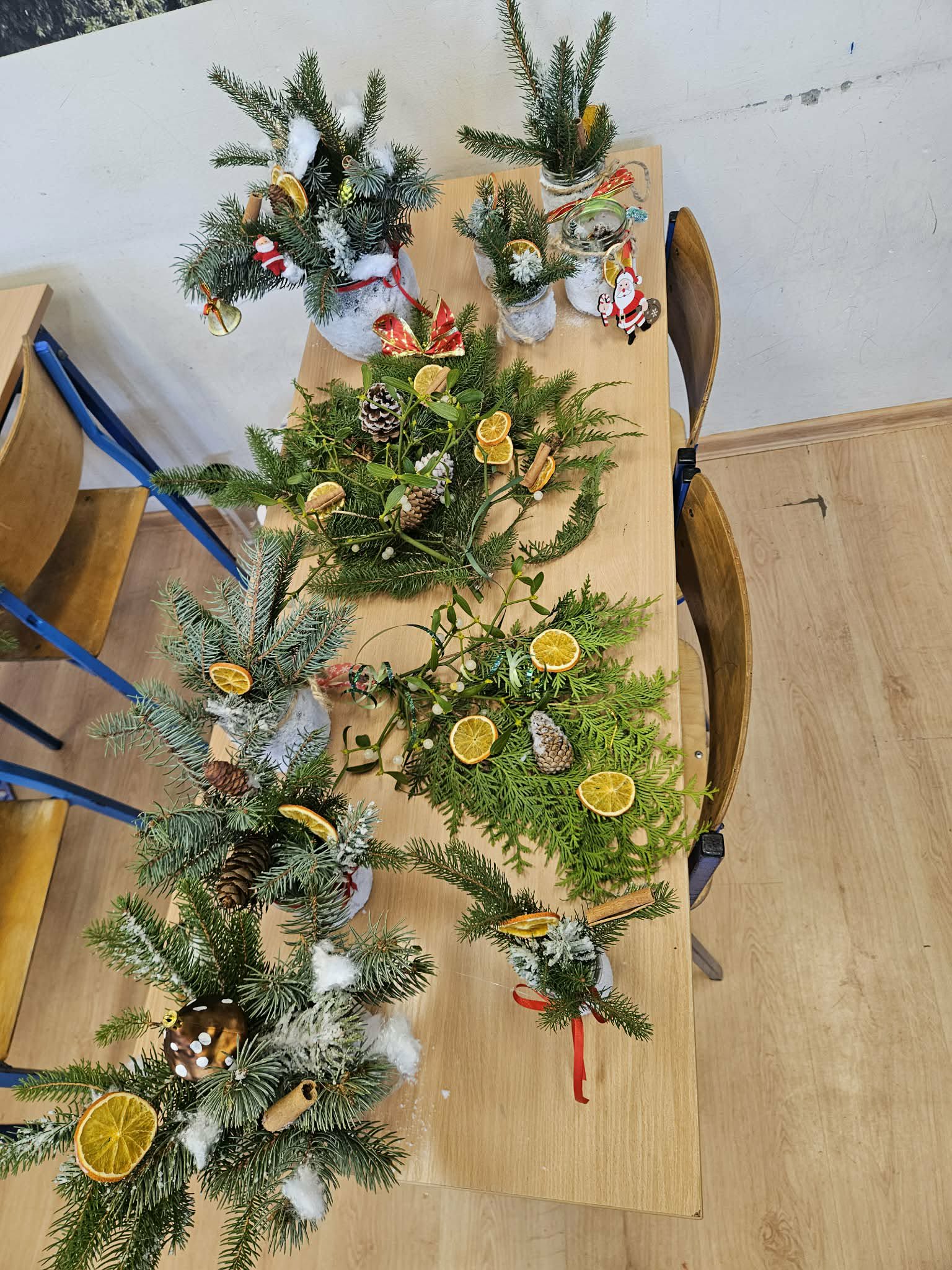 W naszej klasie zapanowała prawdziwie magiczna, świąteczna atmosfera. Uczniowie wraz ze swoimi mamami wzięli udział w warsztatach tworzenia bożonarodzeniowych ozdób. Podczas spotkania powstawały niezwykłe dekoracje z naturalnych materiałów: jemioły, gałązek świerku, szyszek oraz kolorowych wstążek. Dzieci chętnie sięgały również po figurki Mikołajów i błyszczące gwiazdki, dzięki którym każda ozdoba nabierała wyjątkowego charakteru. Dużym zainteresowaniem cieszyło się tworzenie świątecznych słoików pokrytych sztucznym śniegiem. Zdolni twórcy z ogromnym zaangażowaniem dekorowali je, tworząc piękne lampiony i stroiki, które z pewnością ozdobią ich domy na czas świąt. Nie zabrakło także tradycyjnych stroików – pełnych zieleni, zapachu świerku i własnoręcznie wykonanych dodatków. Wspólna praca dzieci i mam sprawiła, że każde z tych dzieł było niepowtarzalne. Warsztaty okazały się doskonałą okazją spędzenia czasu w ciepłej, rodzinnej atmosferze oraz wprowadzenia się w świąteczny nastrój. Dziękujemy wszystkim mamom za pomoc i wspólne tworzenie wyjątkowych chwil. Do podziwiania i zakupu ozdób zapraszamy na jarmarku.