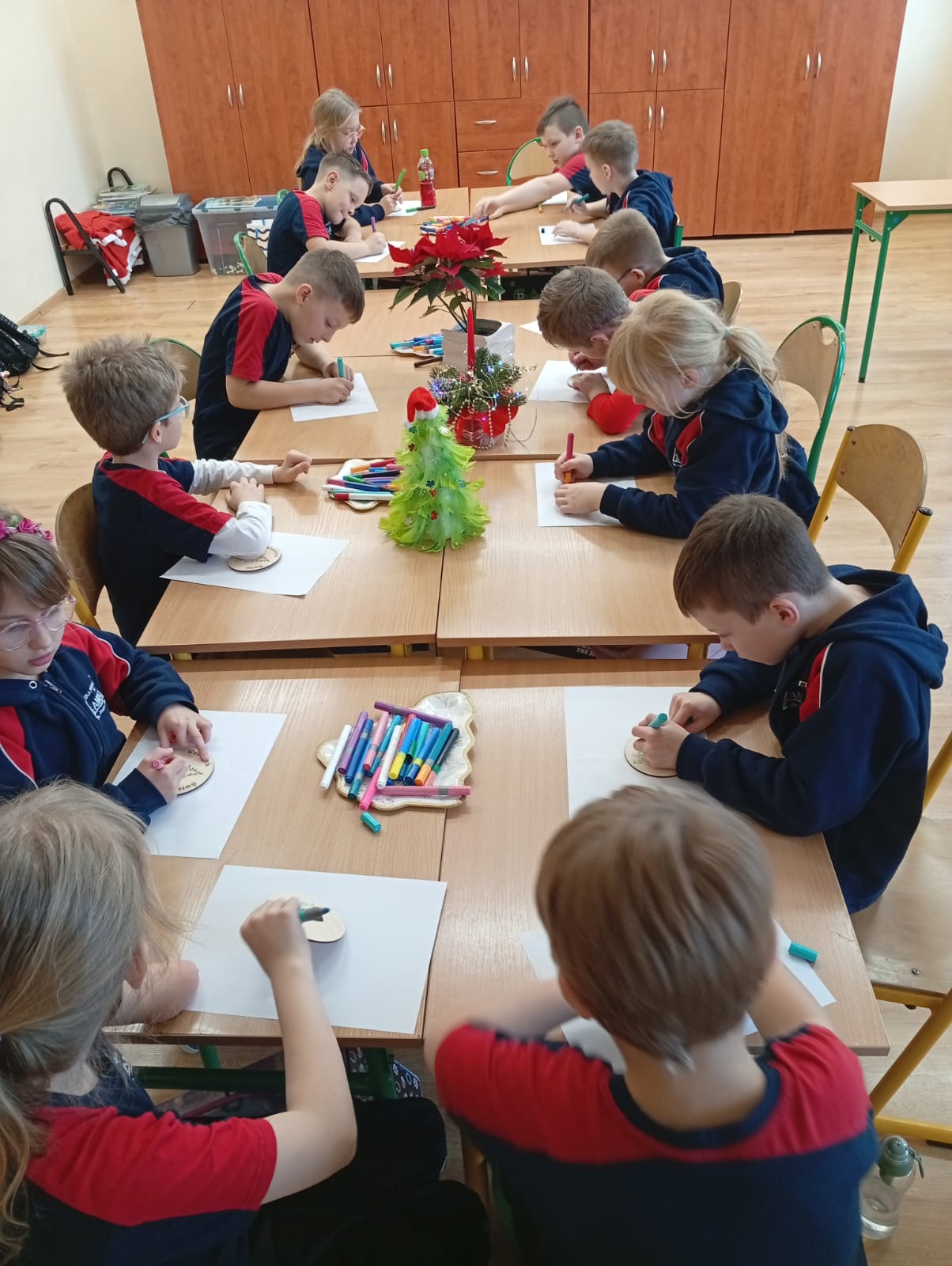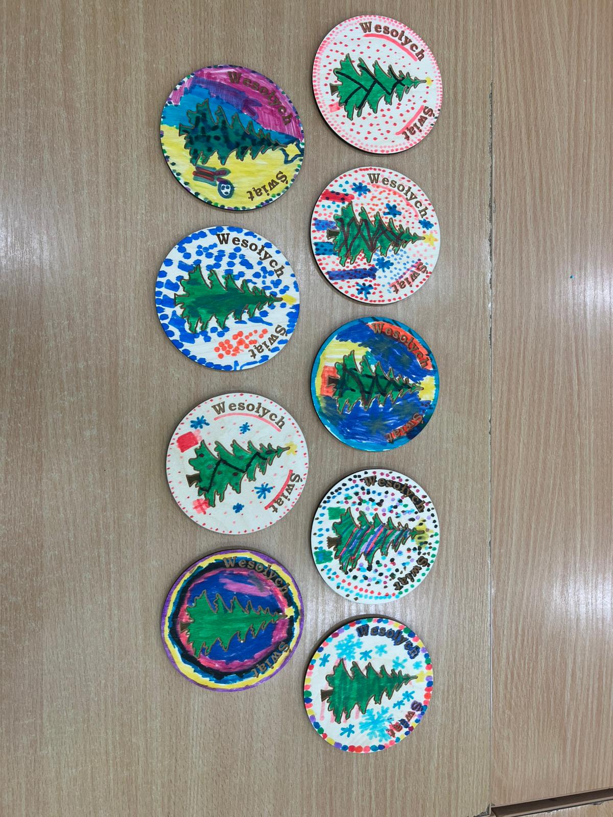 Integralną częścią spotkania były warsztaty plastyczne poświęcone ozdabianiu drewnianych bombek choinkowych. Każde dziecko miało możliwość samodzielnego wykonania świątecznej dekoracji. Uczniowie wykazali się dużą pomysłowością i starannością, tworząc unikatowe ozdoby, które z pewnością staną się piękną pamiątką.