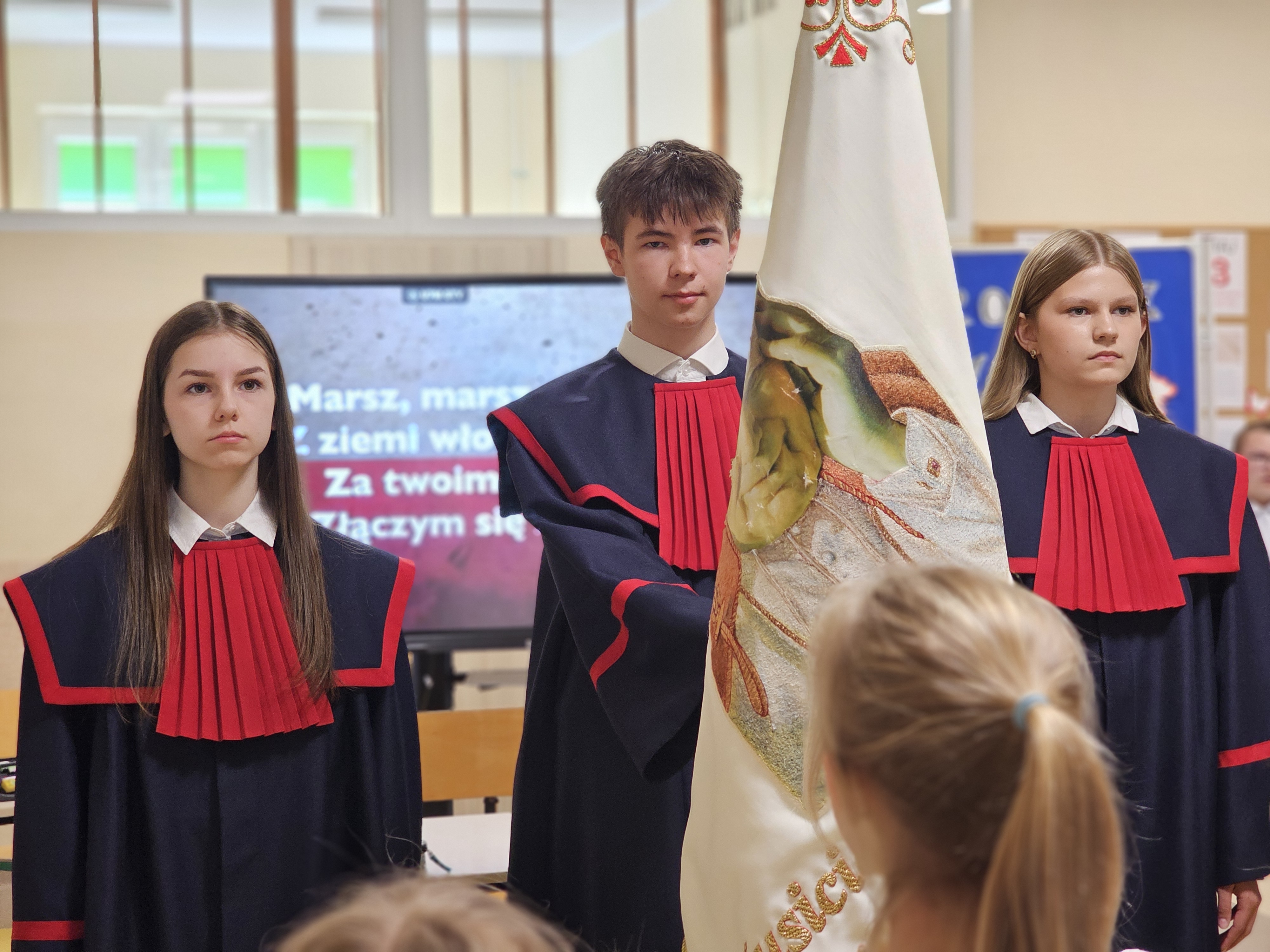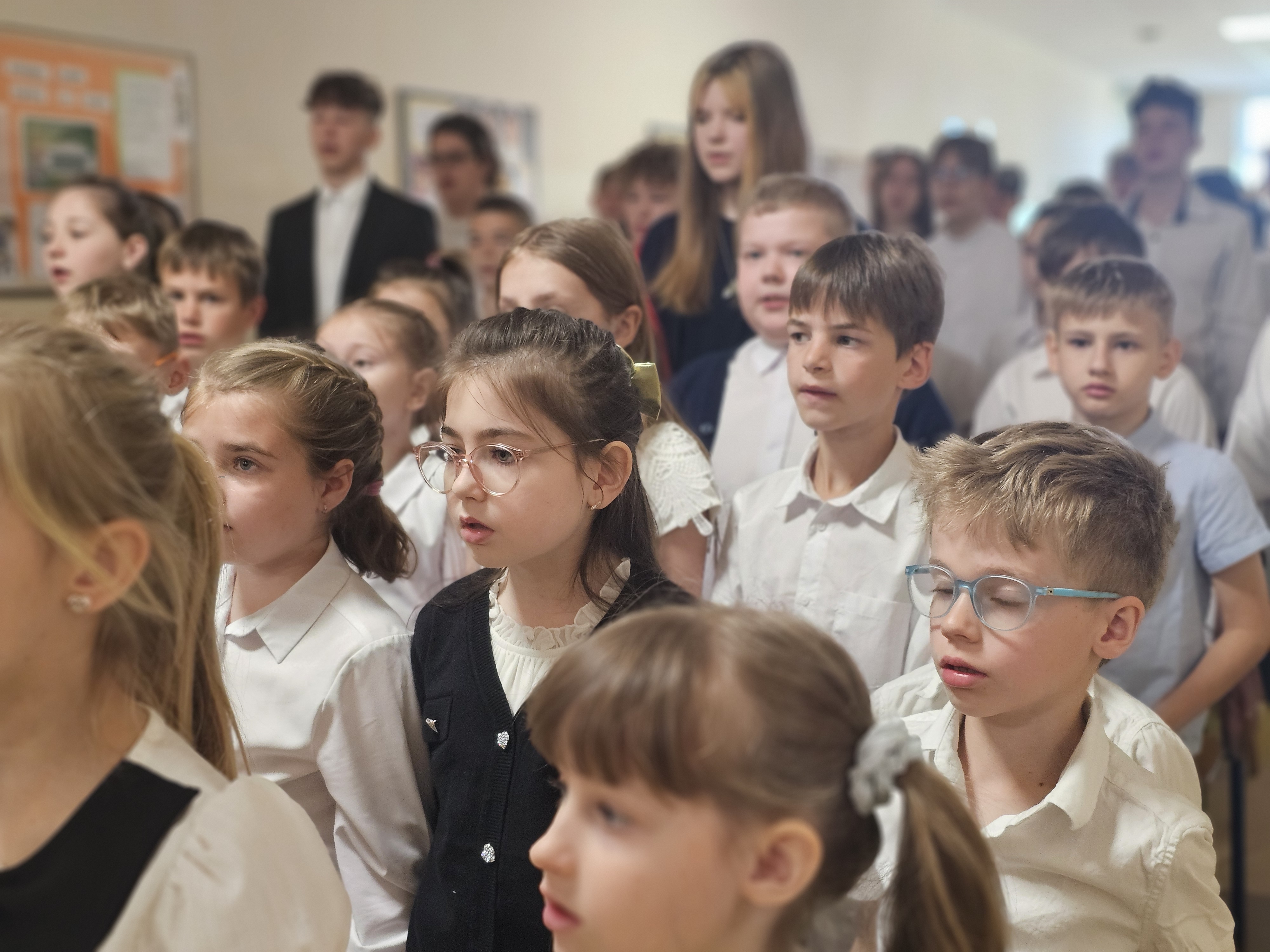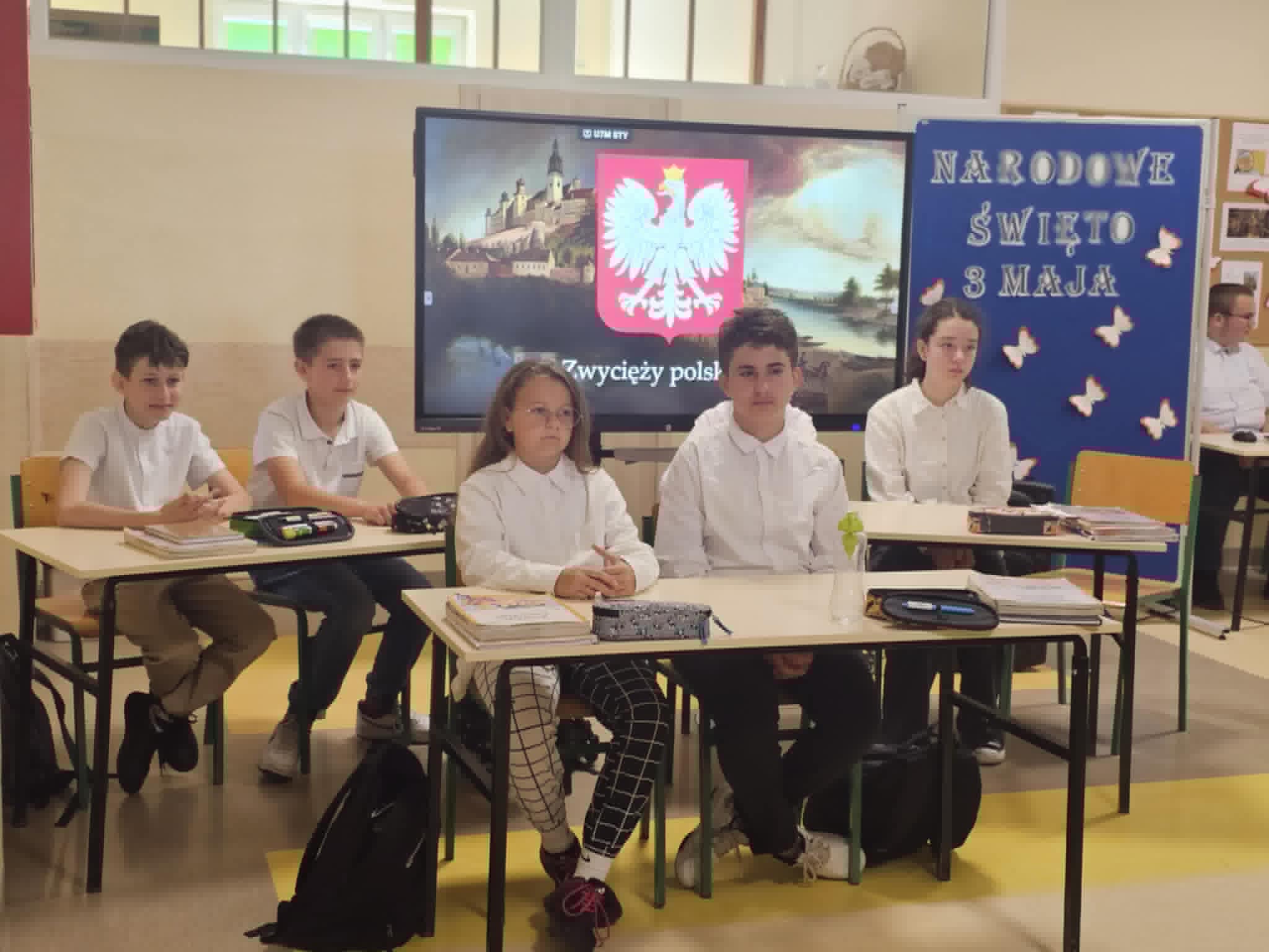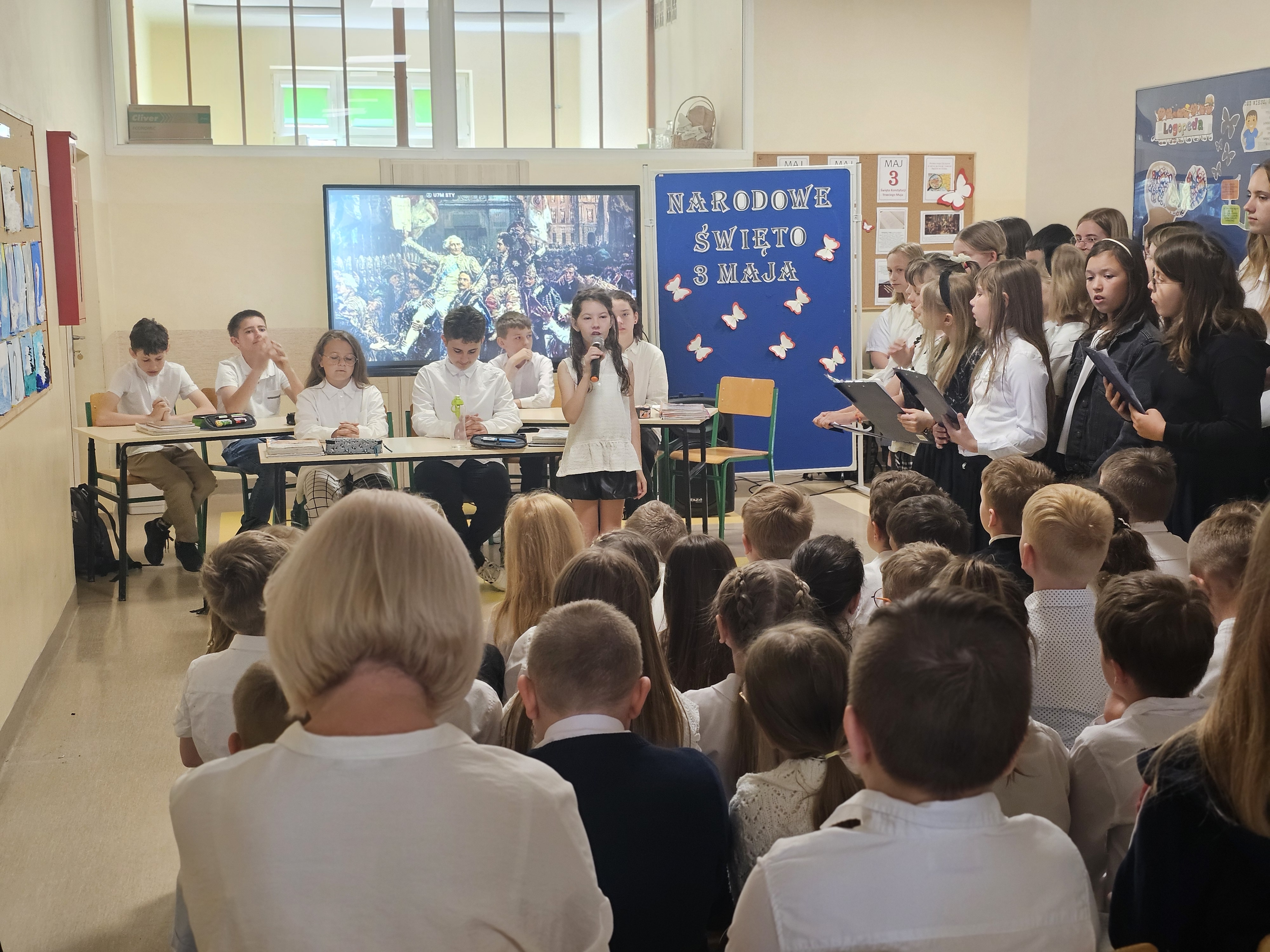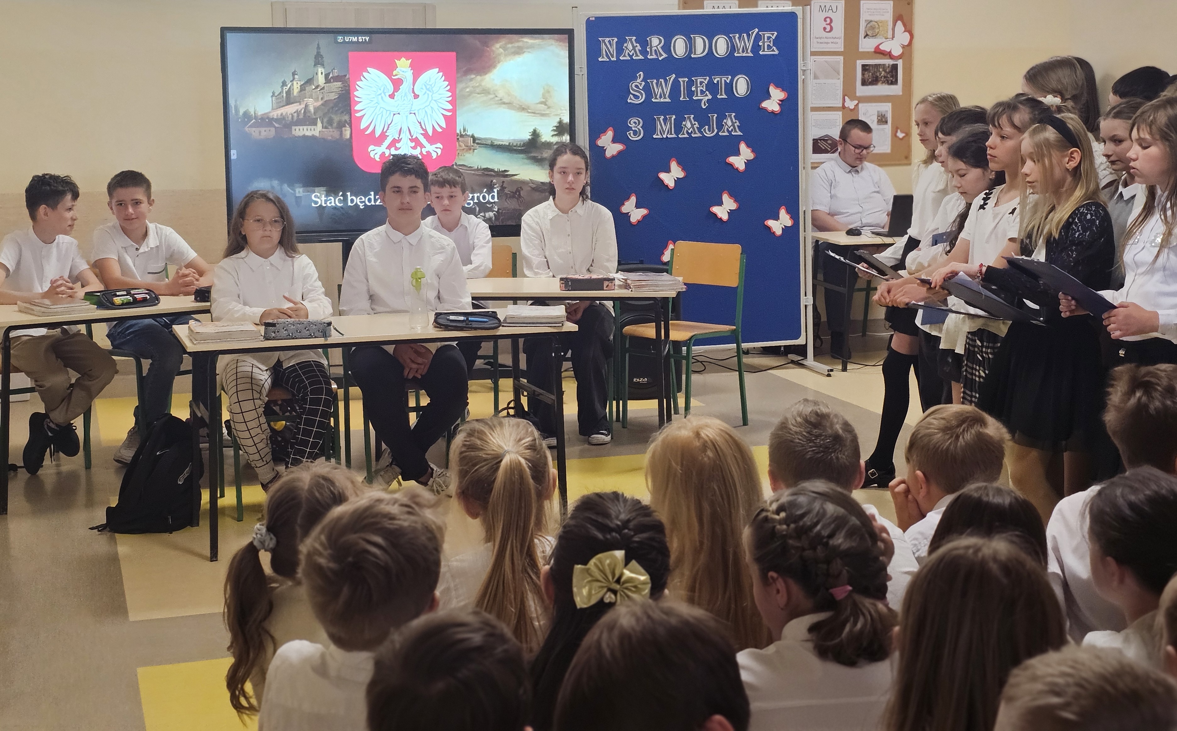 W przededniu świąt majowych cała społeczność szkolna uczestniczyła w uroczystej akademii. Apel upamiętniający kolejną rocznicę uchwalenia Konstytucji 3 Maja rozpoczął się od wprowadzenia sztandaru szkoły i odśpiewania hymnu narodowego. Następnie uczniowie klasy V i VI zaprezentowali montaż słowno – muzyczny, który przybliżył zebranym wydarzenia z 3 maja 1791 r. i pozwolił lepiej zrozumieć znaczenie tej najważniejszej w historii naszego kraju ustawy zasadniczej. Występ uświetnił szkolny chór, który wykonał pieśń „Mazurek 3 Maja”. Na koniec głos zabrał Pan Dyrektor, podkreślając, że celebrowanie majowych świąt to nasz patriotyczny obowiązek, a także przyjemność, ponieważ wolne dni można spędzić rodzinnie i skorzystać z różnorodnych atrakcji przygotowanych z tej okazji.