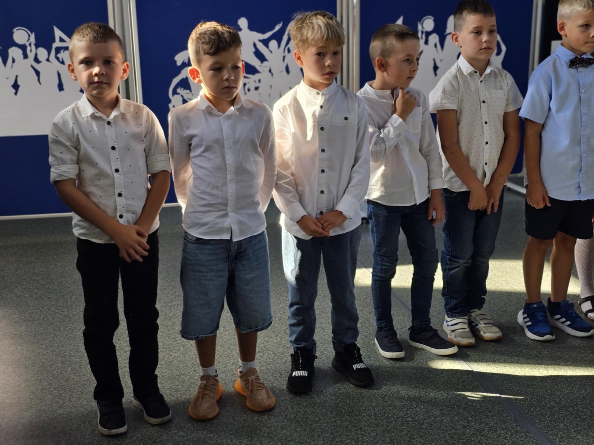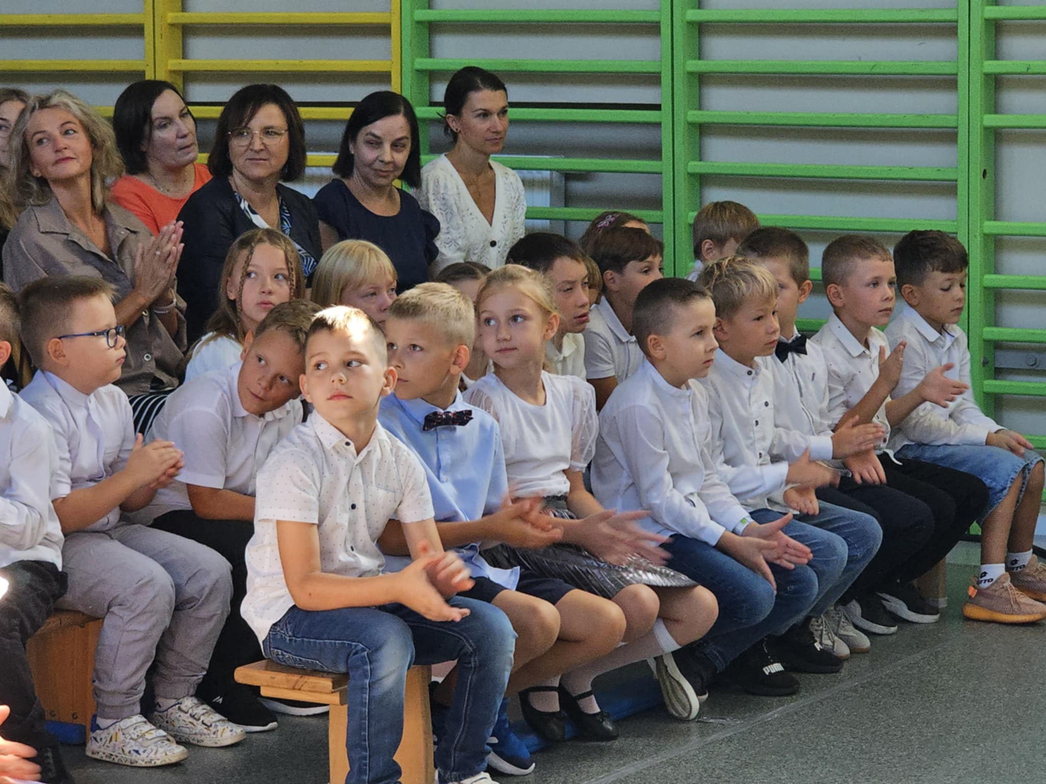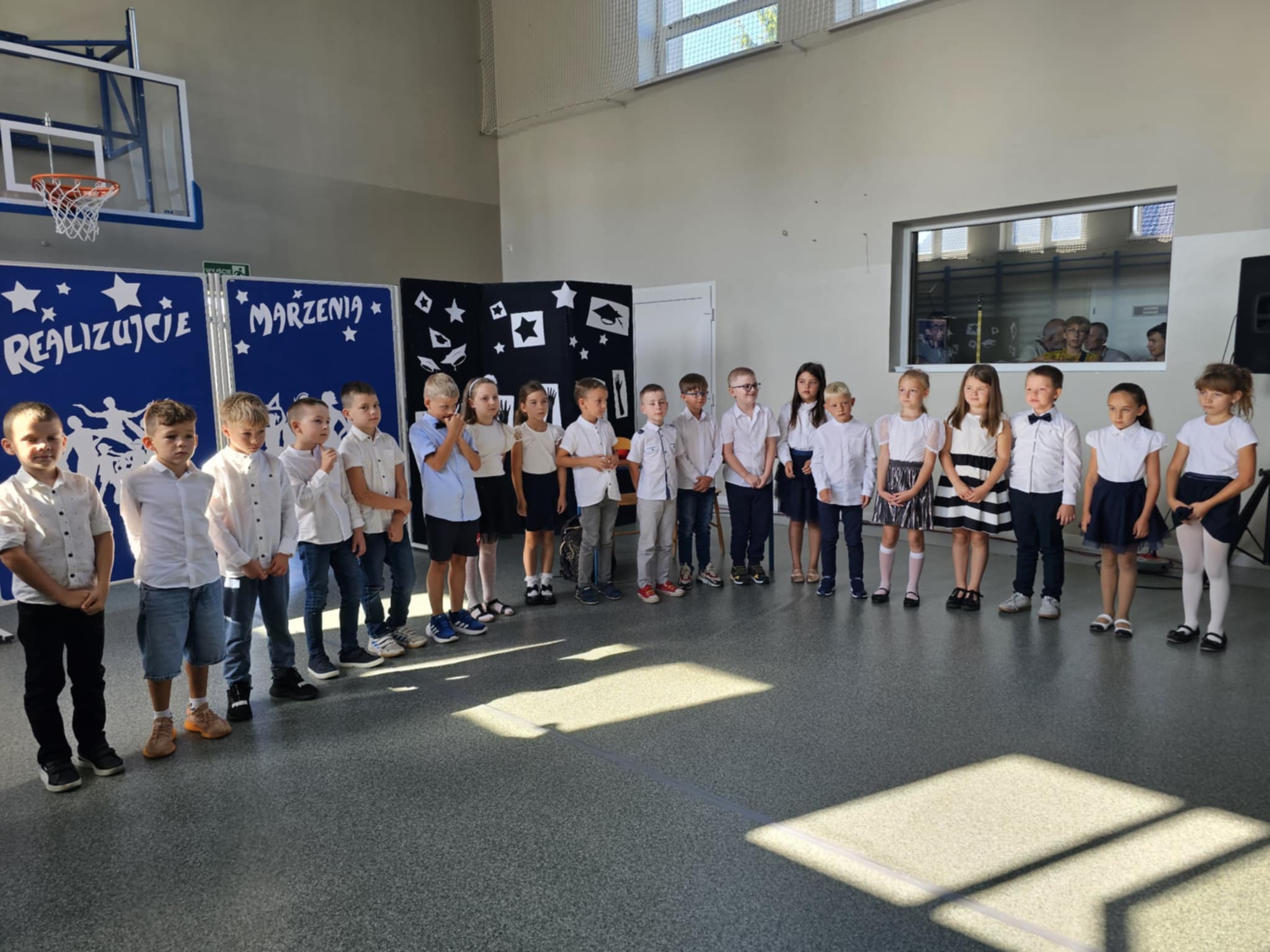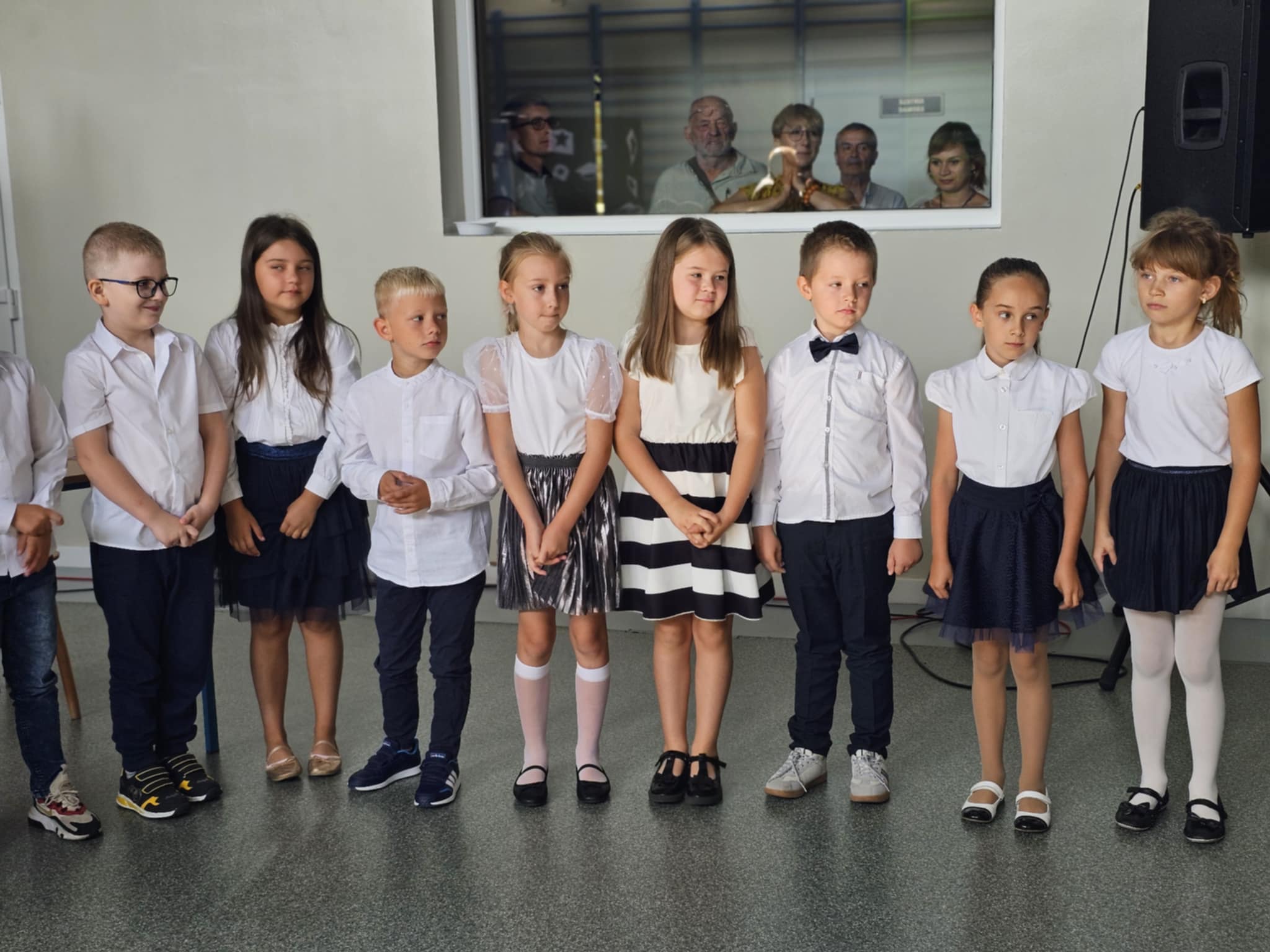 Podczas akademii swój pierwszy występ zaliczyli również nasi najmłodsi pierwszoklasisści; dzielnie wyszli na środek sali, uścisnęli dłoń z panem dyrektorem i z przyjemnością odebrali drobne upominki od Rady Rodziców.
