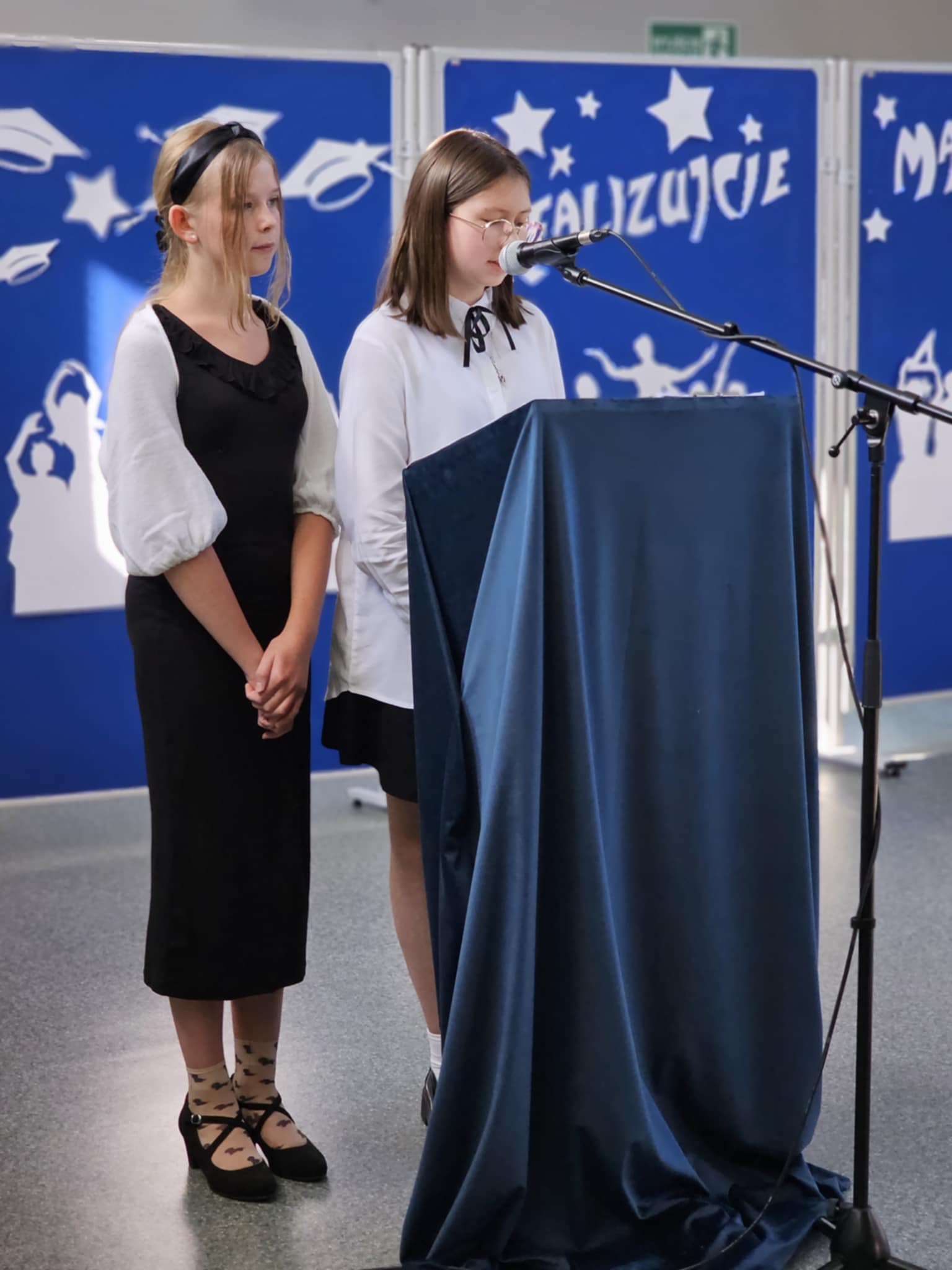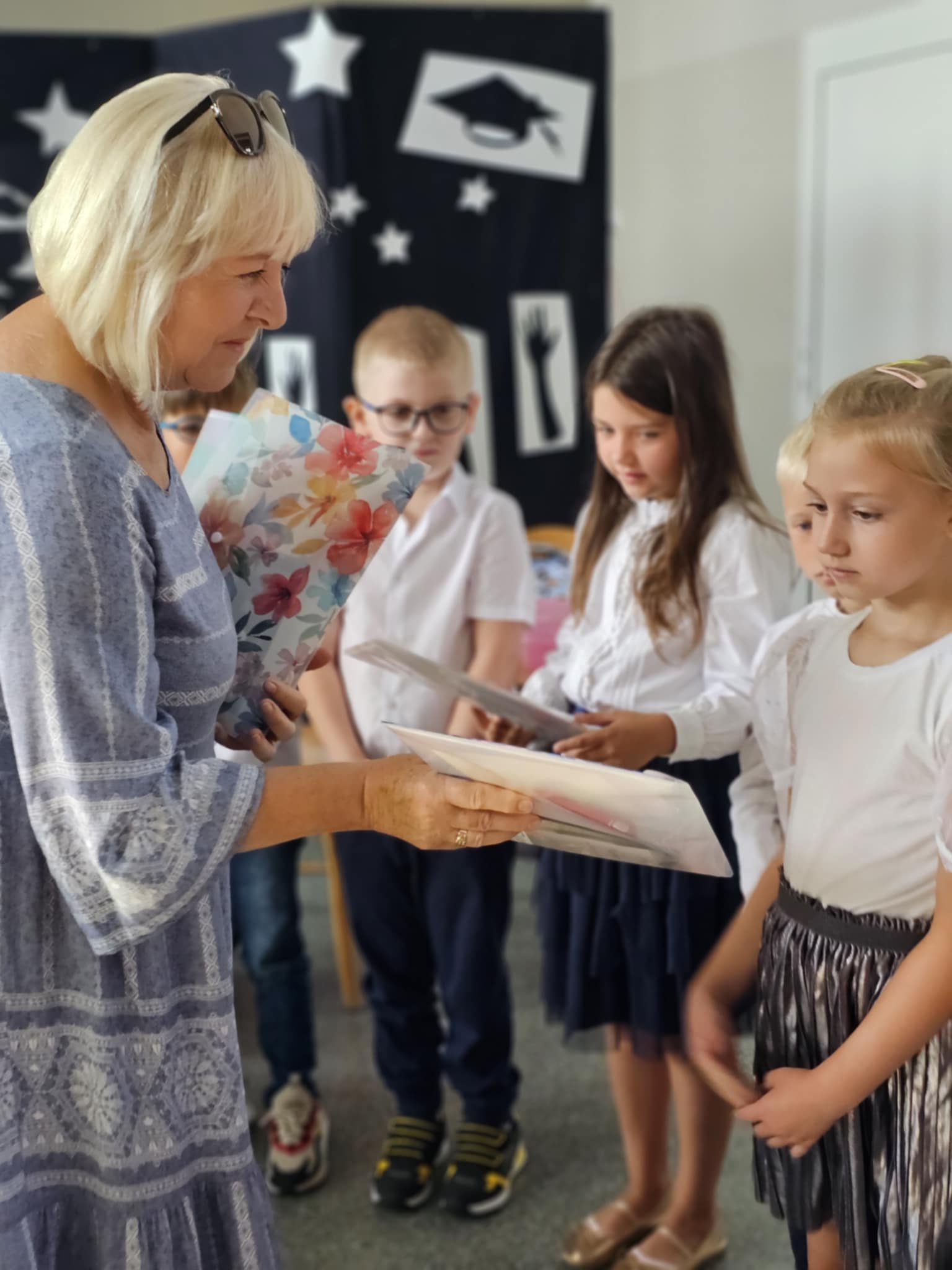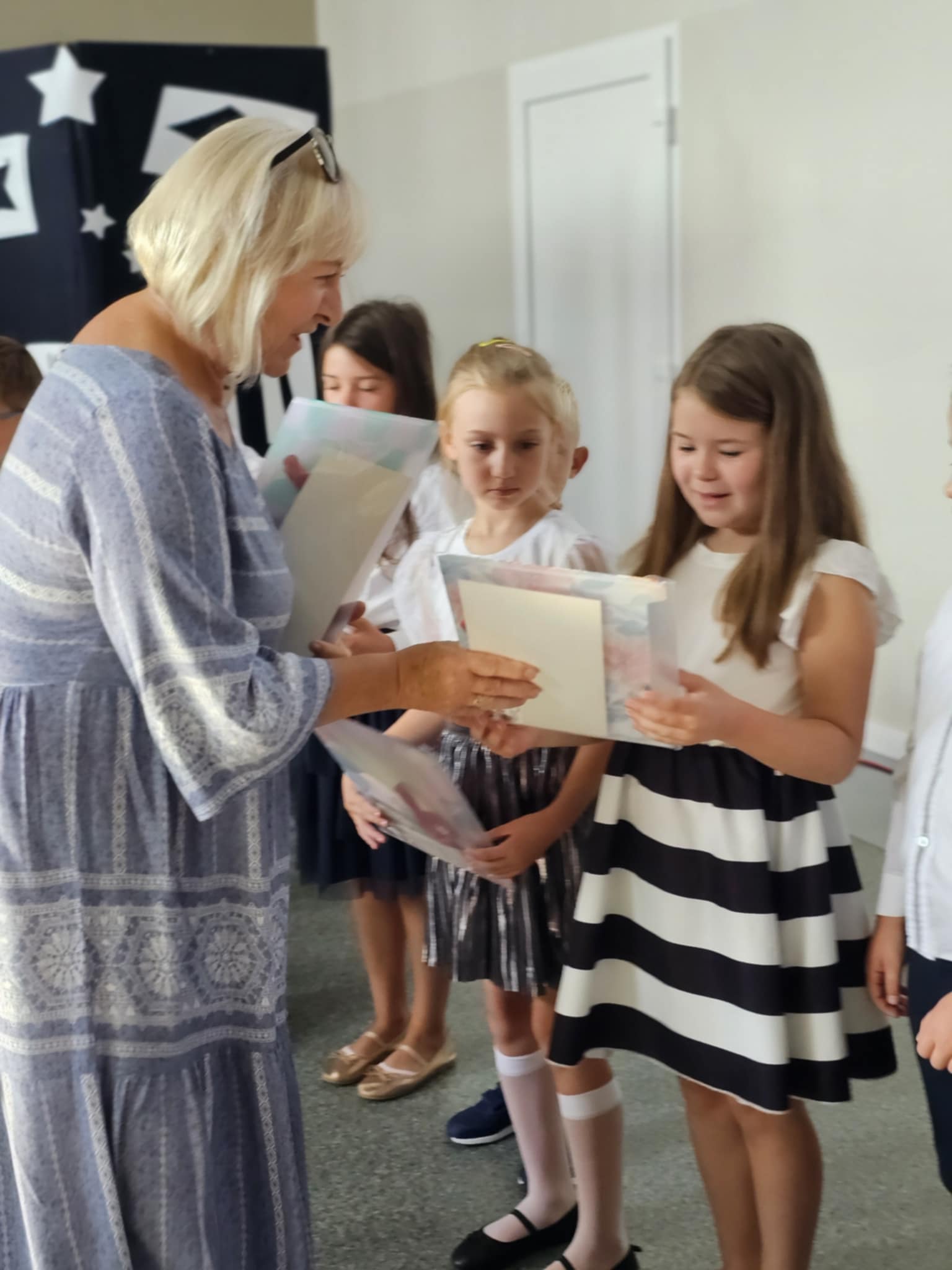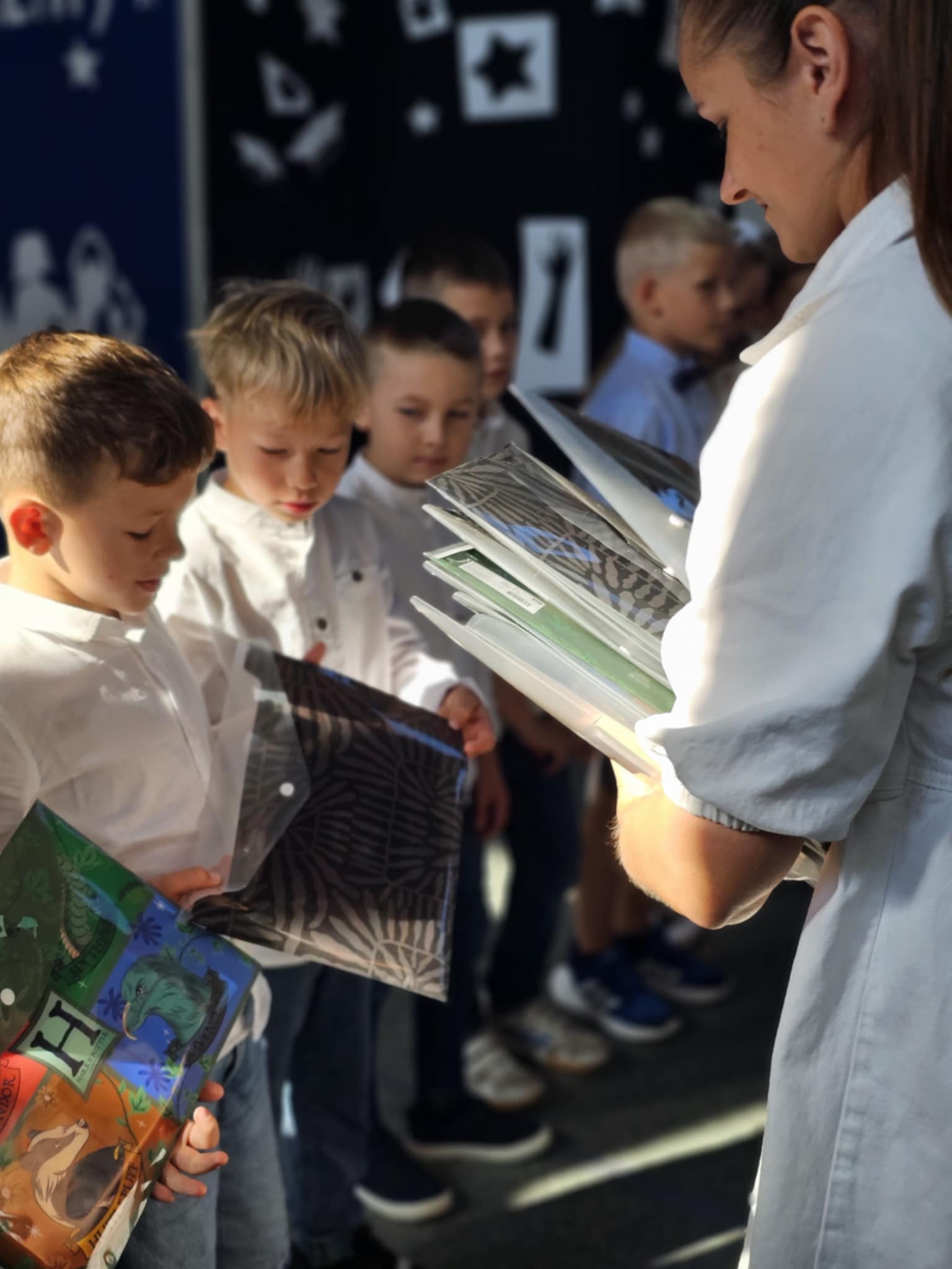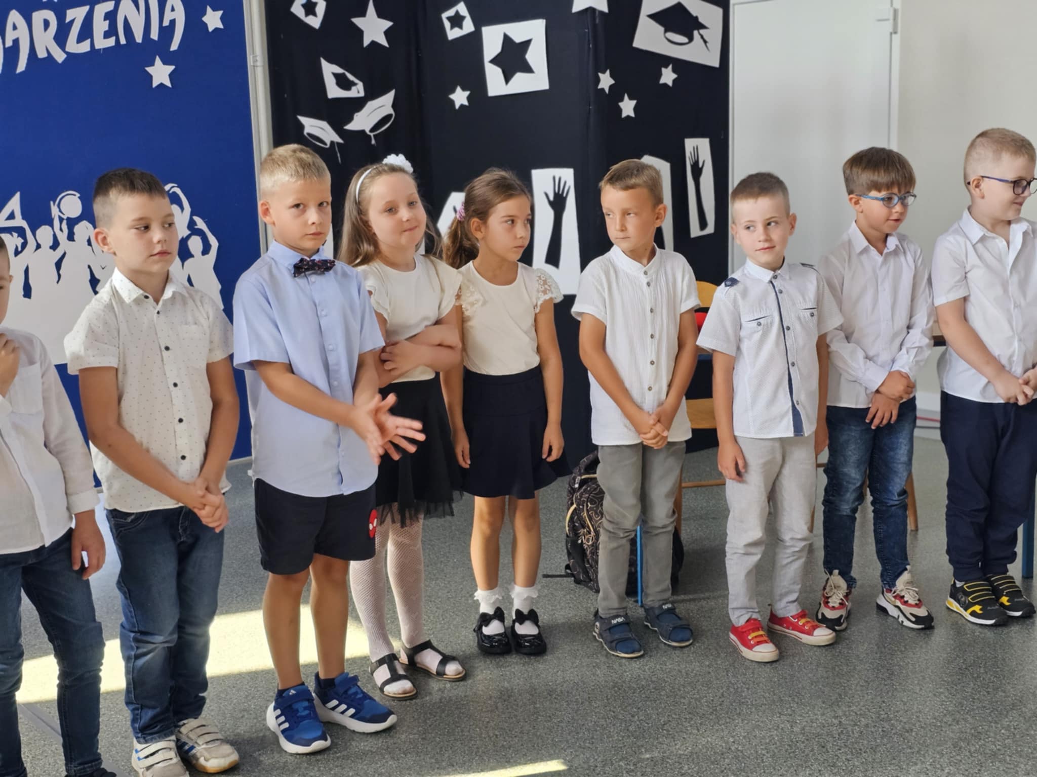 Podczas akademii swój pierwszy występ zaliczyli również nasi najmłodsi pierwszoklasisści; dzielnie wyszli na środek sali, uścisnęli dłoń z panem dyrektorem i z przyjemnością odebrali drobne upominki od Rady Rodziców.