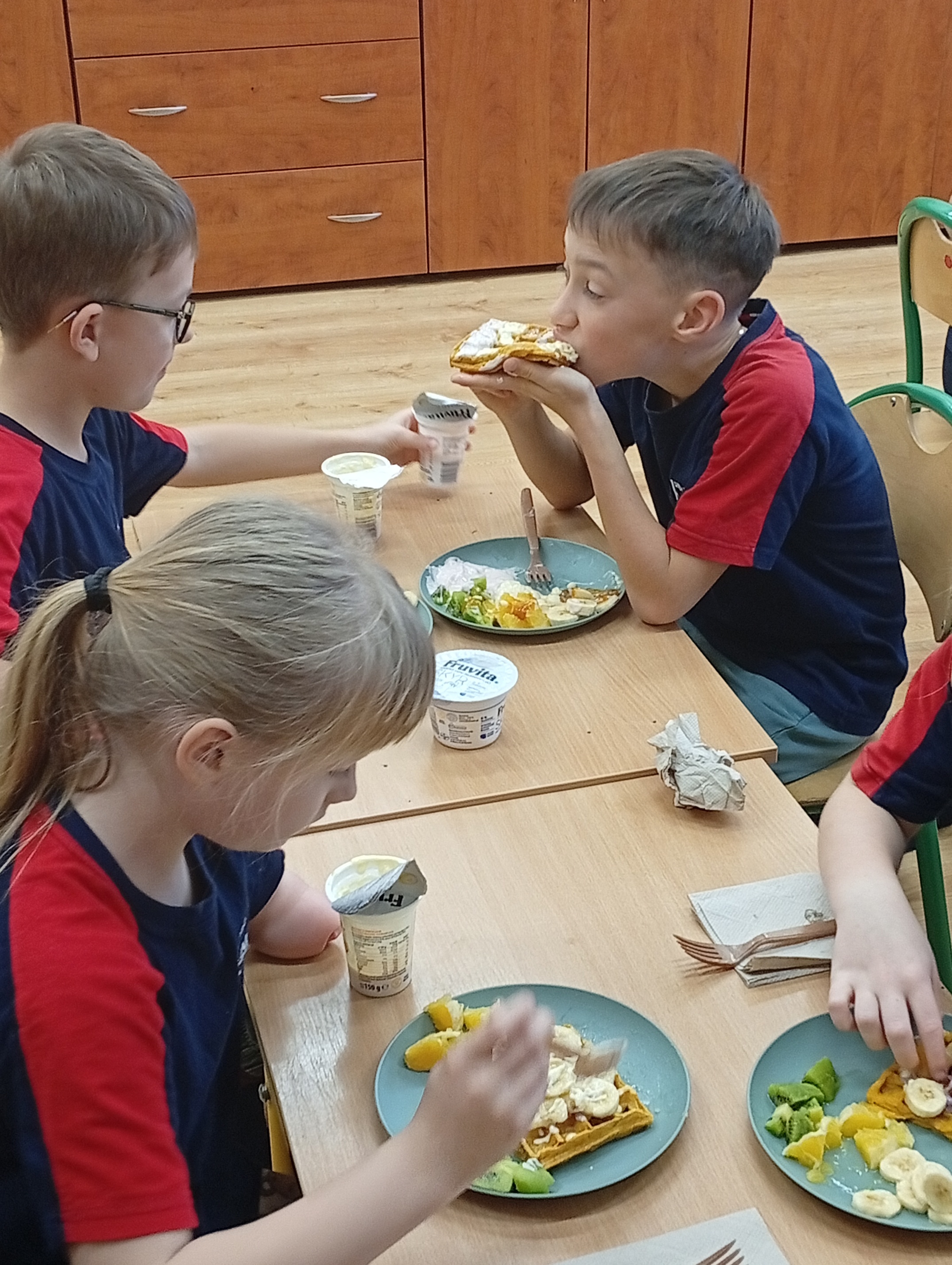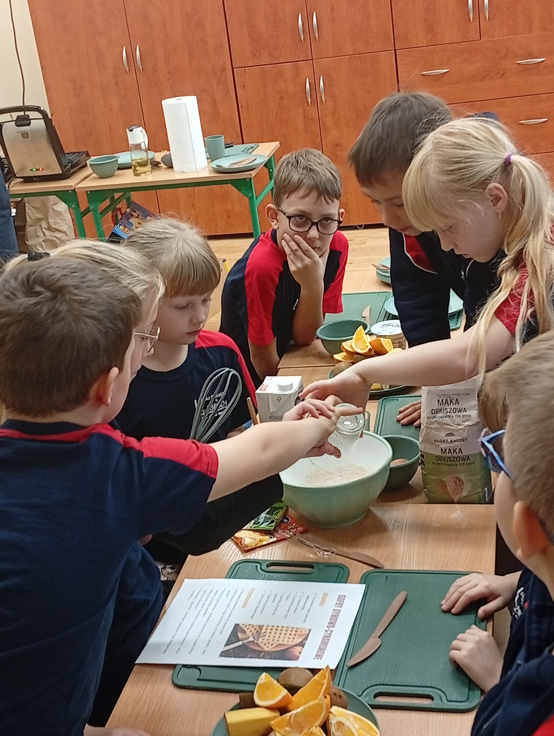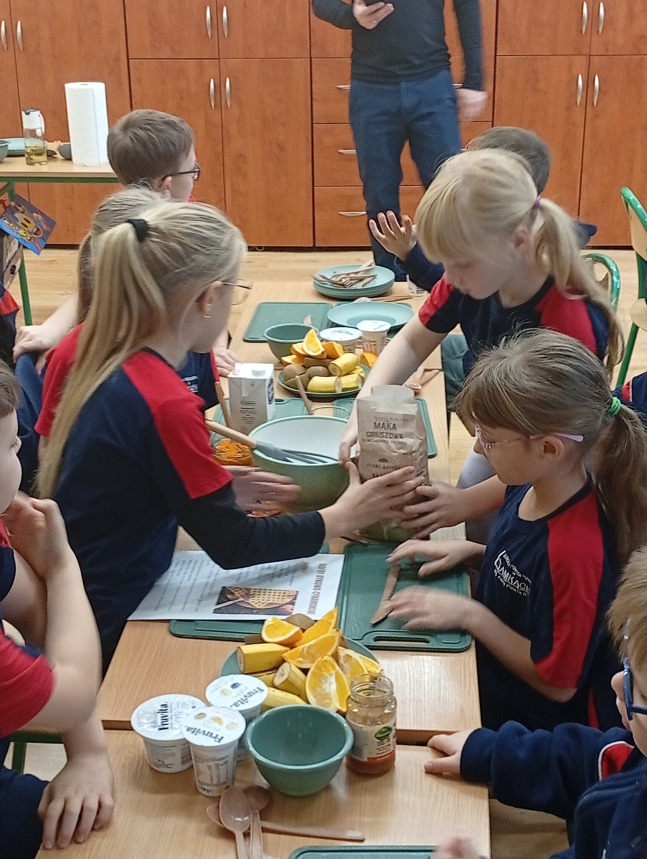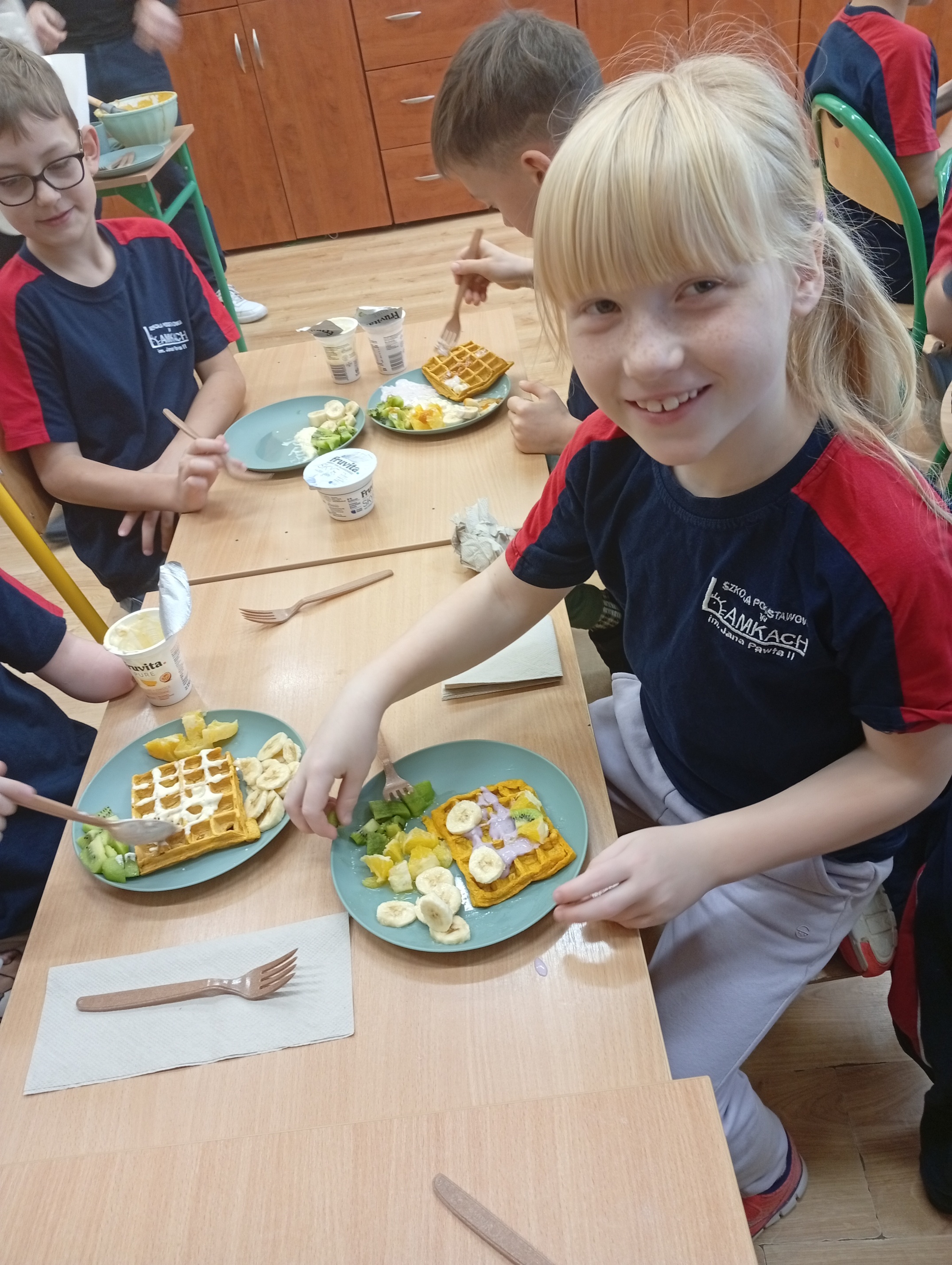 Zajęcia rozpoczęły się krótką prezentacją dotyczącą podstaw zdrowej diety. Uczniowie poznali zasady komponowania zbilansowanych posiłków, rolę witamin i minerałów oraz znaczenie regularności w jedzeniu. Dietetyk w przystępny i ciekawy sposób tłumaczyła, dlaczego warto ograniczać produkty wysoko przetworzone i jak proste zmiany w codziennym jadłospisie mogą wpłynąć na samopoczucie oraz energię do nauki.  Omówiła też znaczenie picia wody i ograniczania słodyczy. Dzieci dowiedziały się, jakie przekąski są dobrym wyborem do szkoły. Udzielała wskazówek i odpowiadała na liczne pytania, pokazując, że zdrowe odżywianie może być proste, smaczne i różnorodne. Po części teoretycznej dzieci, przystąpiły do części praktycznej, samodzielnego przygotowania ciasta na aromatyczne gofry dyniowe. Po upieczeniu, dekorowały je owocami oraz bezcukrowym jogurtem lub dżemem. Kolejnym etapem była degustacja zdrowych przekąsek. Warsztaty były doskonałą okazją do łączenia wiedzy żywieniowej z praktycznymi umiejętnościami kulinarnymi. Uczniowie wyszli z zajęć z nową dawką inspiracji oraz przepisem na pyszne, jesienne i zdrowe gofry.