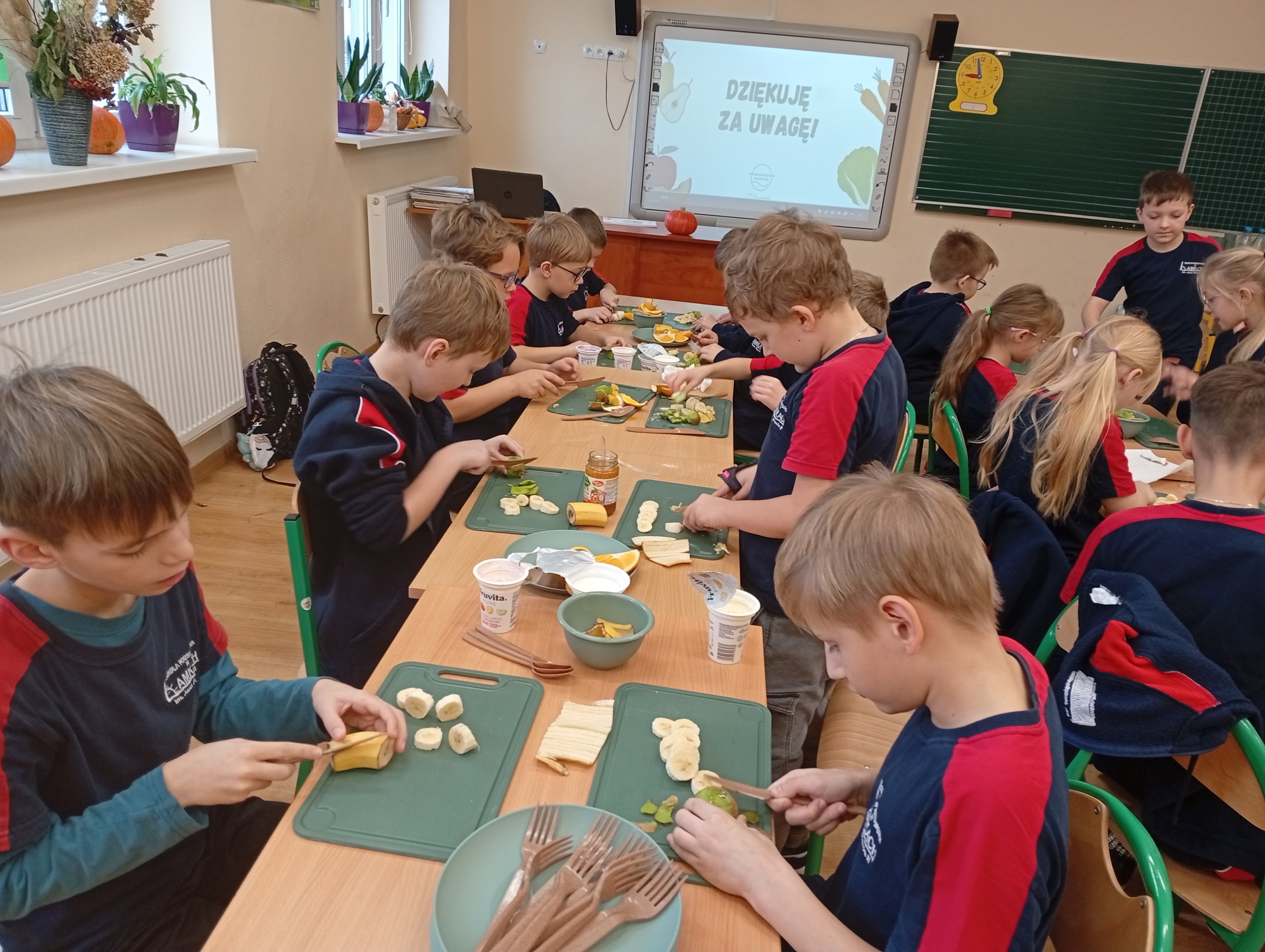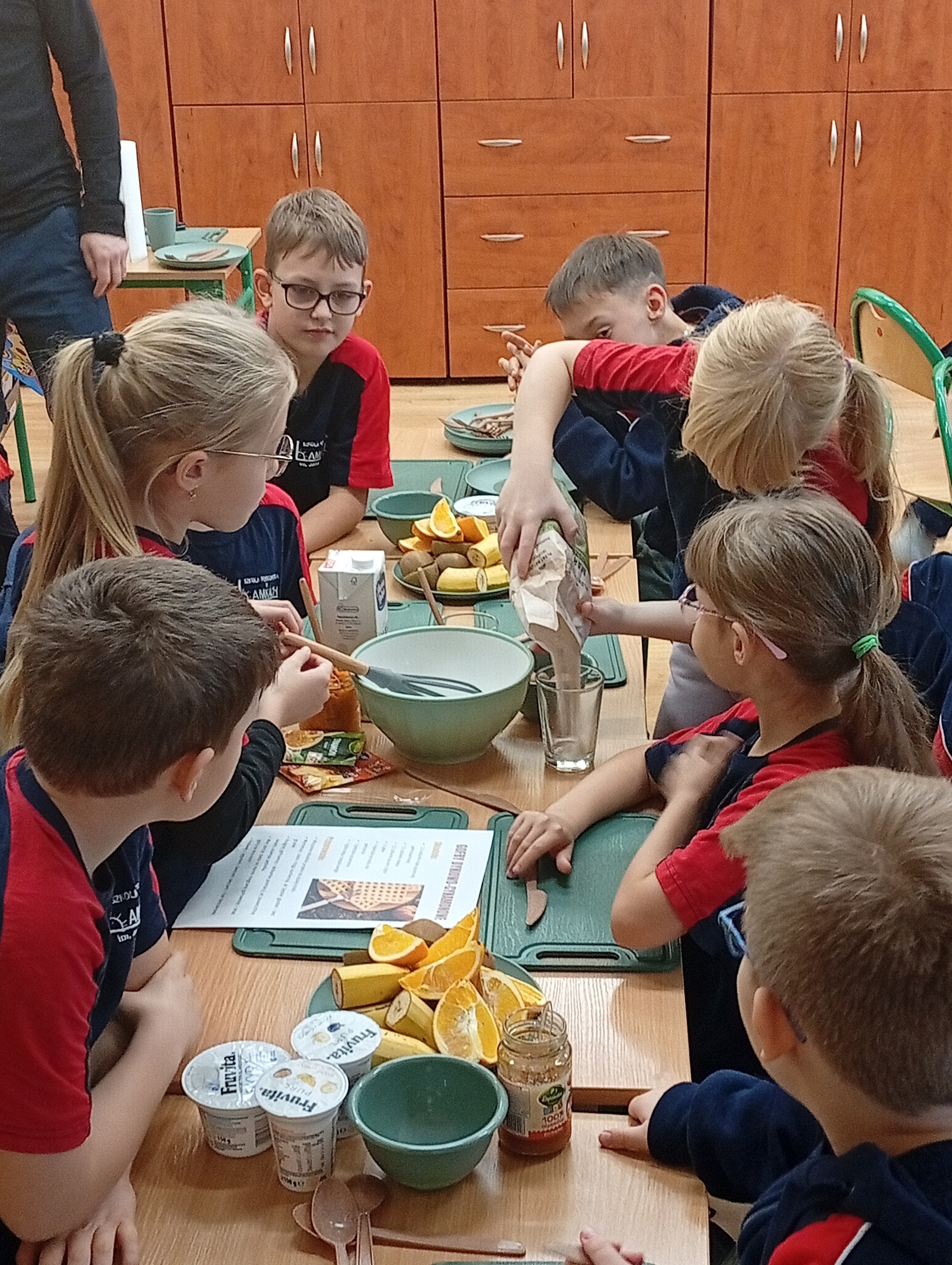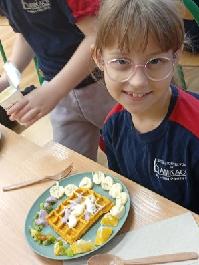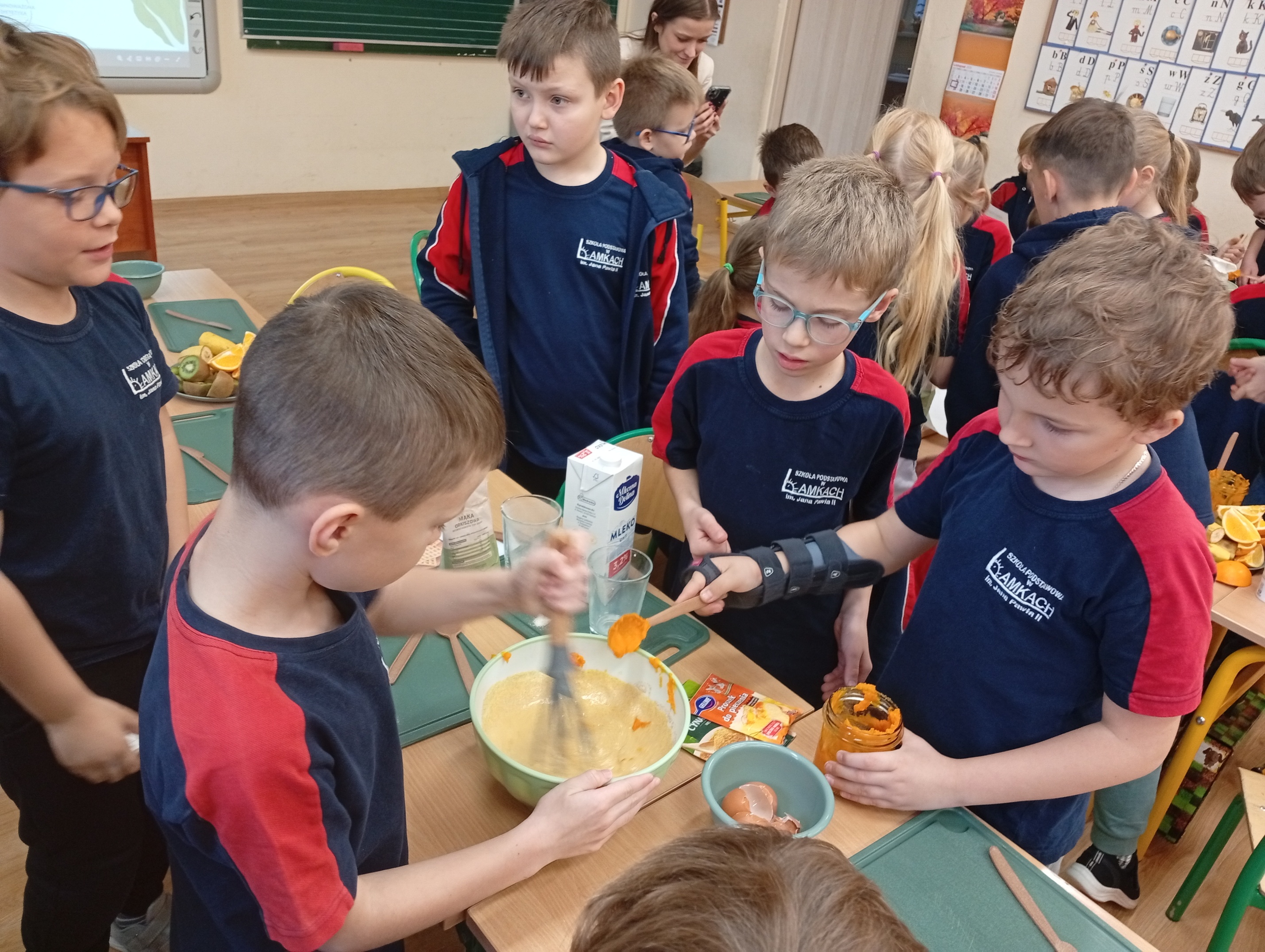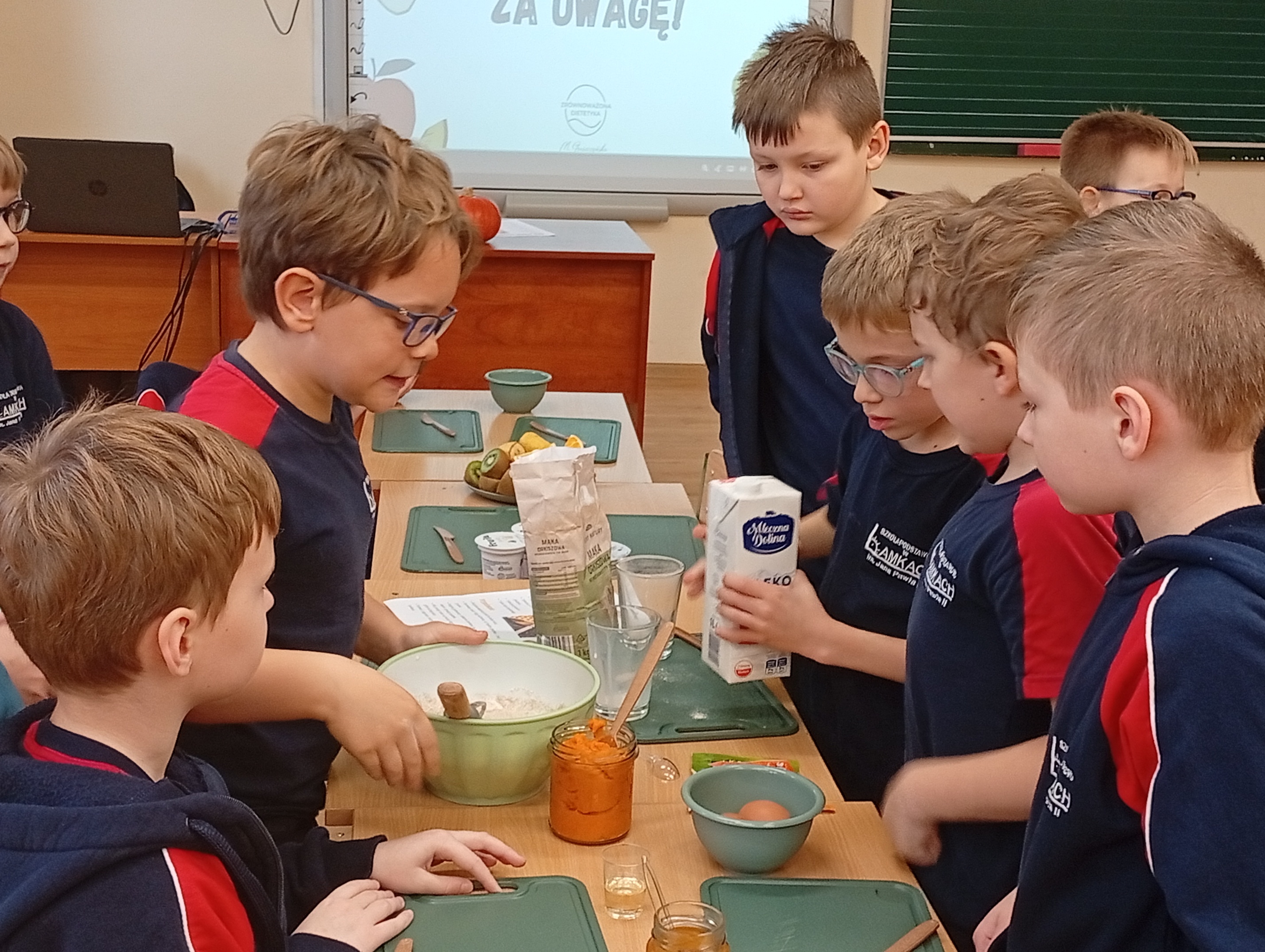 Zajęcia rozpoczęły się krótką prezentacją dotyczącą podstaw zdrowej diety. Uczniowie poznali zasady komponowania zbilansowanych posiłków, rolę witamin i minerałów oraz znaczenie regularności w jedzeniu. Dietetyk w przystępny i ciekawy sposób tłumaczyła, dlaczego warto ograniczać produkty wysoko przetworzone i jak proste zmiany w codziennym jadłospisie mogą wpłynąć na samopoczucie oraz energię do nauki.  Omówiła też znaczenie picia wody i ograniczania słodyczy. Dzieci dowiedziały się, jakie przekąski są dobrym wyborem do szkoły. Udzielała wskazówek i odpowiadała na liczne pytania, pokazując, że zdrowe odżywianie może być proste, smaczne i różnorodne. Po części teoretycznej dzieci, przystąpiły do części praktycznej, samodzielnego przygotowania ciasta na aromatyczne gofry dyniowe. Po upieczeniu, dekorowały je owocami oraz bezcukrowym jogurtem lub dżemem. Kolejnym etapem była degustacja zdrowych przekąsek. Warsztaty były doskonałą okazją do łączenia wiedzy żywieniowej z praktycznymi umiejętnościami kulinarnymi. Uczniowie wyszli z zajęć z nową dawką inspiracji oraz przepisem na pyszne, jesienne i zdrowe gofry.