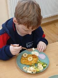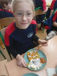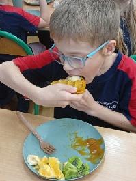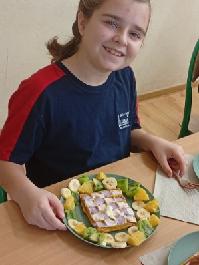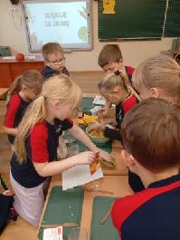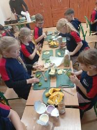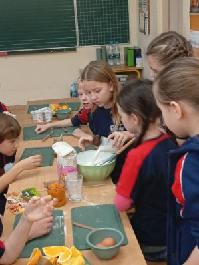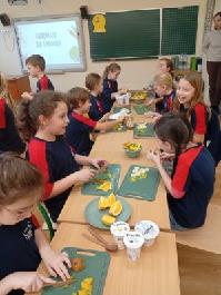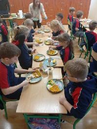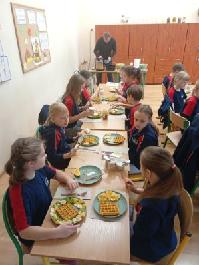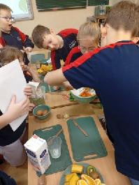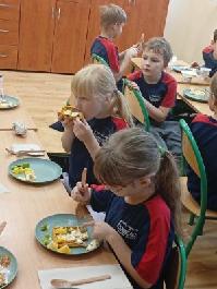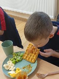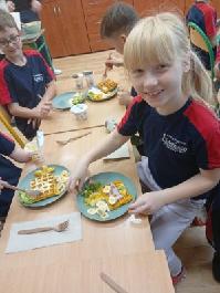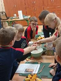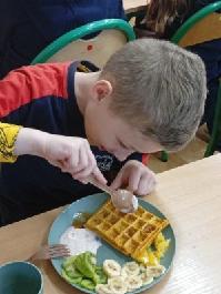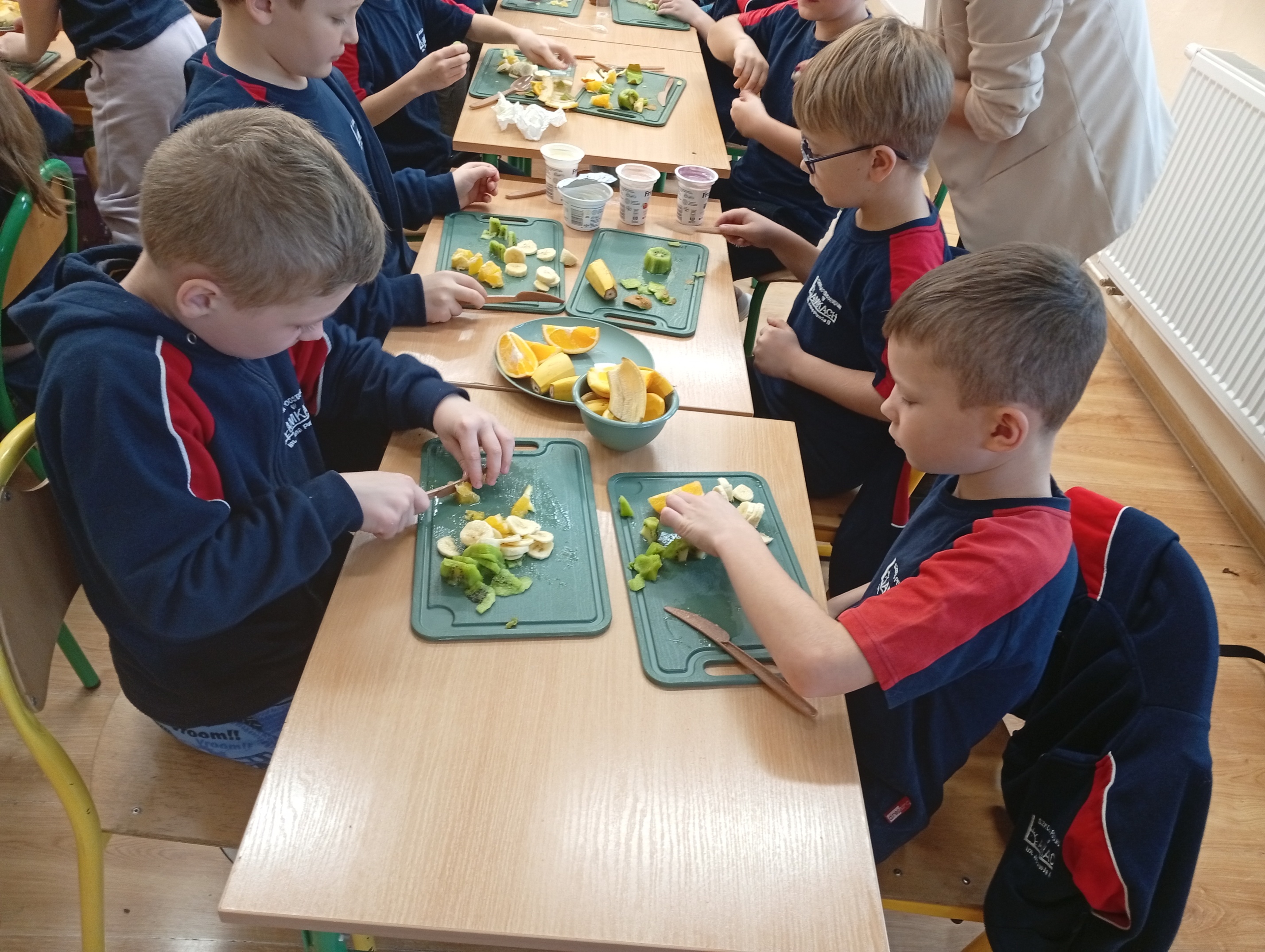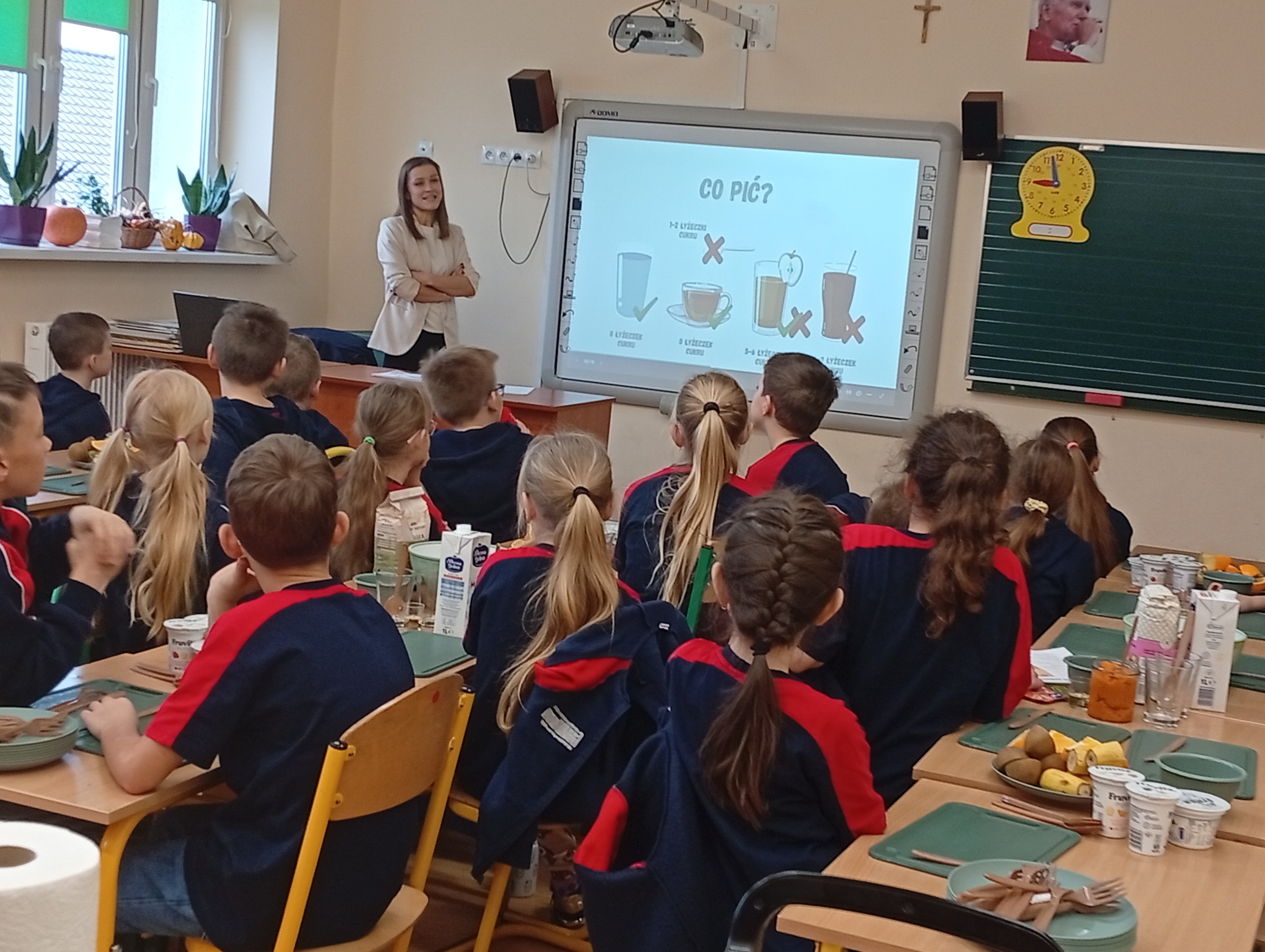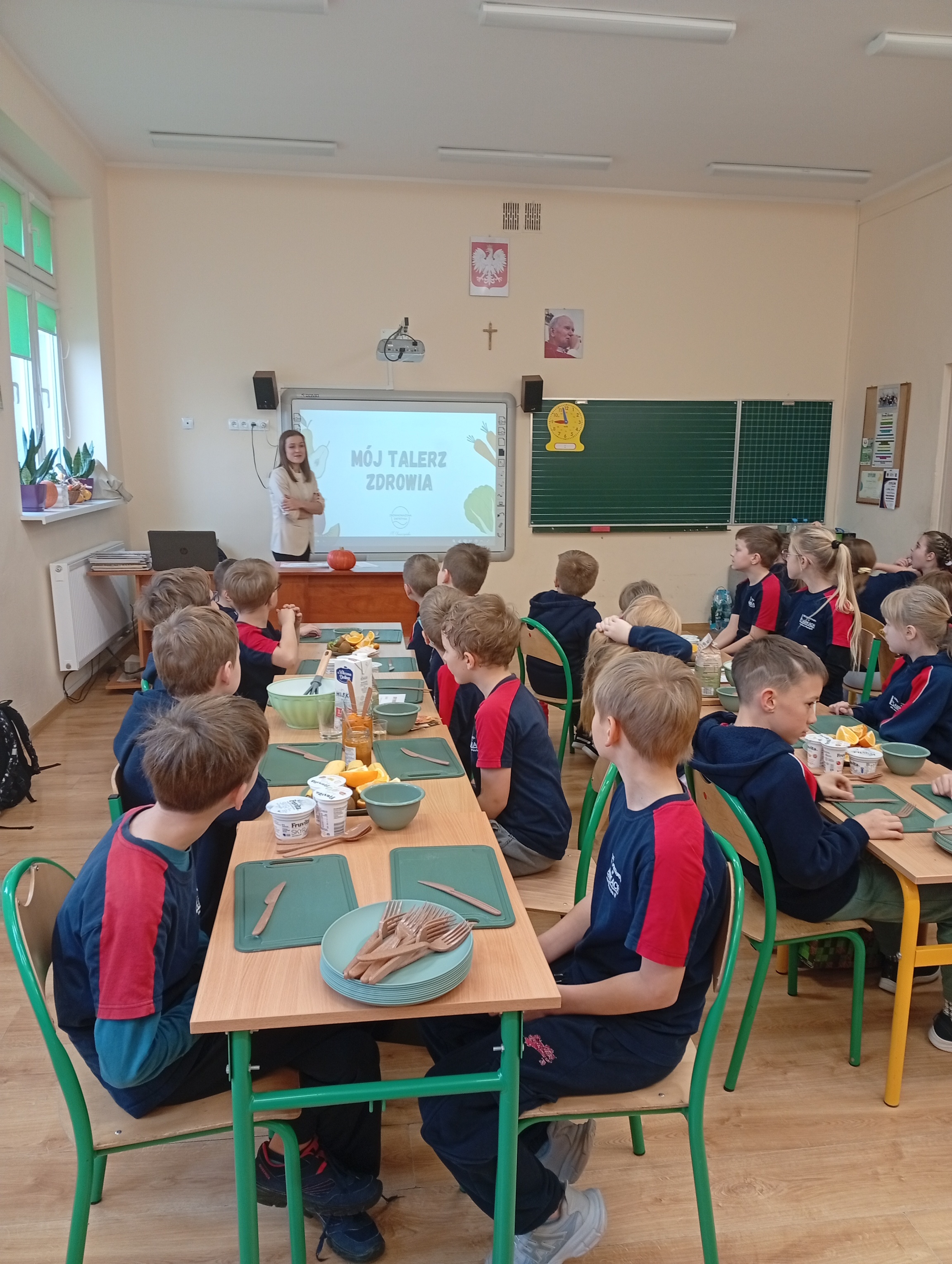 Zajęcia rozpoczęły się krótką prezentacją dotyczącą podstaw zdrowej diety. Uczniowie poznali zasady komponowania zbilansowanych posiłków, rolę witamin i minerałów oraz znaczenie regularności w jedzeniu. Dietetyk w przystępny i ciekawy sposób tłumaczyła, dlaczego warto ograniczać produkty wysoko przetworzone i jak proste zmiany w codziennym jadłospisie mogą wpłynąć na samopoczucie oraz energię do nauki.  Omówiła też znaczenie picia wody i ograniczania słodyczy. Dzieci dowiedziały się, jakie przekąski są dobrym wyborem do szkoły. Udzielała wskazówek i odpowiadała na liczne pytania, pokazując, że zdrowe odżywianie może być proste, smaczne i różnorodne. Po części teoretycznej dzieci, przystąpiły do części praktycznej, samodzielnego przygotowania ciasta na aromatyczne gofry dyniowe. Po upieczeniu, dekorowały je owocami oraz bezcukrowym jogurtem lub dżemem. Kolejnym etapem była degustacja zdrowych przekąsek. Warsztaty były doskonałą okazją do łączenia wiedzy żywieniowej z praktycznymi umiejętnościami kulinarnymi. Uczniowie wyszli z zajęć z nową dawką inspiracji oraz przepisem na pyszne, jesienne i zdrowe gofry.