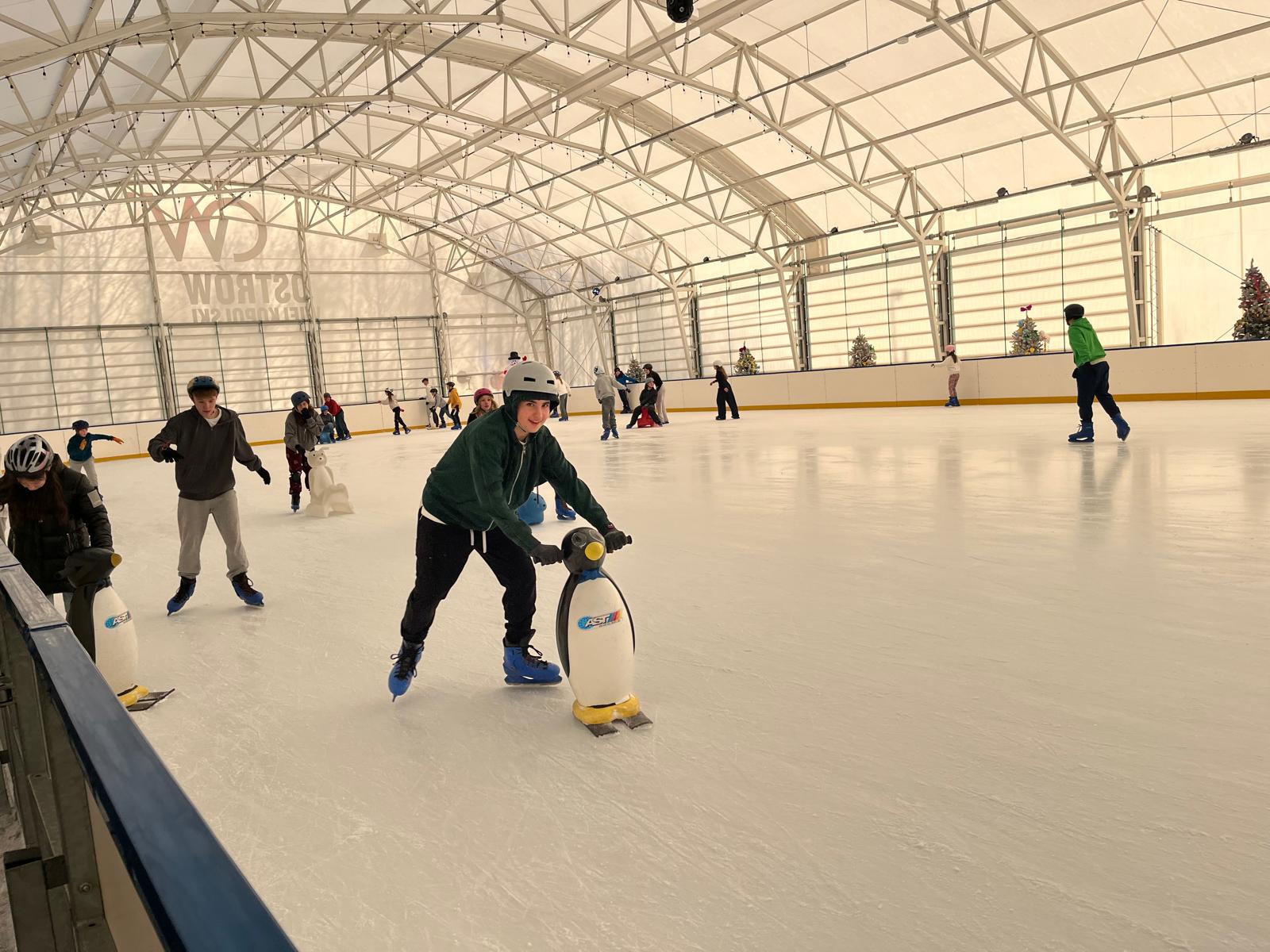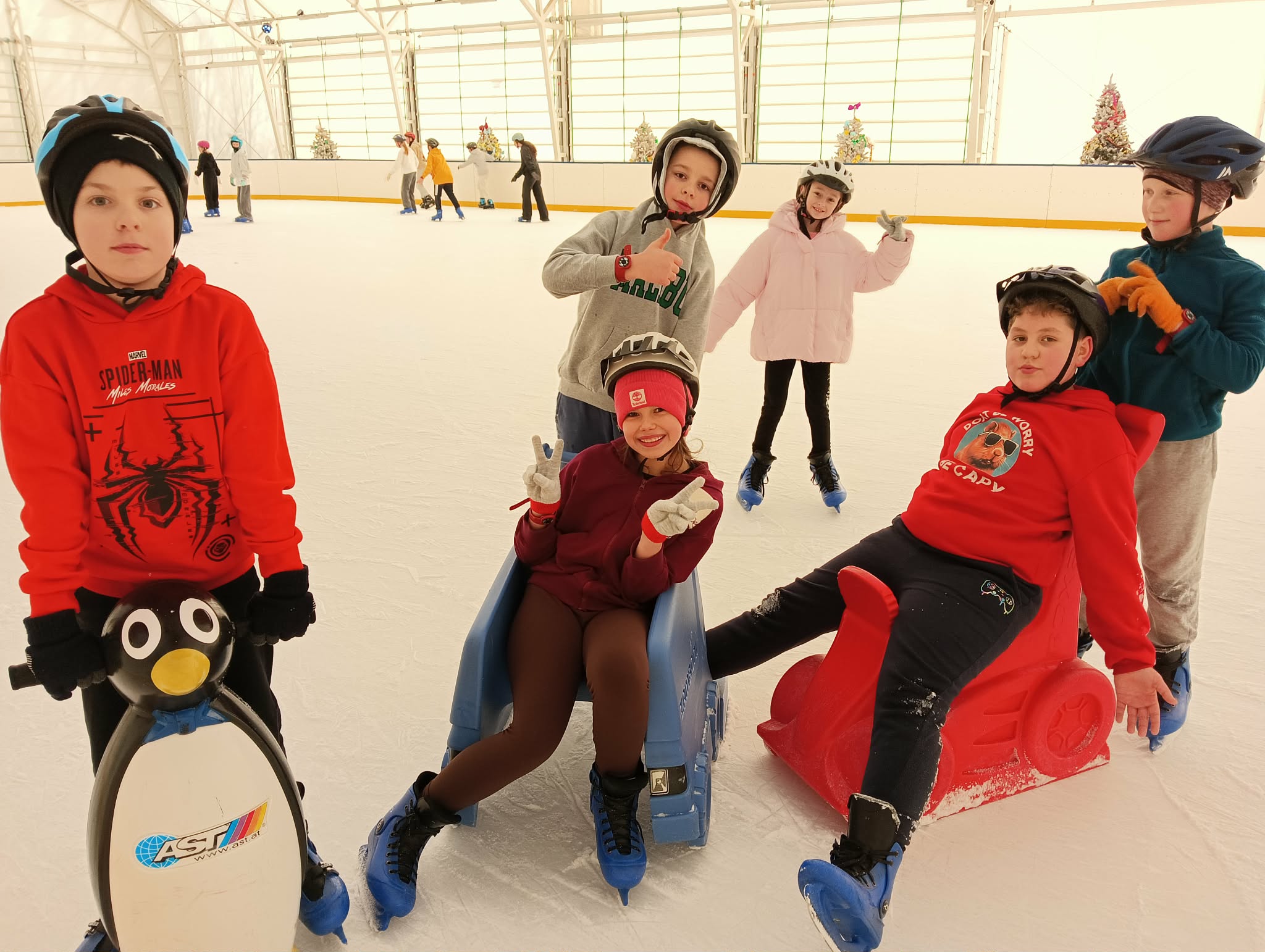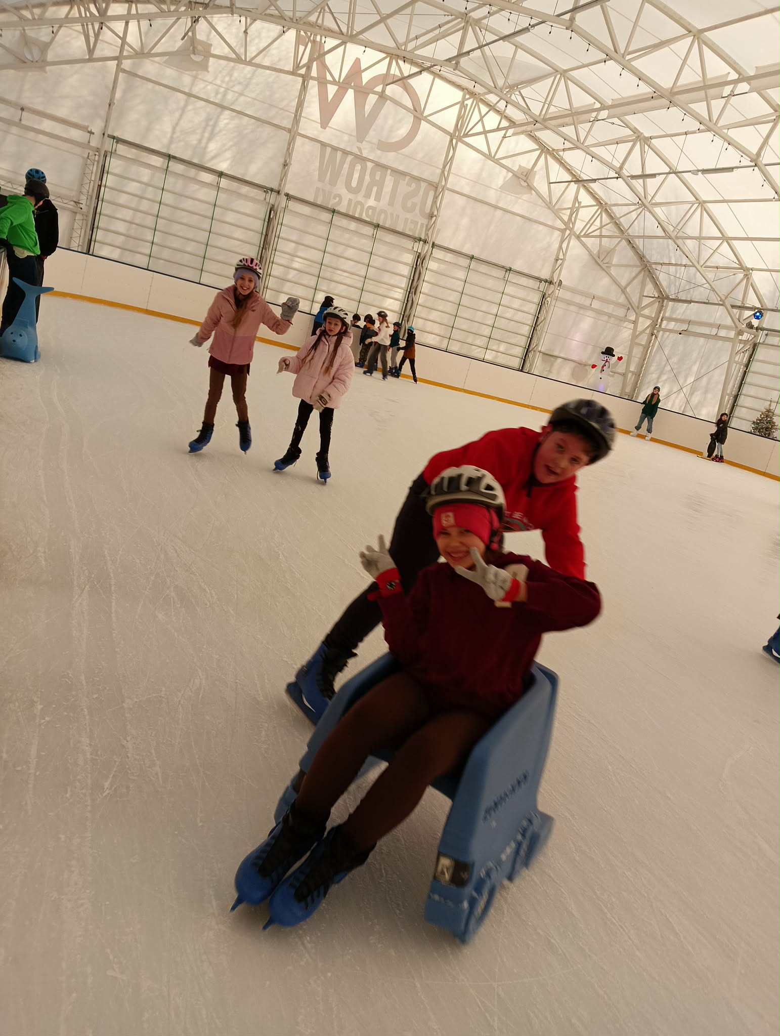 z pingwinków oraz innych podpórek, które ułatwiały naukę jazdy i dodawały pewności siebie. Dzięki temu każdy mógł poczuć się bezpiecznie i komfortowo, a pierwsze próby jazdy szybko zamieniały się w coraz śmielsze przejazdy. Doświadczeni łyżwiarze z entuzjazmem doskonalili swoje umiejętności, jeżdżąc samodzielnie i pomagając mniej wprawnym kolegom. Na lodowisku panowała wesoła, przyjazna atmosfera, a uśmiechy nie znikały z twarzy uczestników.