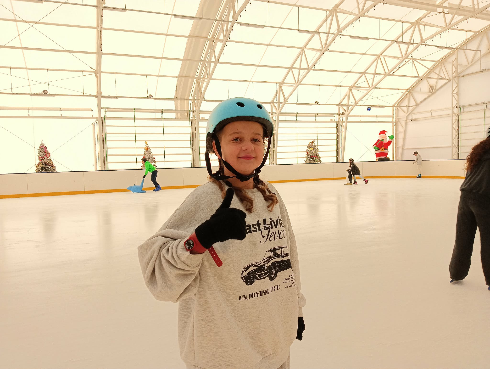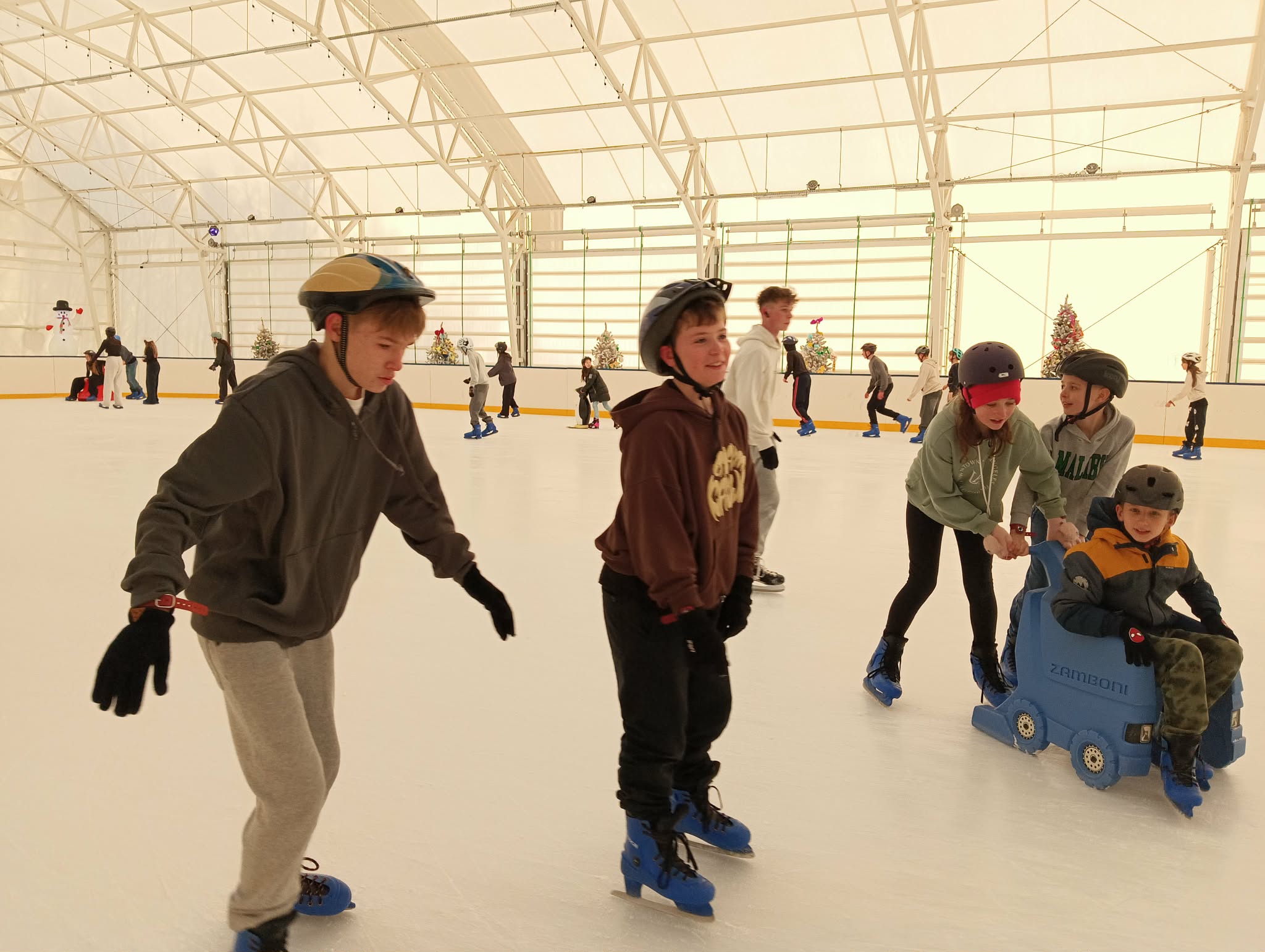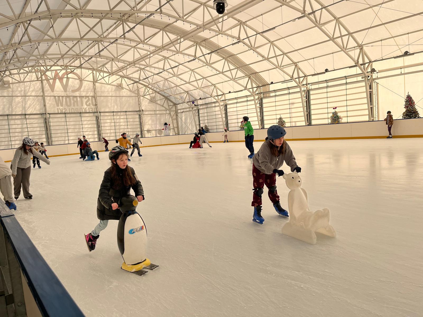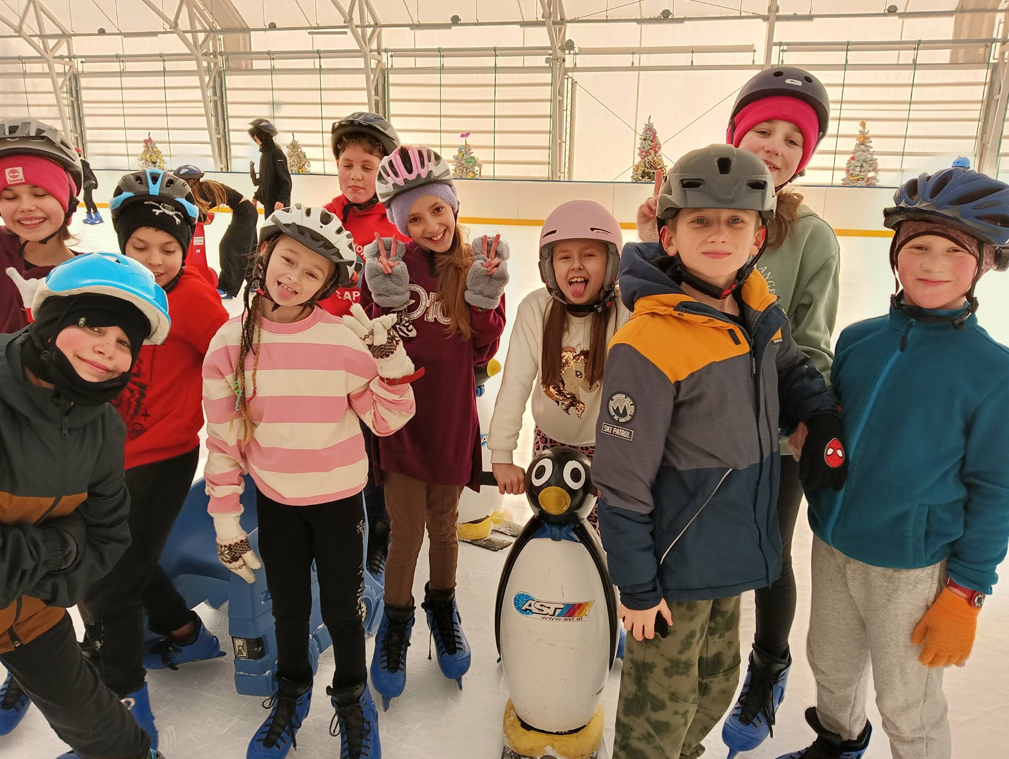 z pingwinków oraz innych podpórek, które ułatwiały naukę jazdy i dodawały pewności siebie. Dzięki temu każdy mógł poczuć się bezpiecznie i komfortowo, a pierwsze próby jazdy szybko zamieniały się w coraz śmielsze przejazdy. Doświadczeni łyżwiarze z entuzjazmem doskonalili swoje umiejętności, jeżdżąc samodzielnie i pomagając mniej wprawnym kolegom. Na lodowisku panowała wesoła, przyjazna atmosfera, a uśmiechy nie znikały z twarzy uczestników.